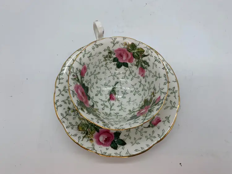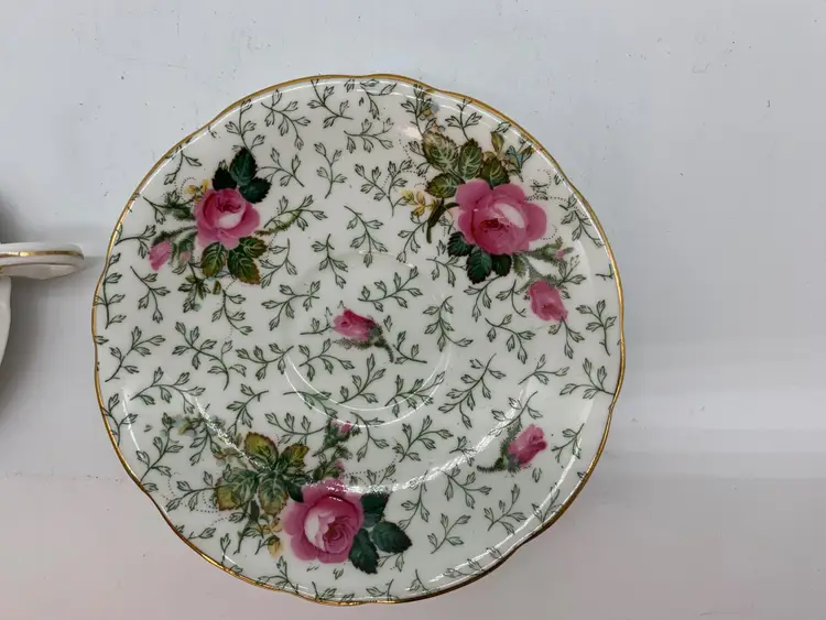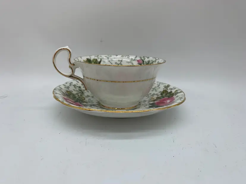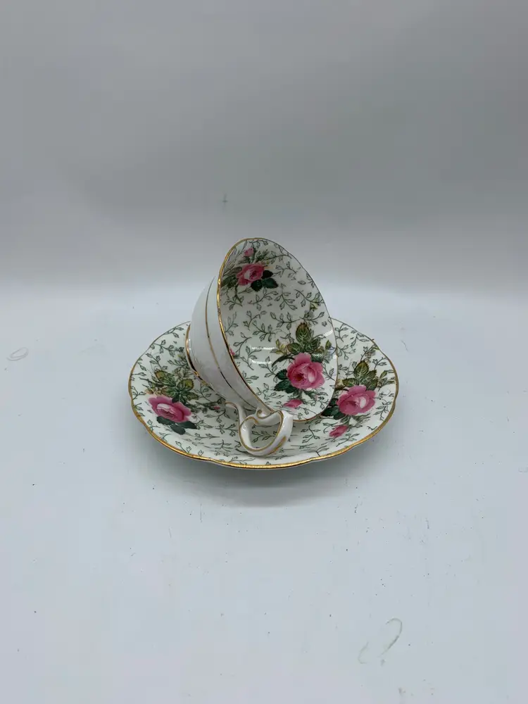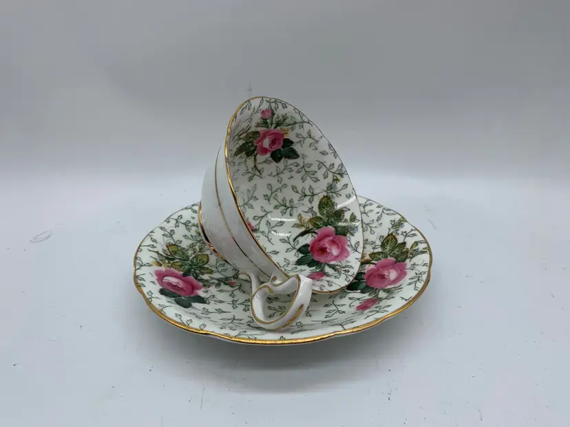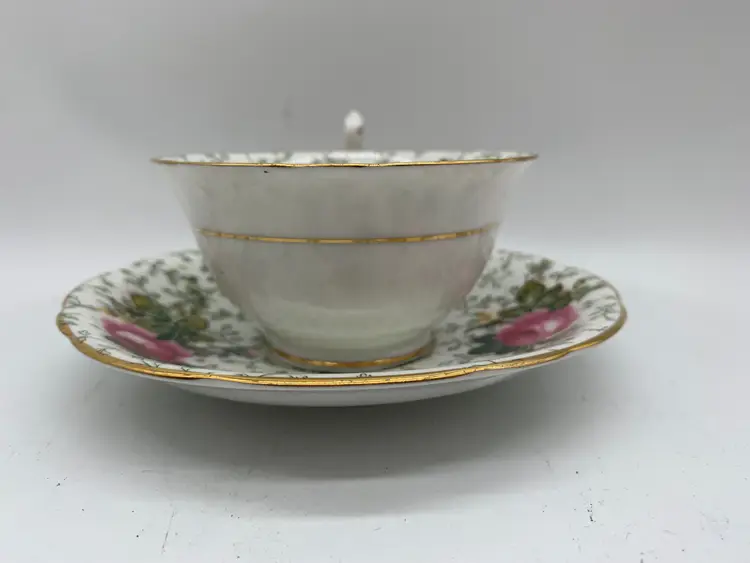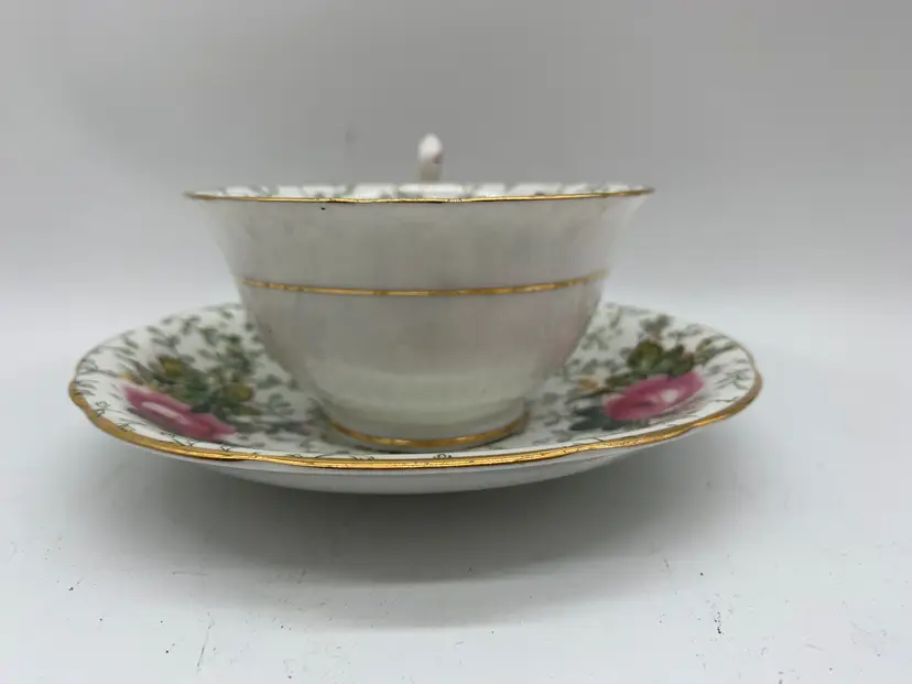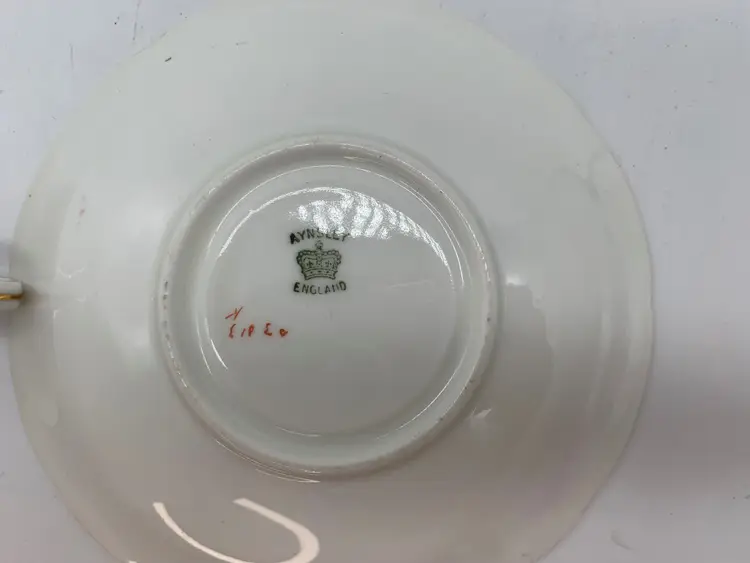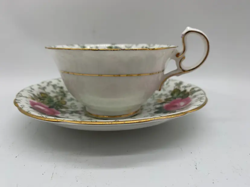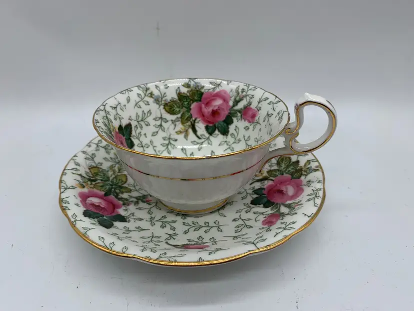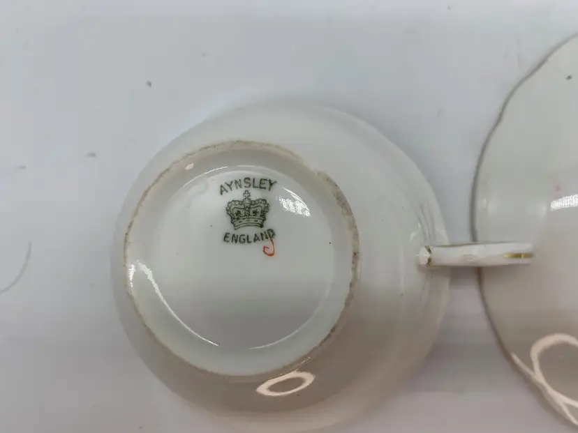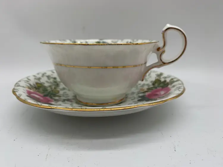 Pretty rose pattern Aynsley bone china cup and saucer are marked on base with stamp dating it from 1942-1956. Made in england, it features deep pink roses on leaf patterned background. Scalloped rim, handle and saucer are gilt edged. Pristine condition, no dark spots, cracks chips or crazing. Smoke free pet free home.