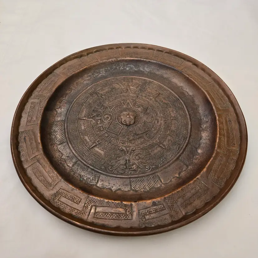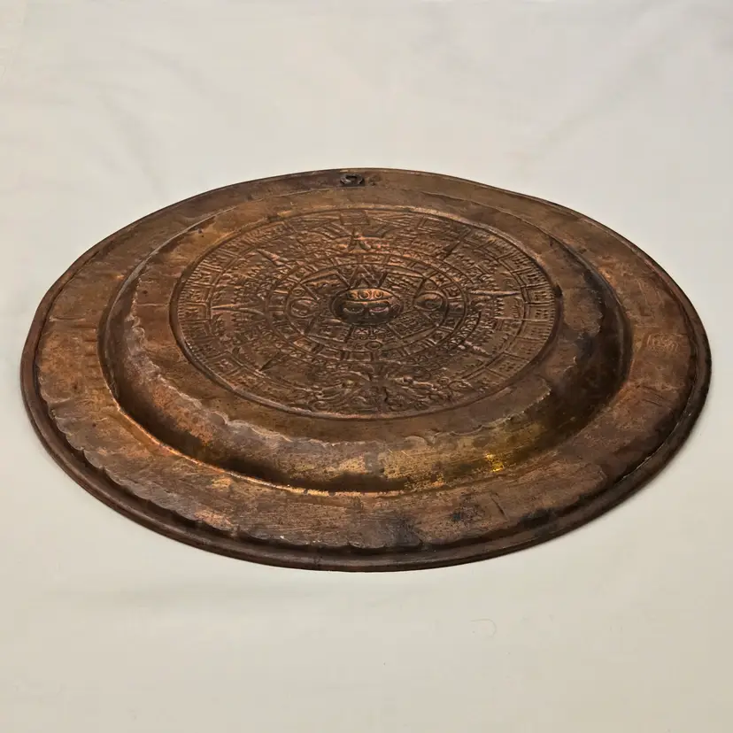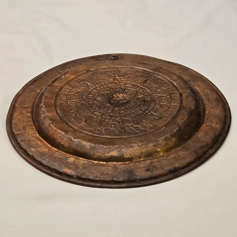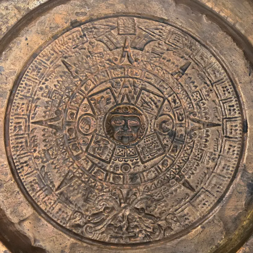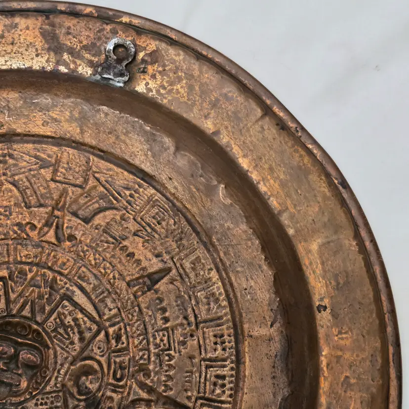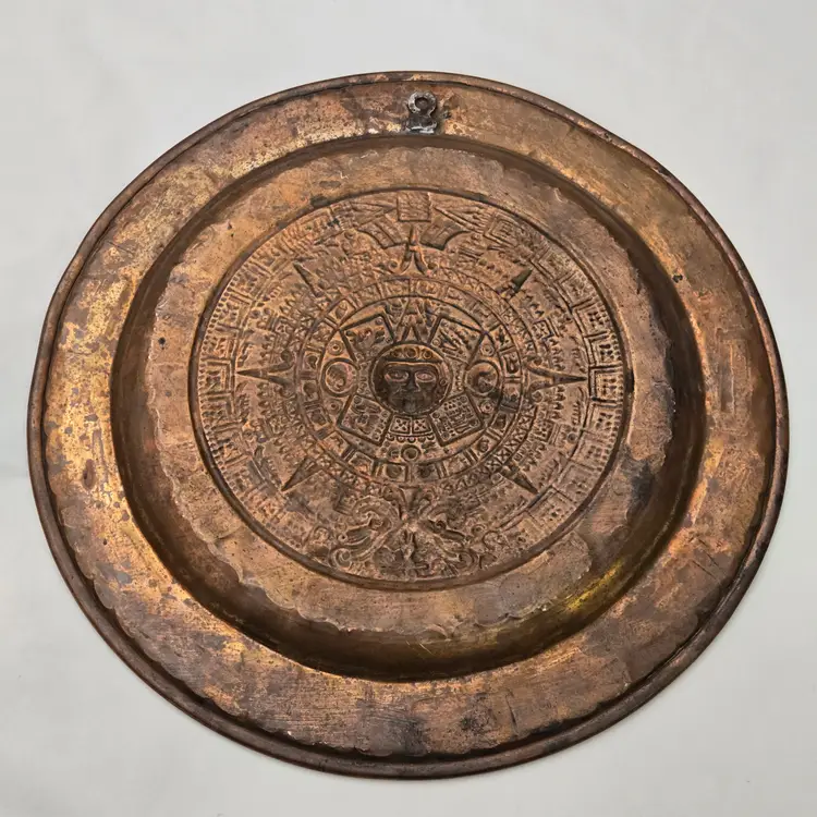 Aztec Sun God Calendar Wall Hanging Plaque Art in Round Embossed Copper Plate 11" Diameter - Tonatiuh God with Condition Issues. Used condition with tarnish, dirt, bends, dents, edgewear, bumps, scuffs, etc. Please view all the photos and please ask any questions prior to purchase when possible.