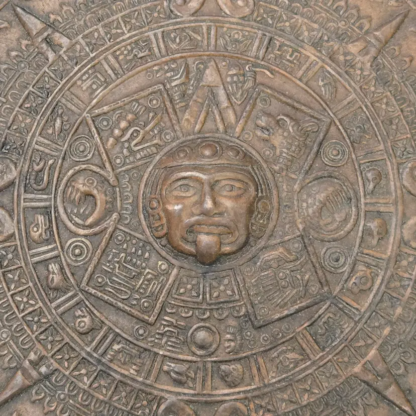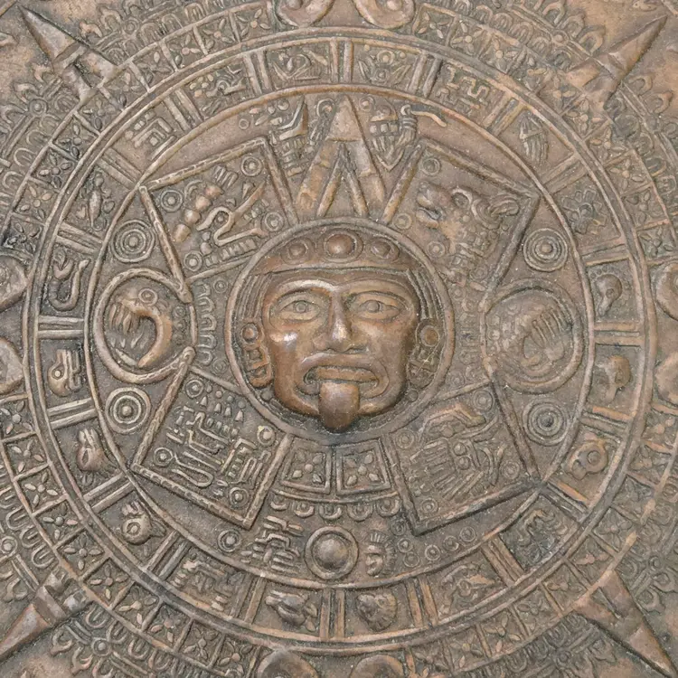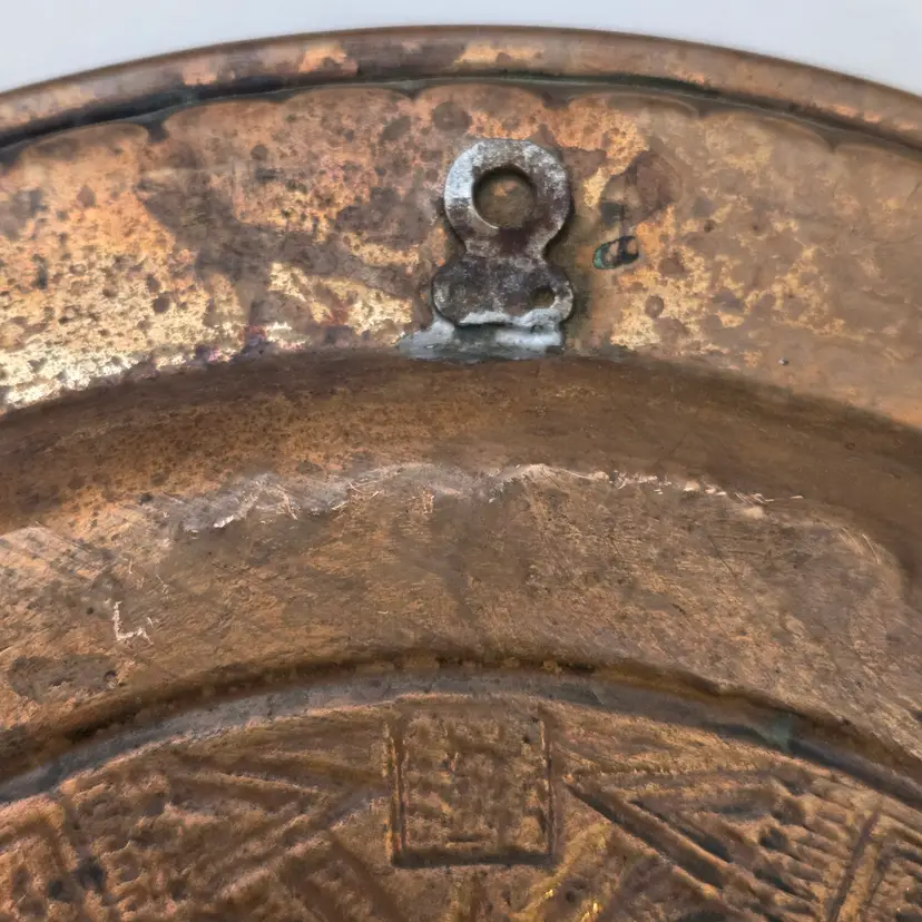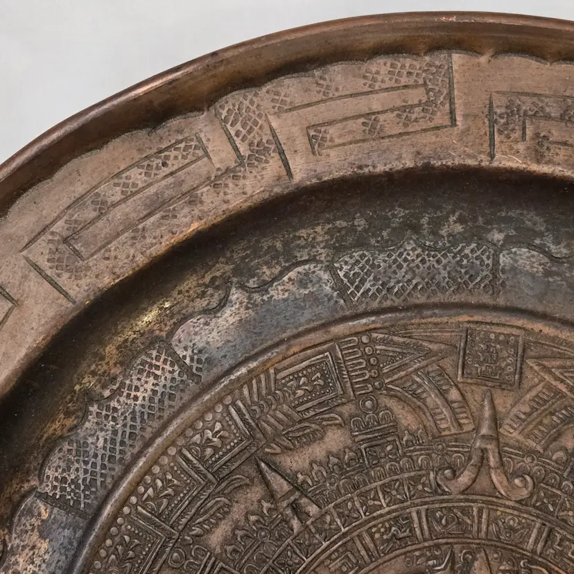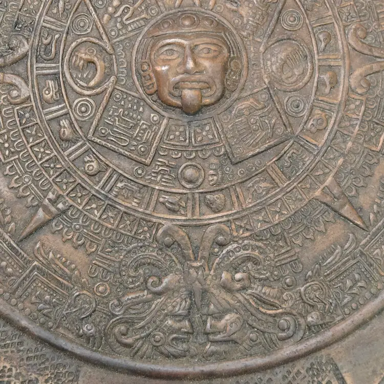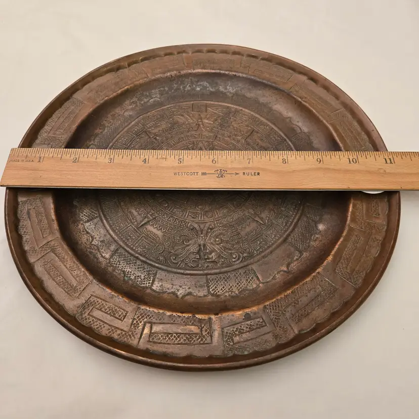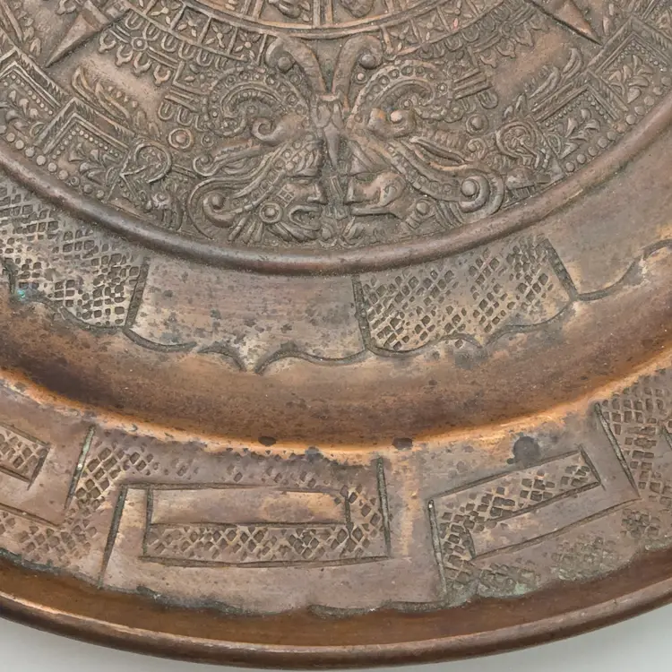 Aztec Sun God Calendar Wall Hanging Plaque Art in Round Embossed Copper Plate 11" Diameter - Tonatiuh God with Condition Issues. Used condition with tarnish, dirt, bends, dents, edgewear, bumps, scuffs, etc. Please view all the photos and please ask any questions prior to purchase when possible.