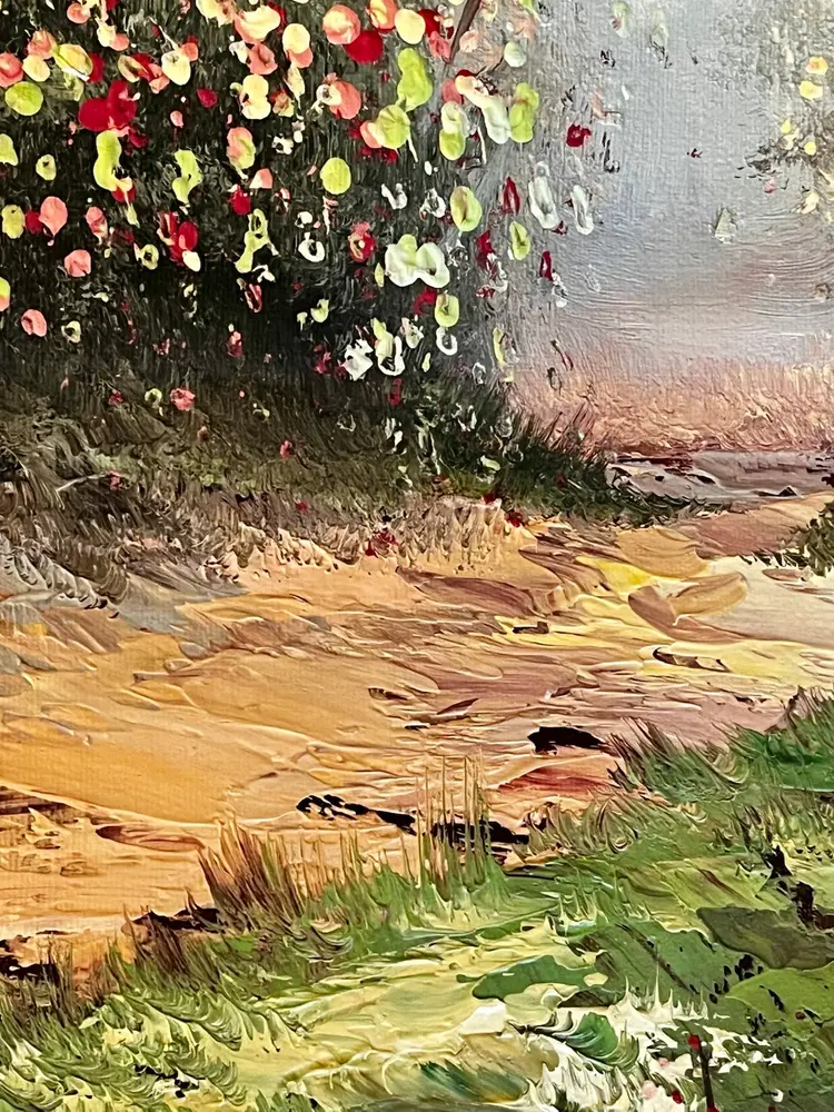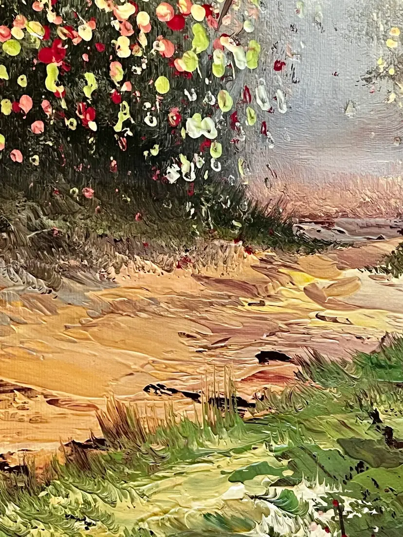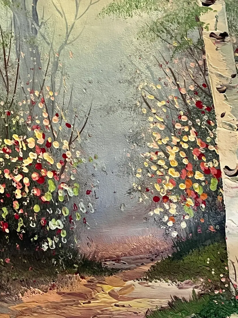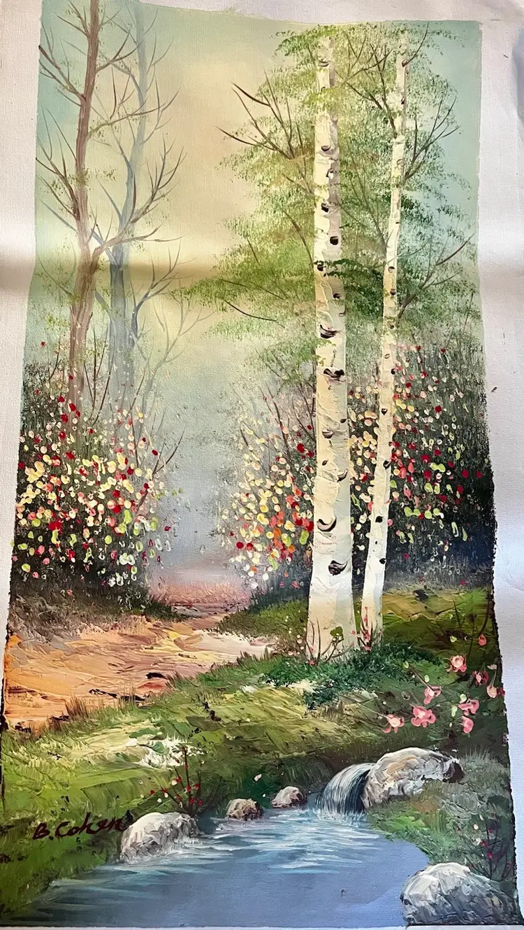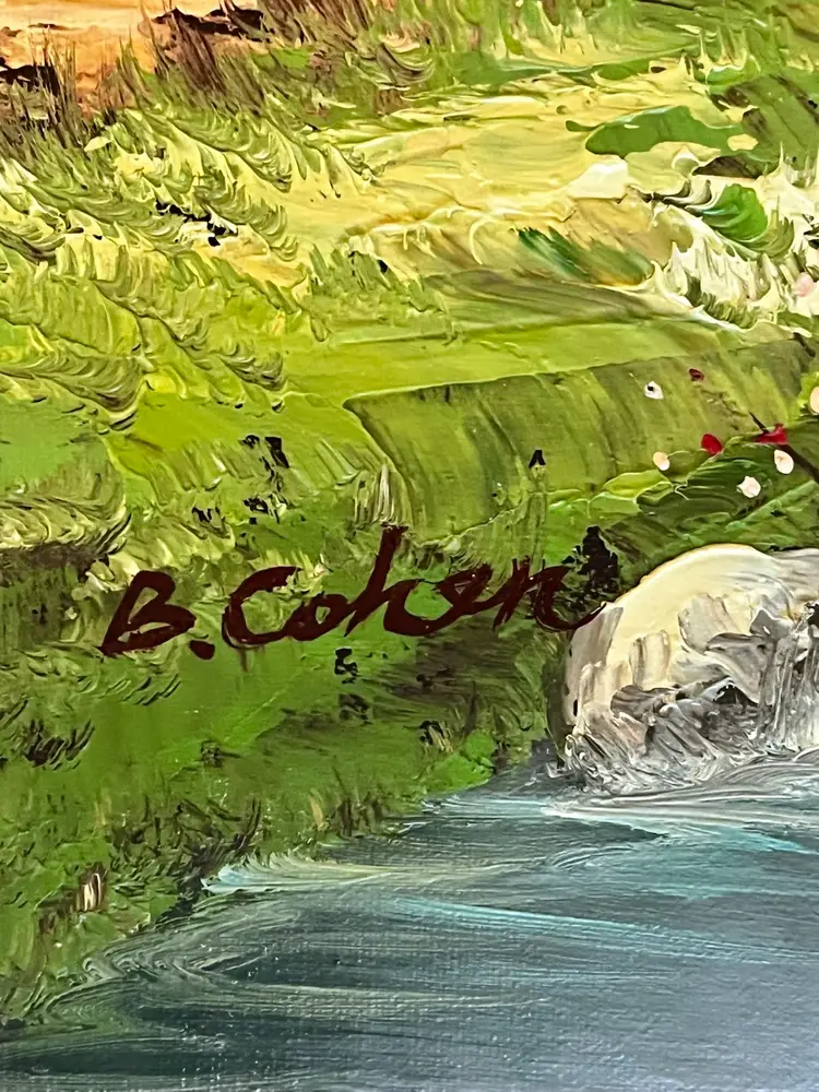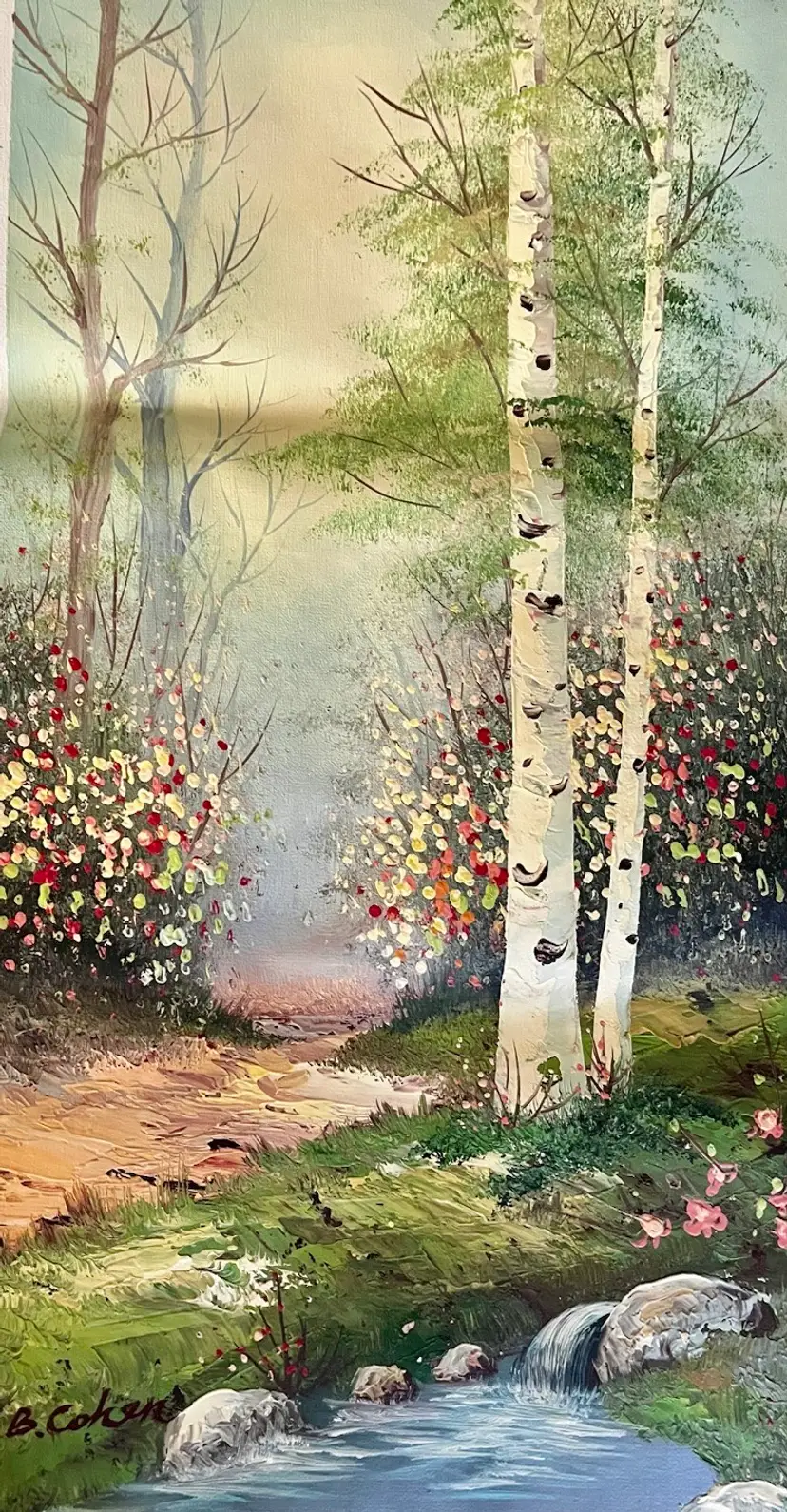 This image depicts an oil painting on canvas featuring a serene forest scene with birch trees, a winding path, and a stream. Artist signed by B. Cohen, whose signature is visible in the lower-left corner.