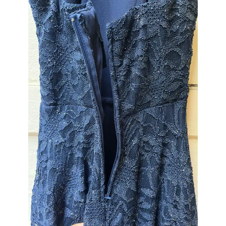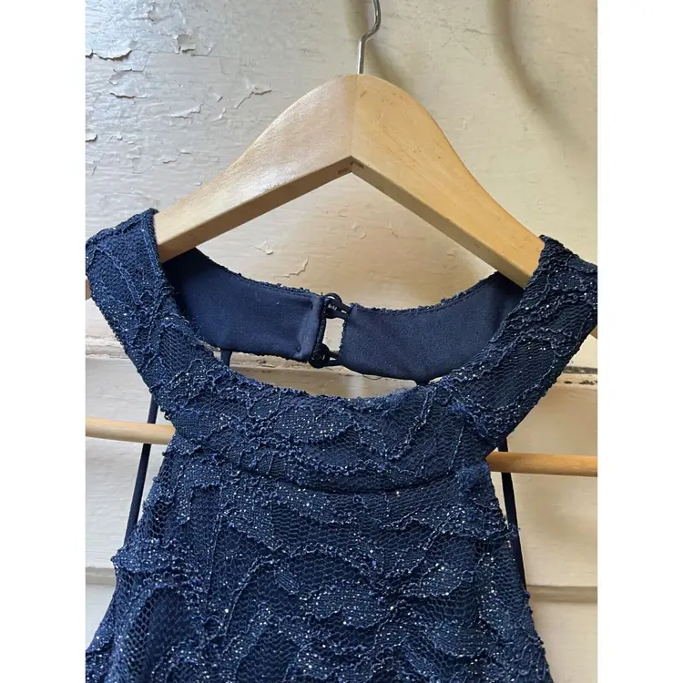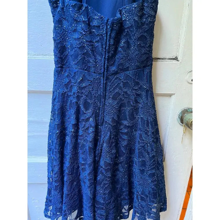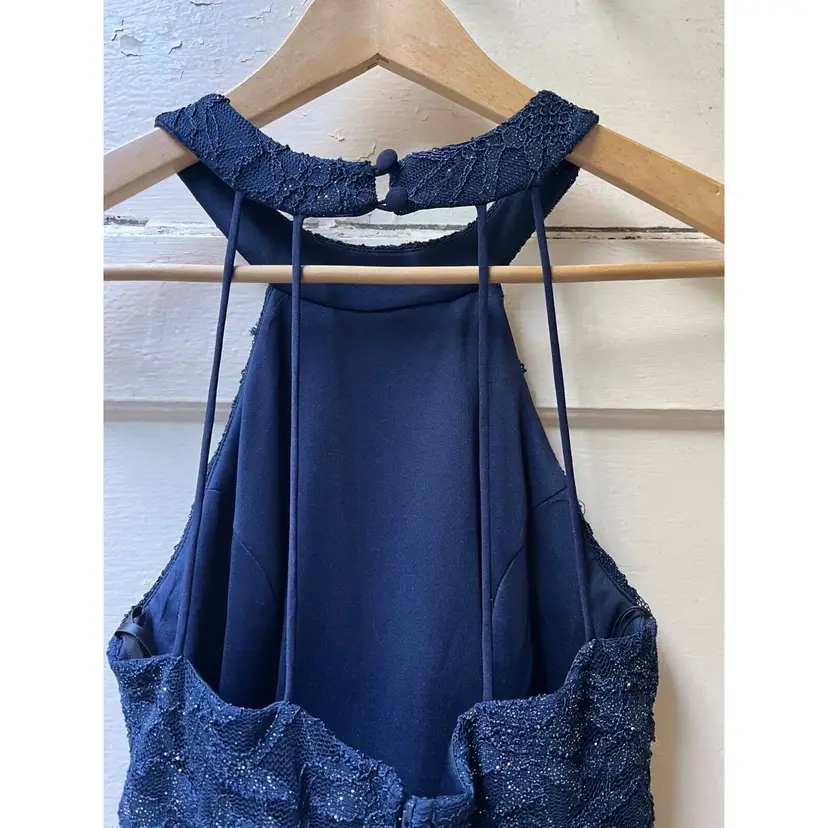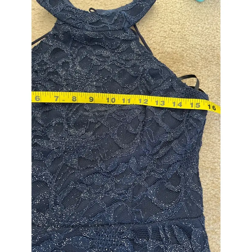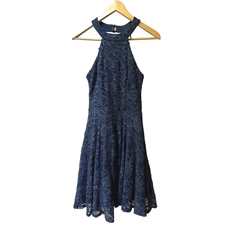 Brand: B Darlin Size Type: Juniors Pattern: Solid Department: Women Sleeve Length: Sleeveless Neckline: Halter Occasion: Party/Cocktail Size: 9/10 Color: navy Style: Fit & Flare Fabric Type: Lace Dress Length: Short