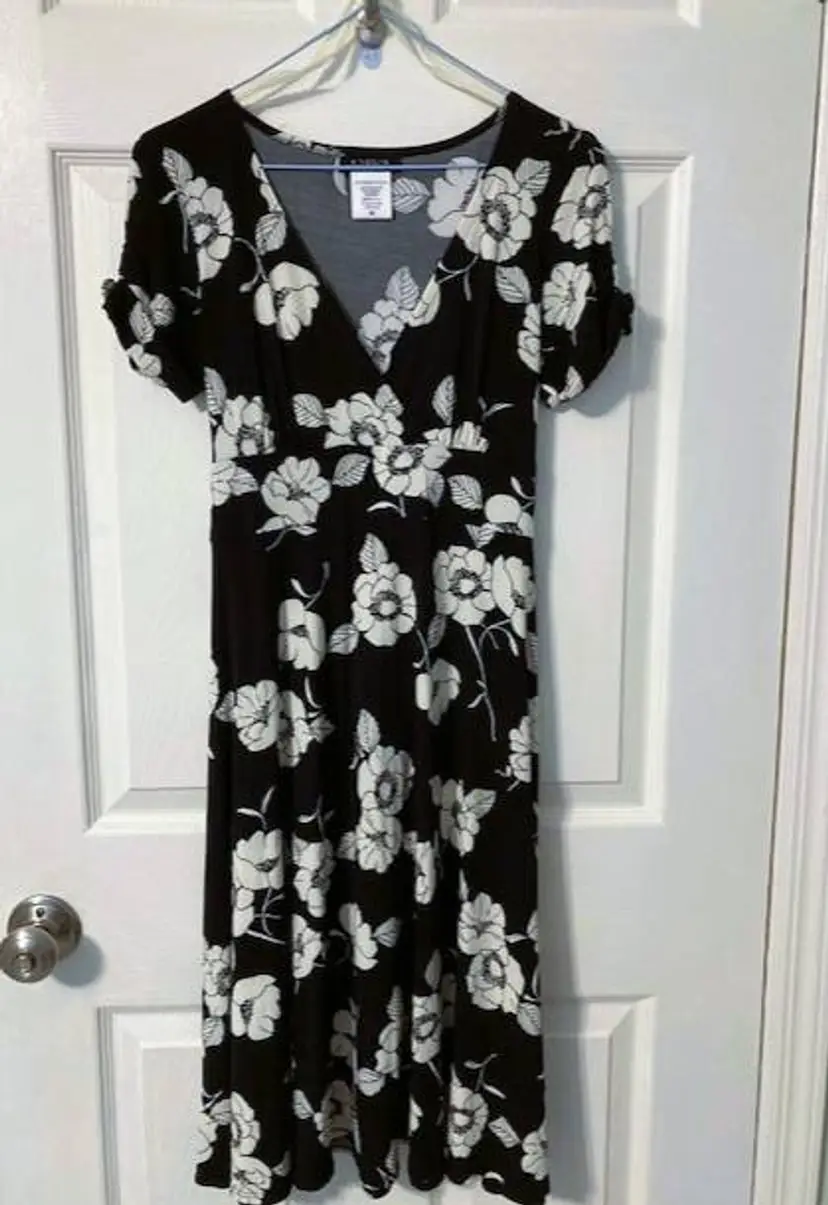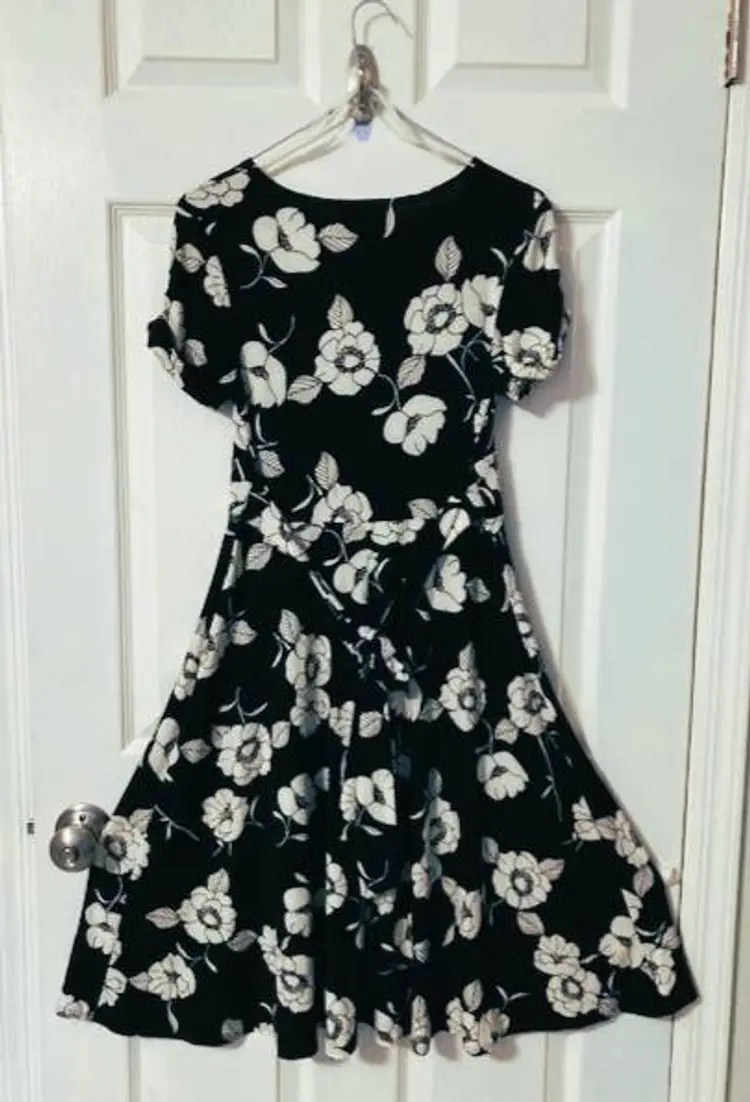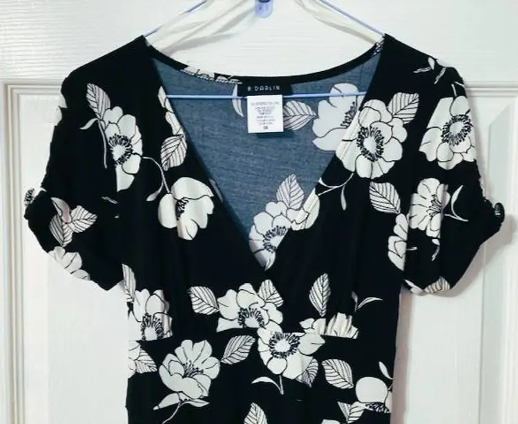 B. Darlin fit & flare dress. Featuring a beautiful floral pattern in black and white, this knee-length dress has a flattering V-neckline, high waist with tie backs, short flutter sleeves with accent buttons. The dress is made of a blend of 92% polyester and 8% spandex, making it perfect for any season and occasion. Coordinates well with blazers and sweaters. Made in USA and perfect for women who want to look their best without compromising on comfort. Very good condition.