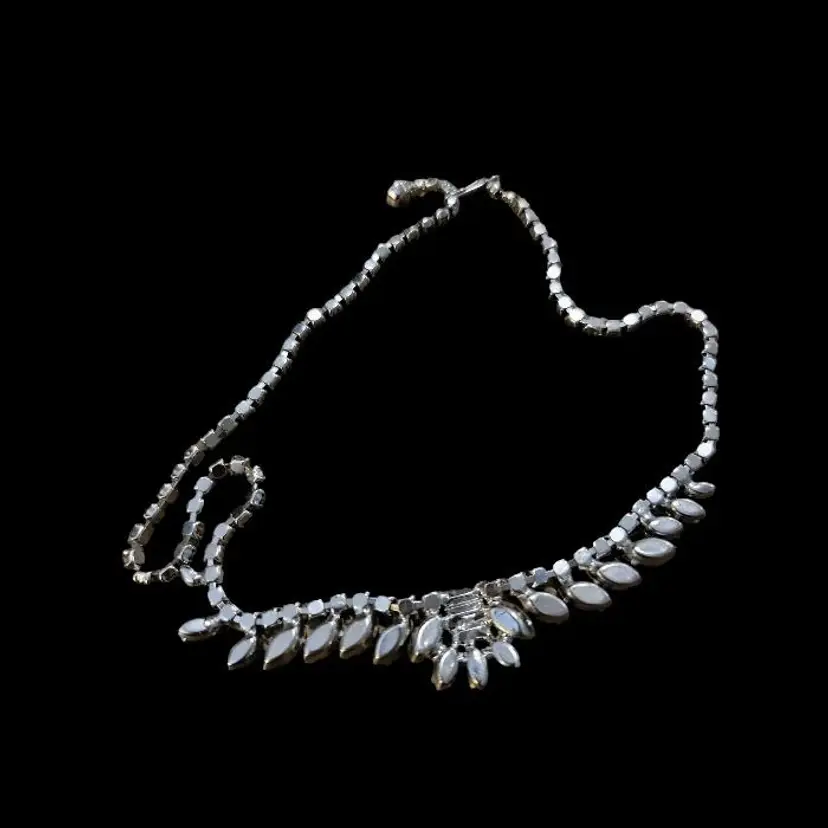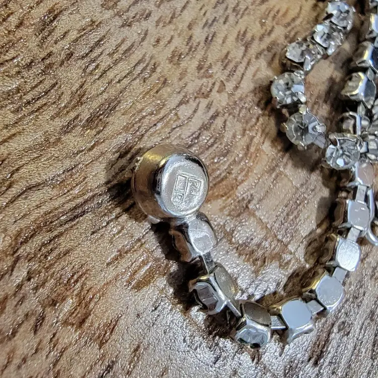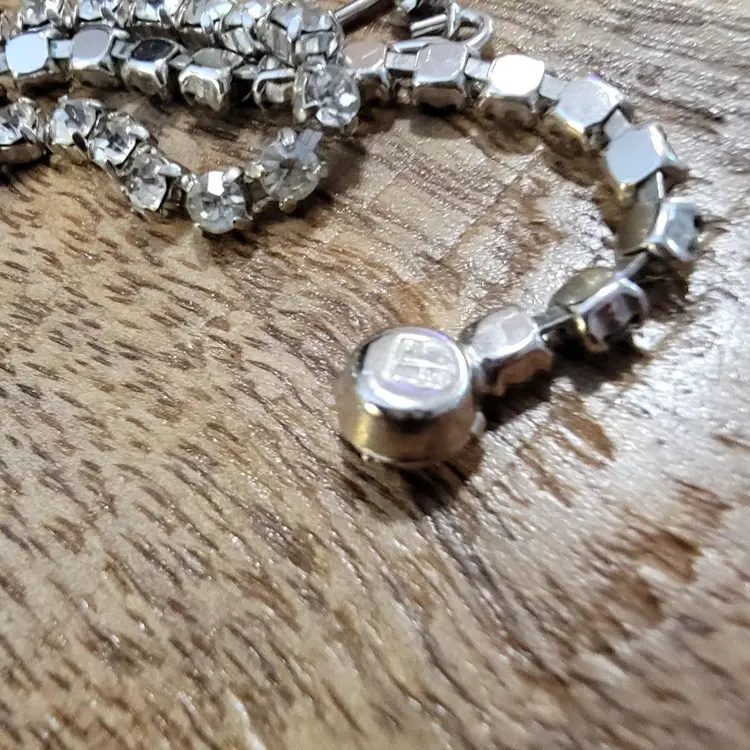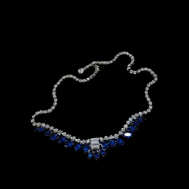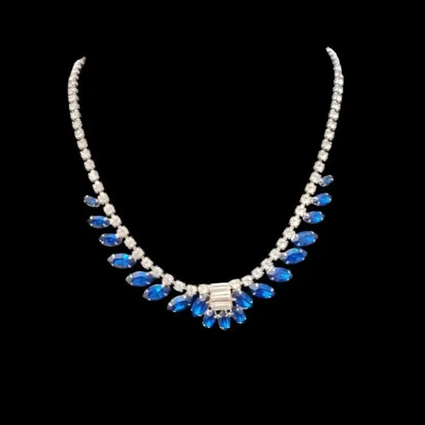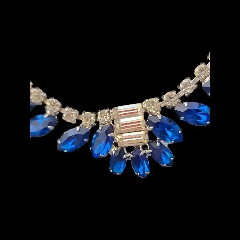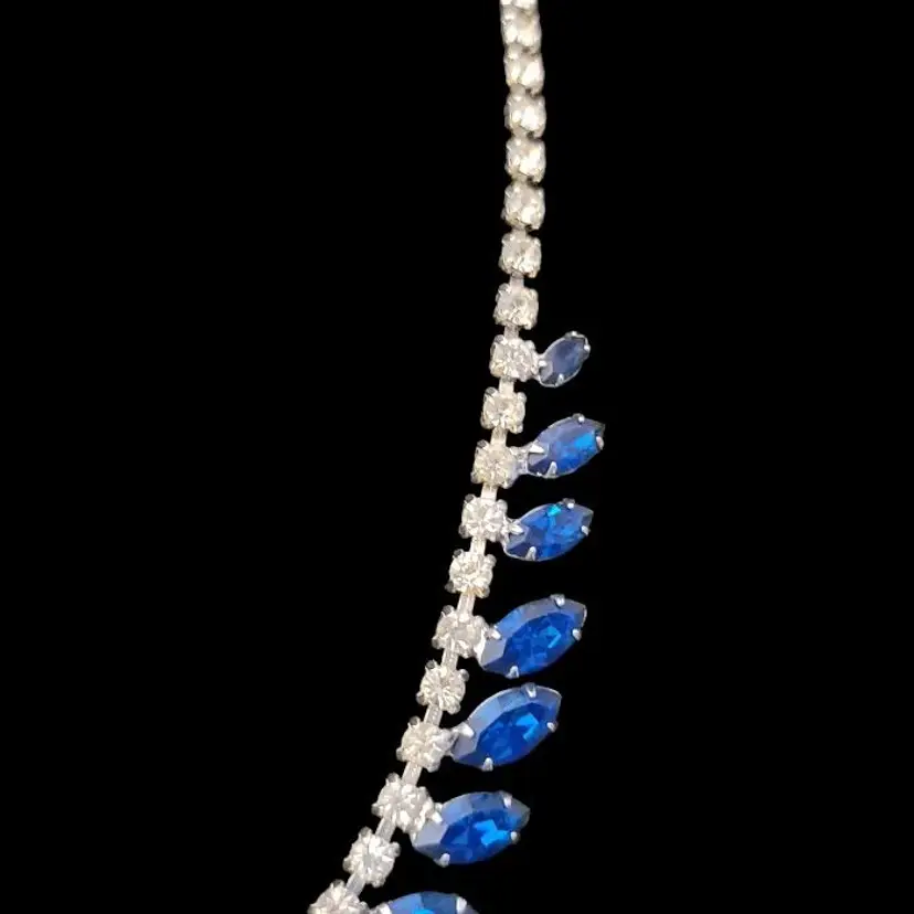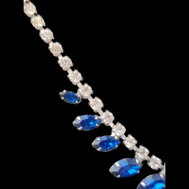 A beautiful B. David Necklace made between 1953 and 1994 when the company was known for delicate, colorful rhinestone jewelry. They also created gold and silver fine jewelry. This is a 15 inch choker with a hook clasp and a special, larger rhinestone at the end, with the B David mark on the back. While this was intended for those special fancy evenings out, today's use is freer. I could see this amazing blue sparkly choker creating a new look with a blouse and jeans! We are fearless. All of the stones are present in this great example of David's artistry.