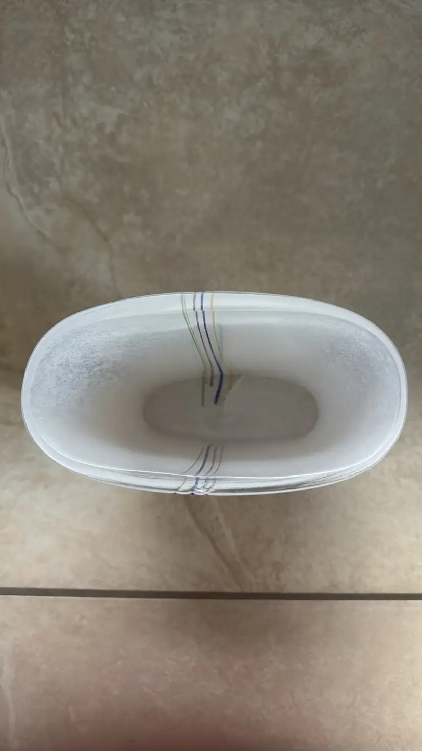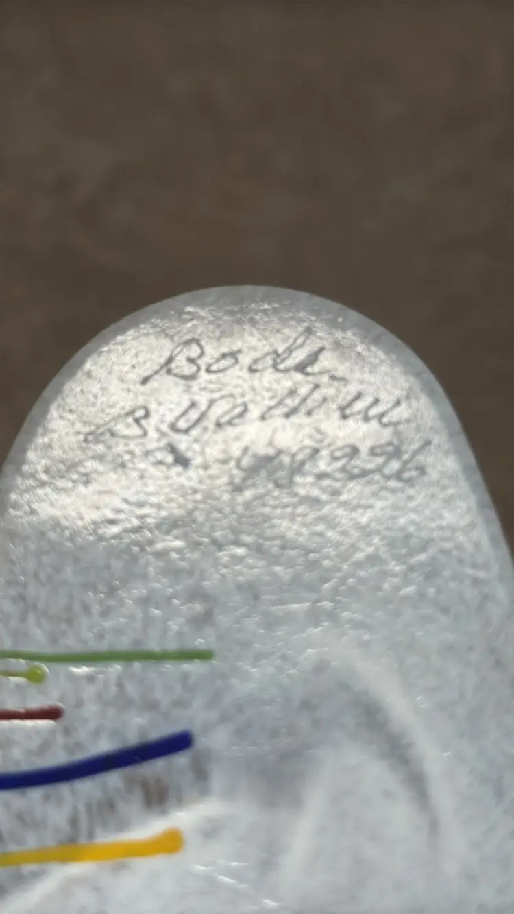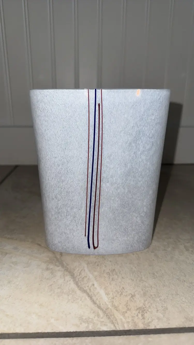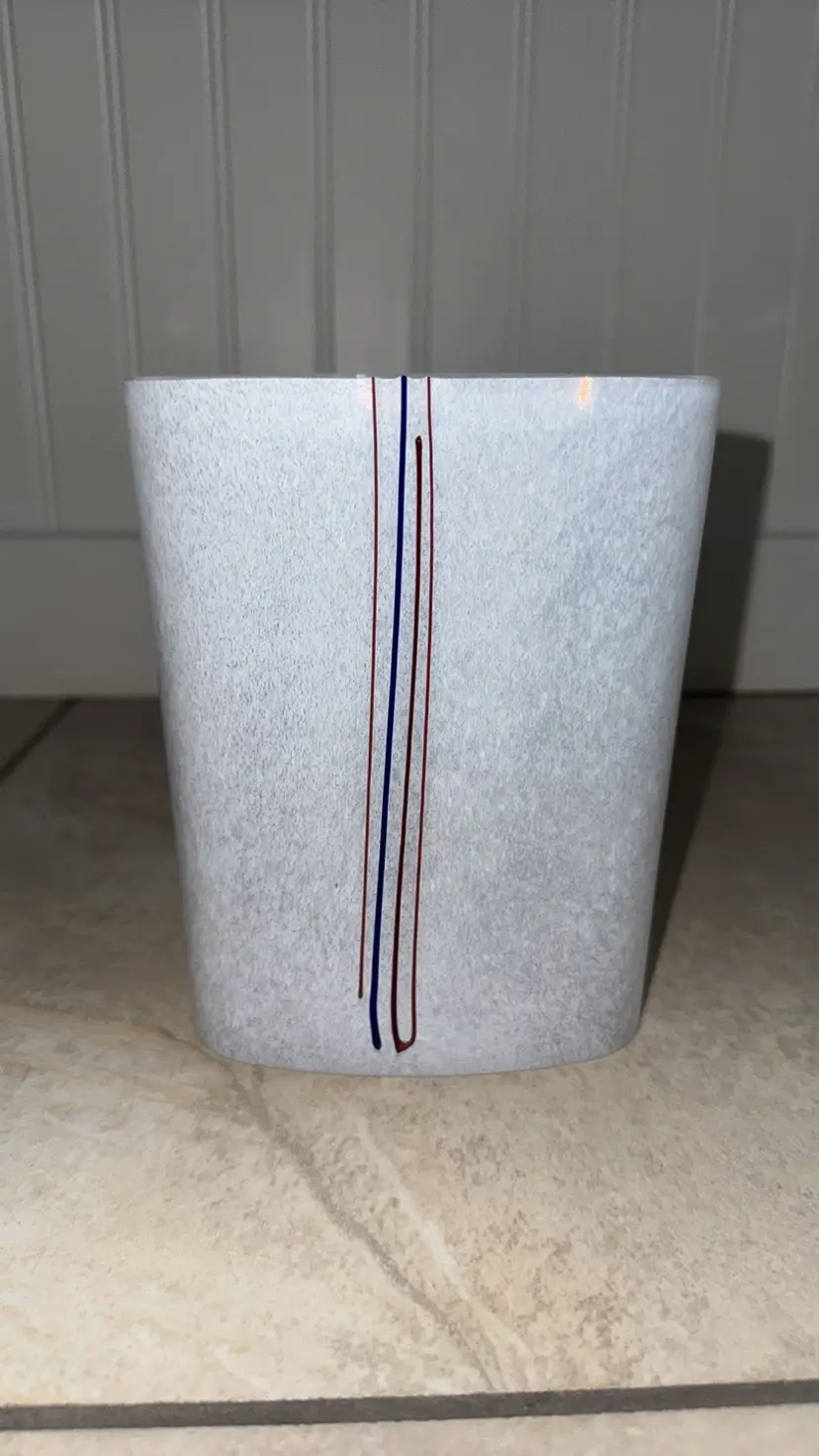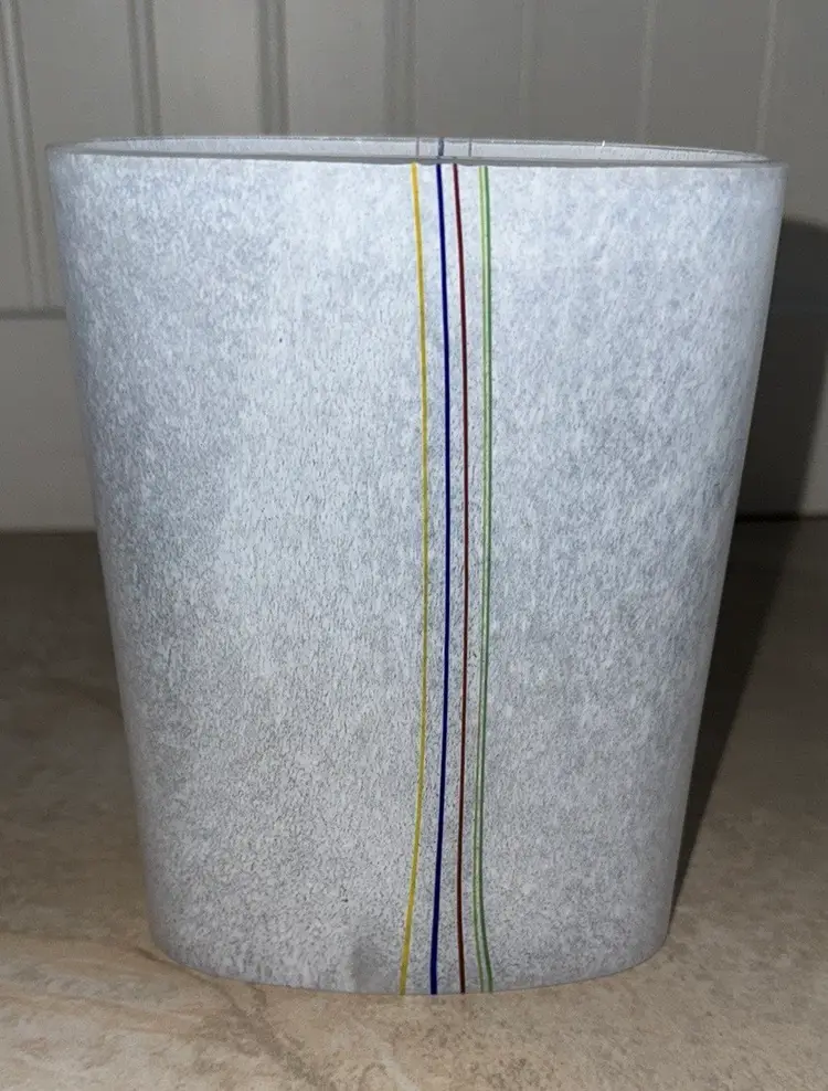 B Vallien for Boda Swedish Art Glass “Rainbow“ 48226 Vase 6.75” tall 5.25” by 2.75” Stylish white waste bin featuring colorful stripes. Perfect for any room. Signed by the artist Excellent condition with no breaks or chips (6836302510)