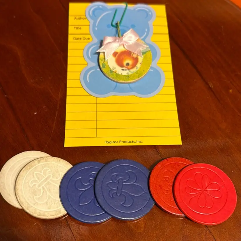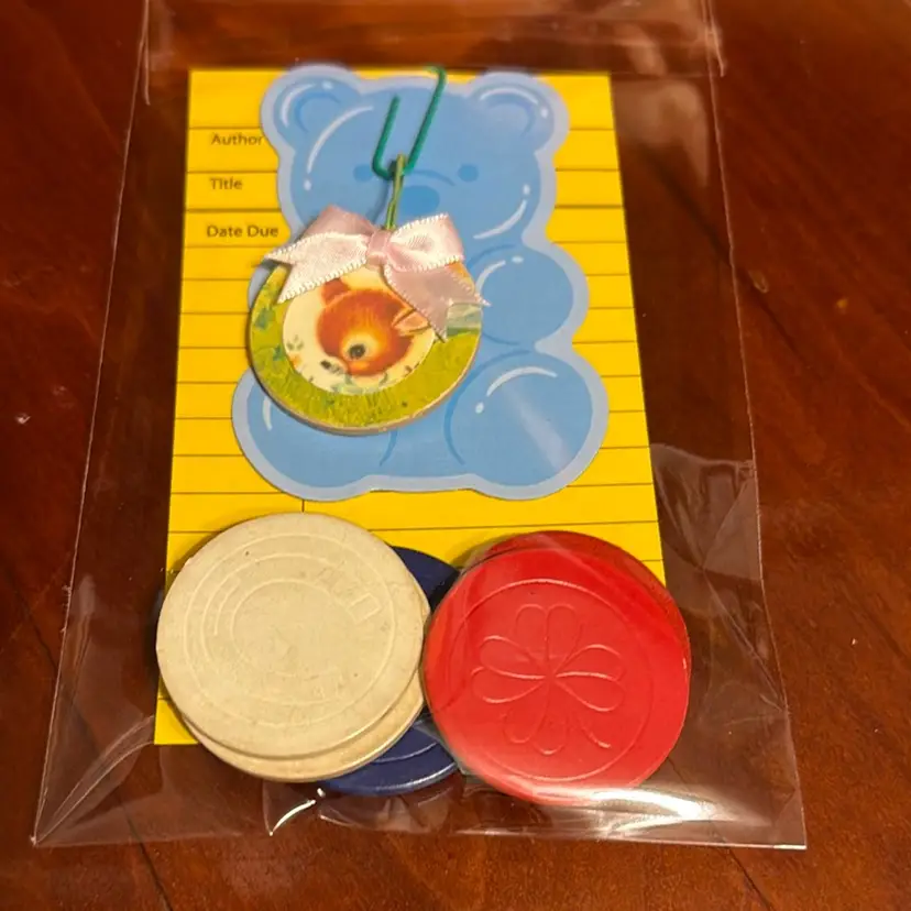 The poker chips are vintage and made from paper/chipboard. The charm is up cycled using vintage children’s book pages