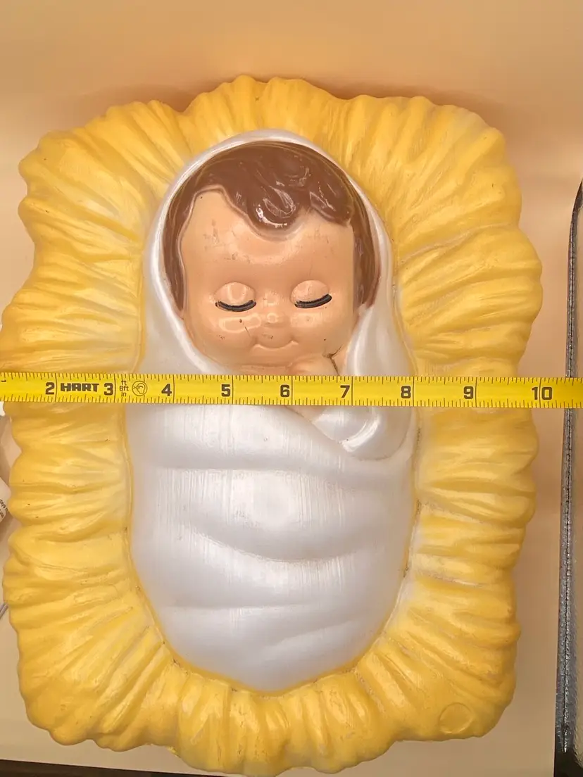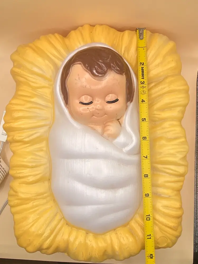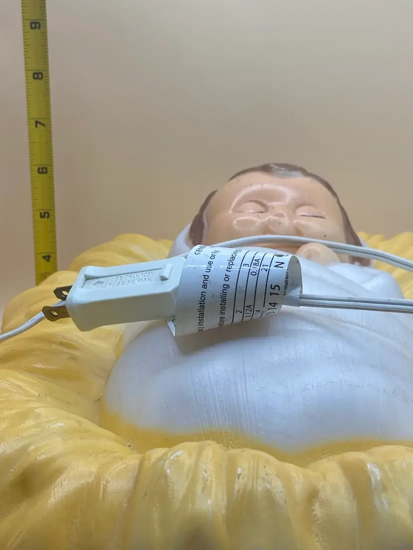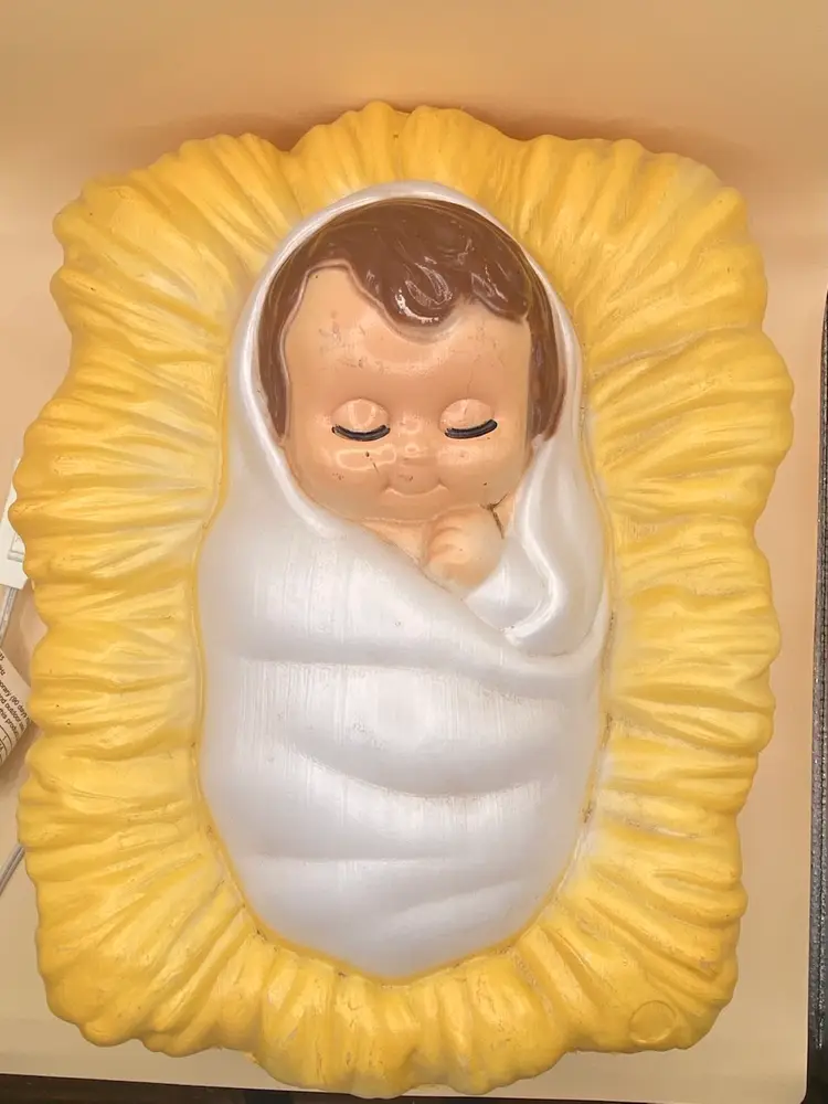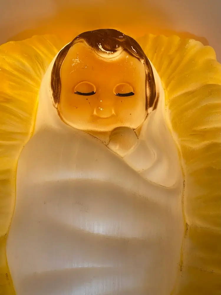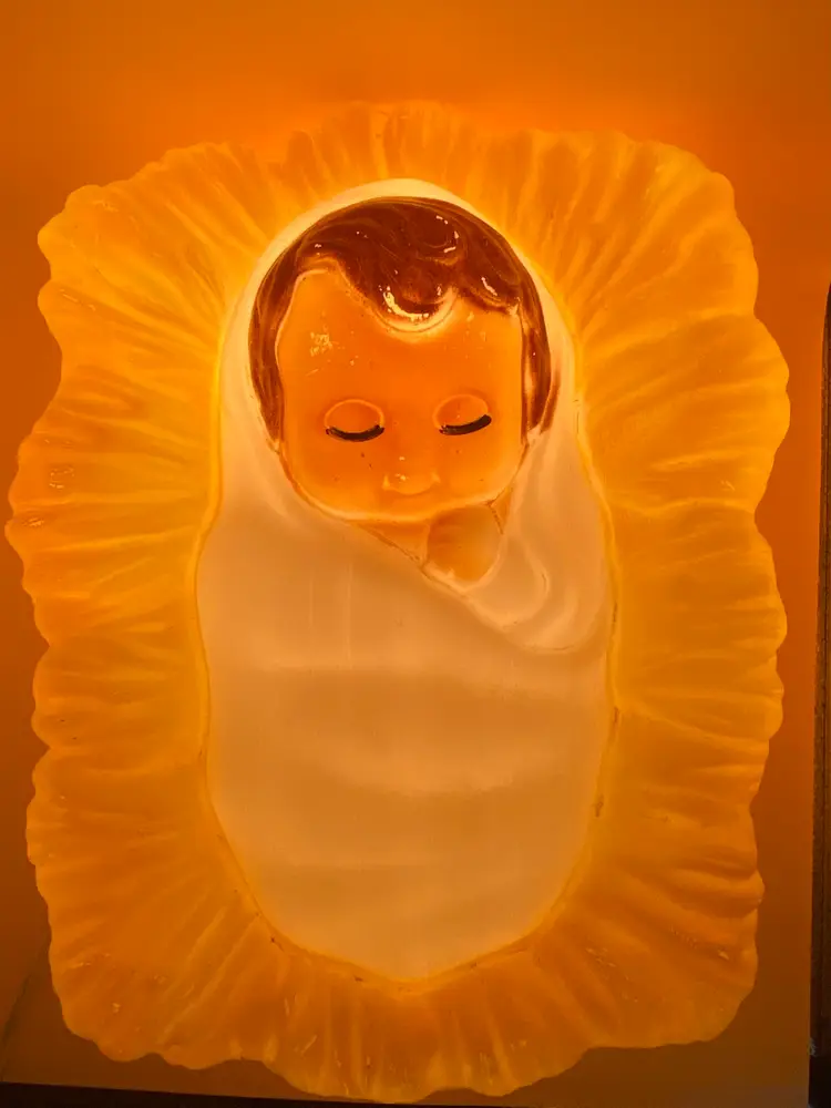 This vintage baby Jesus was made by General Foam Plastics in Virginia. It lights up and works great. He was originally part of a 3 piece nativity set. He does have a little paint loss on his face, but could easily be touched up and look good as new. There are no cracks in the mold or damage. See all pictures for condition.