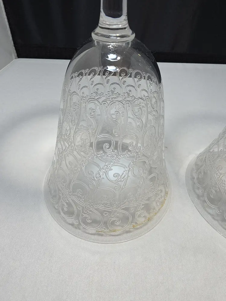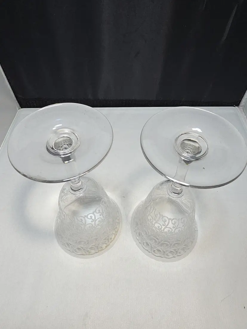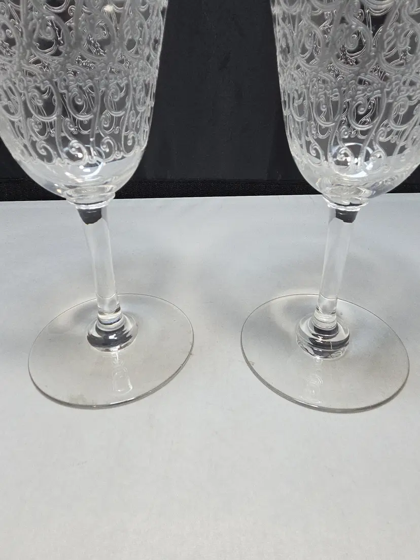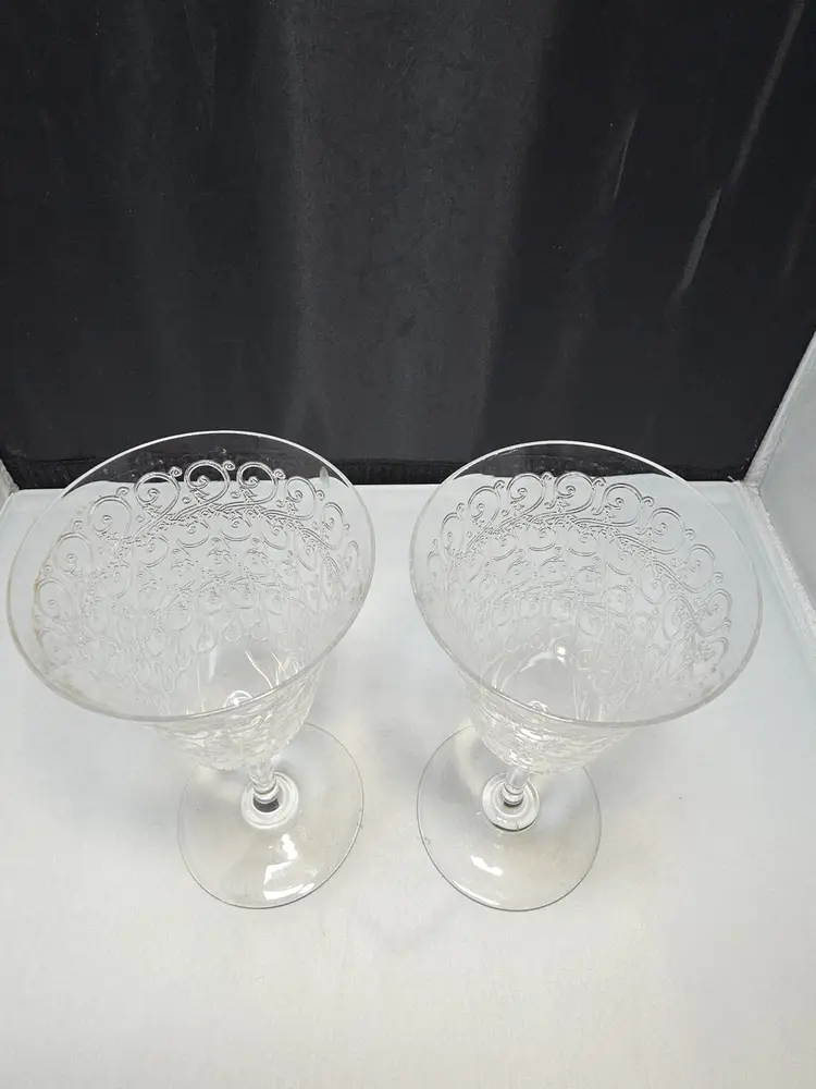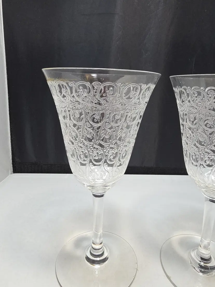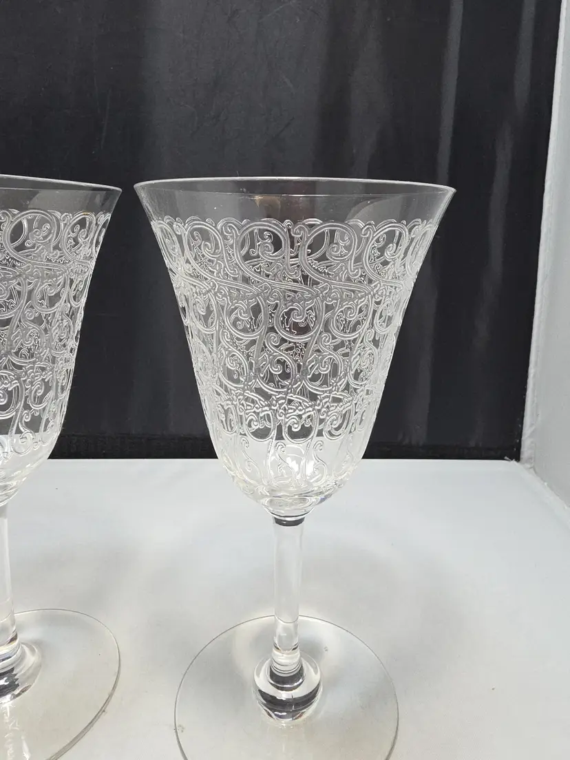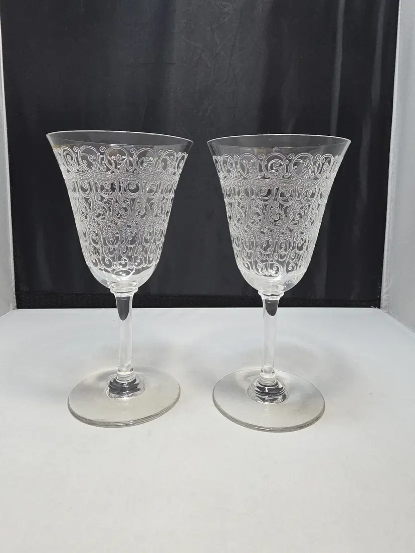 Description Set of two etched crystal wine goblets in the Rohan pattern by Baccarat. This classic pattern features ornate wheel-engraved scrollwork encircling the bowl, a timeless French design originally introduced in the 1930s. Elegant flared bowls with smooth stems and round bases. Unmarked, which is correct for many earlier Baccarat stemware pieces. Condition Very good pre-owned condition. No chips or cracks. Light surface wear consistent with age and normal use. Includes 2 matching Baccarat Rohan goblets
