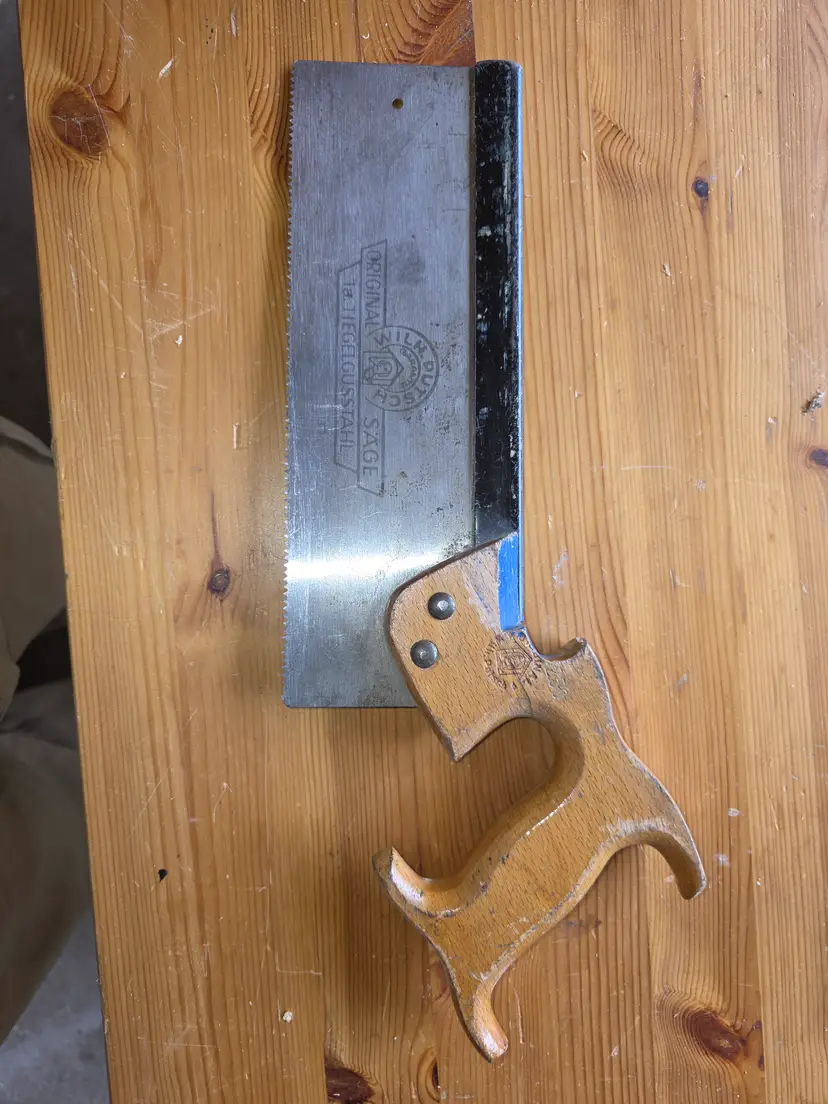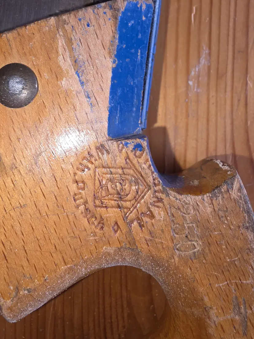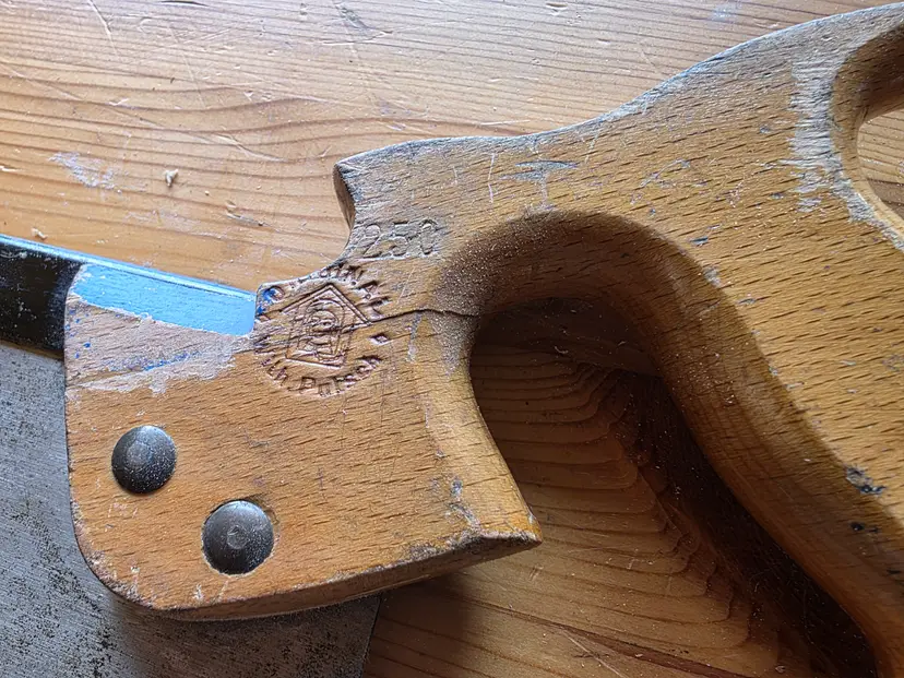 Selling a back saw that i picked up because I wanted to resharpen with cross cut teeth but never have gotten around to it. Handle has been repaired (before me) but the repair is solid.