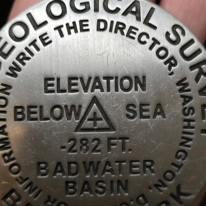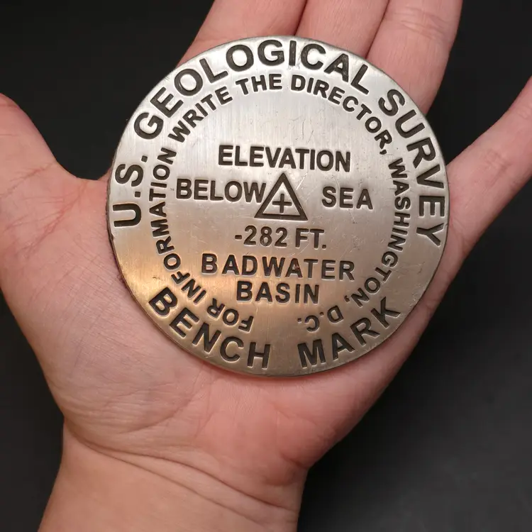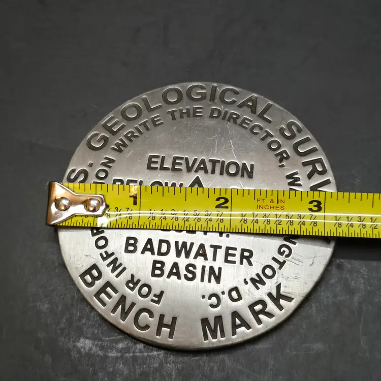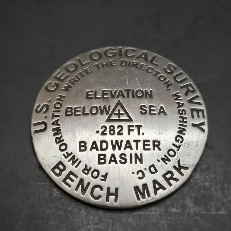 Paperweight replica of the markers that are used to denote a location's elevation relative to sea level. The specific benchmark shown indicates the elevation of Badwater Basin in Death Valley National Park, California.