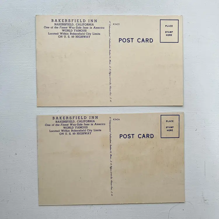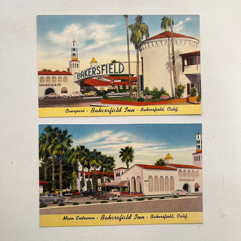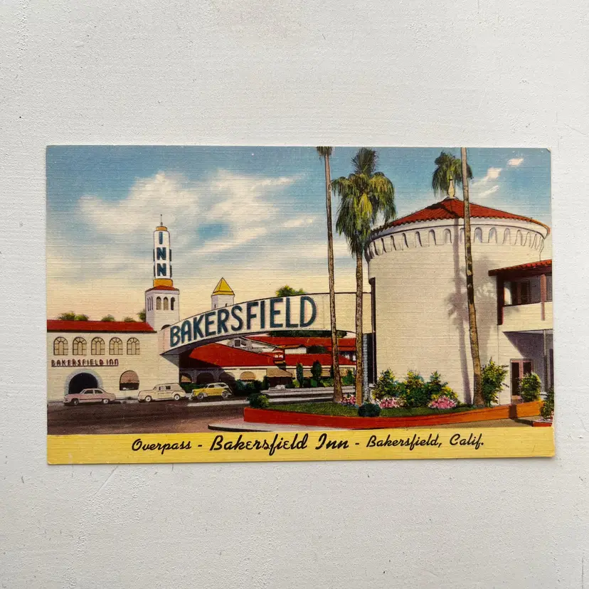 Bakersfield California Hotel Linen Postcards Vintage 1940s Bakersfield Inn One of the finest way-side inns in America Located within Bakersfield City Limits on Golden State US Highway 99 The Landmark Bakersfield Overhead Pass Sign Stretches Across Union Avenue Condition: Unused. Unposted. A little wear on the corners. Measures 5-1/2 inches x 3-1/2 inches Packaged in a plastic sleeve inside a rigid envelope Visit my store to see more vintage ephemera, advertising, novelties, gifts, estate sale and yard sale finds https://district.net/u/finderspickerspaper SKU B33