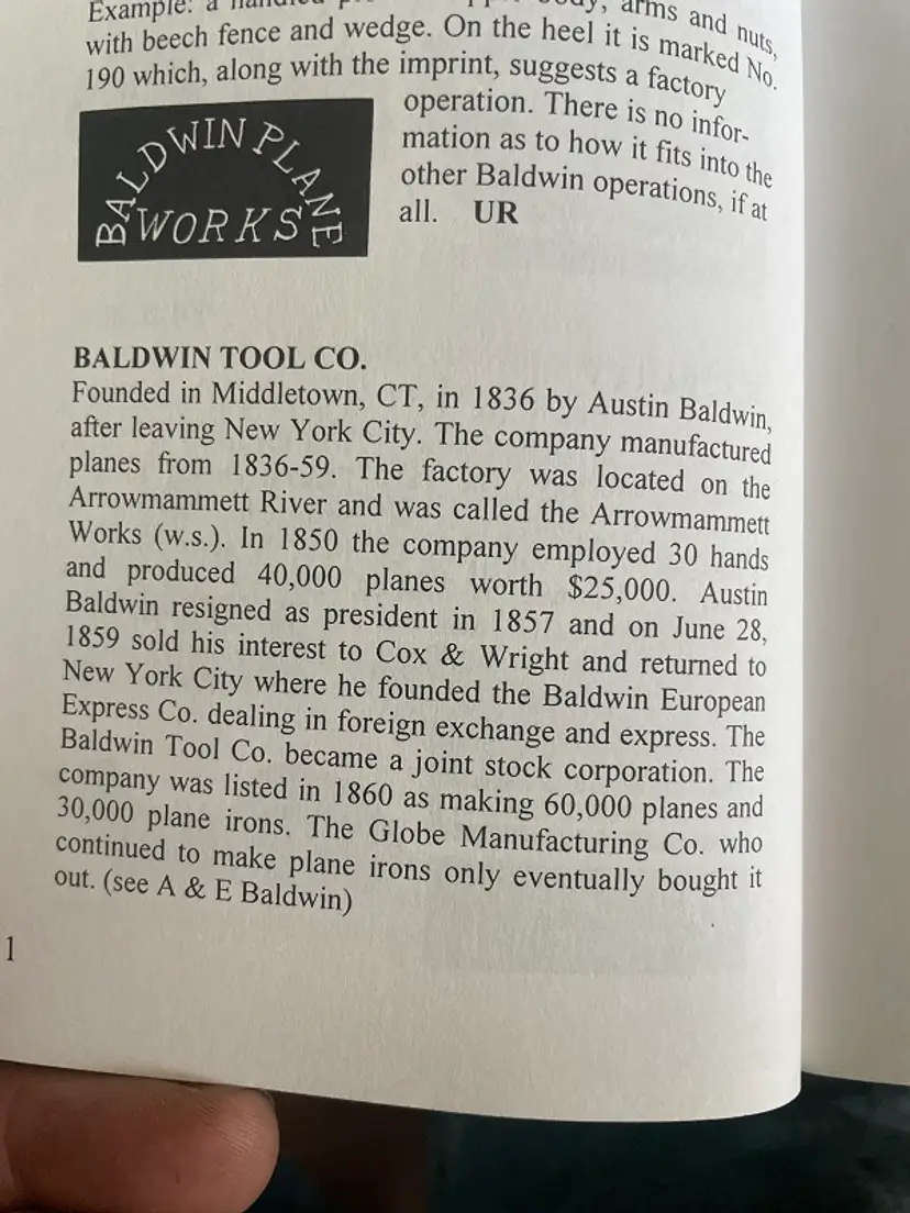 B. The blade is marked Baldwin Tool Co. Smoother with no marking on the plane, so I do not know if it’s just the blade made by them or both. . I restored this nice smoother a few years ago and it’s just been sitting in my shop. It is sharpened with a slight camber for semi-rough work. The mouth is a little tight for rough work but it works as is. The mouth could be easily opened a little with a bit more camber, or you could slowly sharpened the slight camber out to make a finish smoother. In my opinion, it’s more comfortable to us than a coffin smoother and is a great user if you like using the old wooden hand planes . An Excerpt from “A Guide to the Makers of American Wooden Planes Paperback – September 1, 2001 by Martyl Pollak (Author), Edward A. Fagen (Author), Emil Pollak (Author)” https://amzn.to/4dYef24 BALDWIN TOOL CO. Founded in Middletown, CT, in 1836 by Austin Baldwin, after leaving New York City. The company manufactured planes from 1836-59. The factory was located on the Arrowmammett River and was called the Arrowmammett Works (w.s.). In 1850 the company employed 30 hands and produced 40,000 planes worth $25,000. Austin Baldwin resigned as president in 1857 and on June 28, 1859 sold his interest to Cox & Wright and returned to New York City where he founded the Baldwin European Express Co. dealing in foreign exchange and express. The Baldwin Tool Co. became a joint stock corporation. The company was listed in 1860 as making 60,000 planes and 30,000 plane irons. The Globe Manufacturing Co. who continued to make plane irons only eventually bought it out. . . The video is here, https://www.timetestedtools.net/misc/baldwin-tool-co-wooden-smoothing-plane/ . . . . (My #S-091324-1)