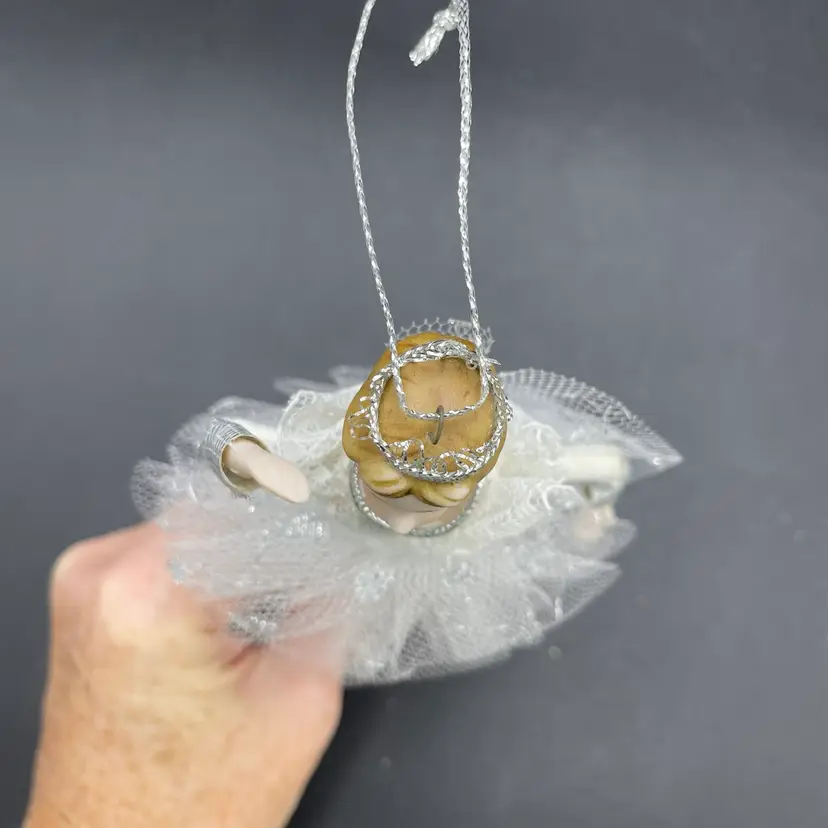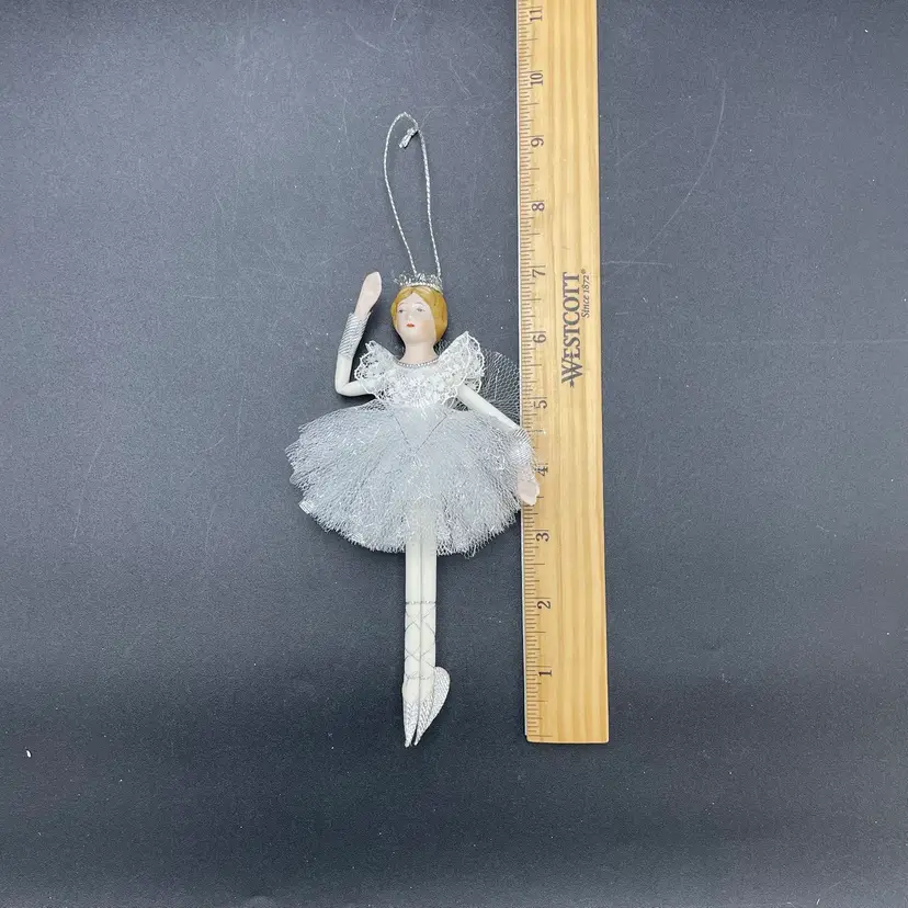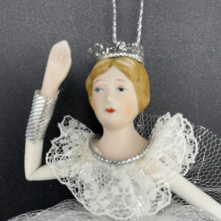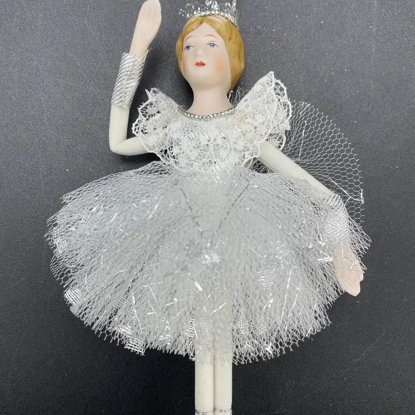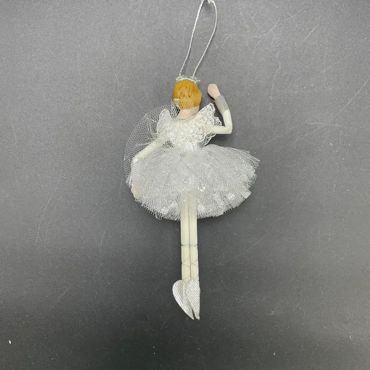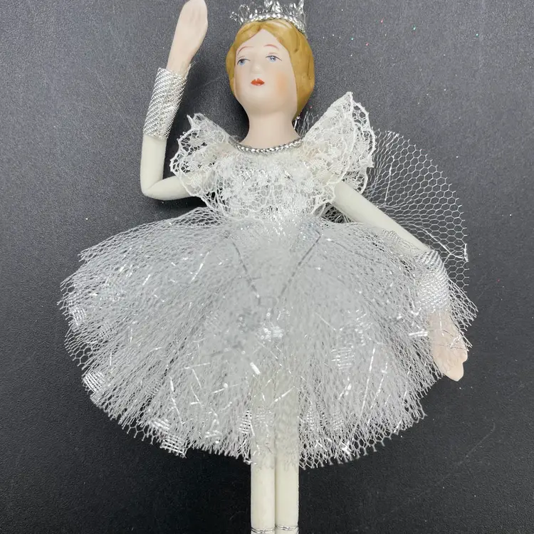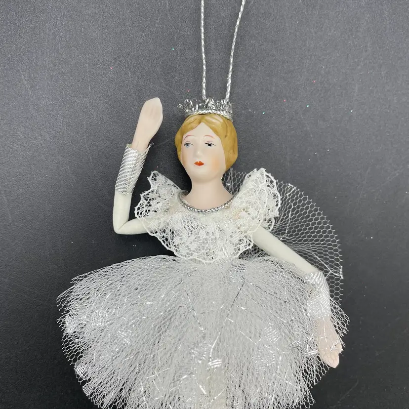 This is a vintage ballerina hanging ornament. Her head and hands are porcelain. Measures approximately 6.5" long. No chips or cracks.