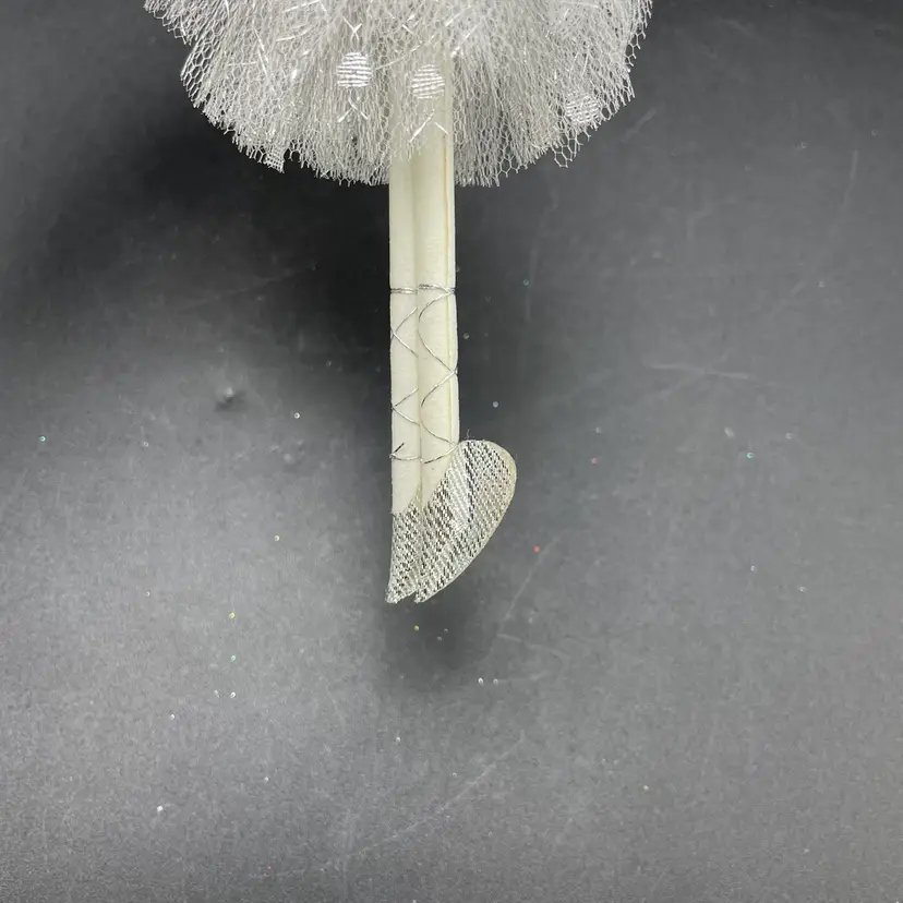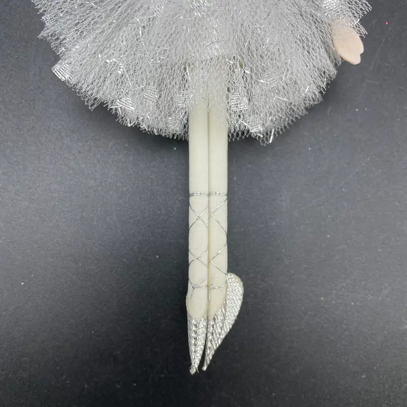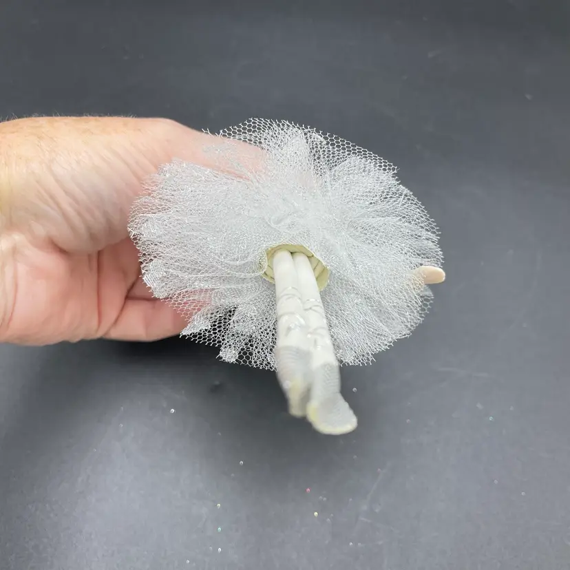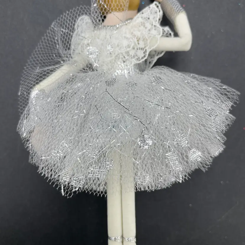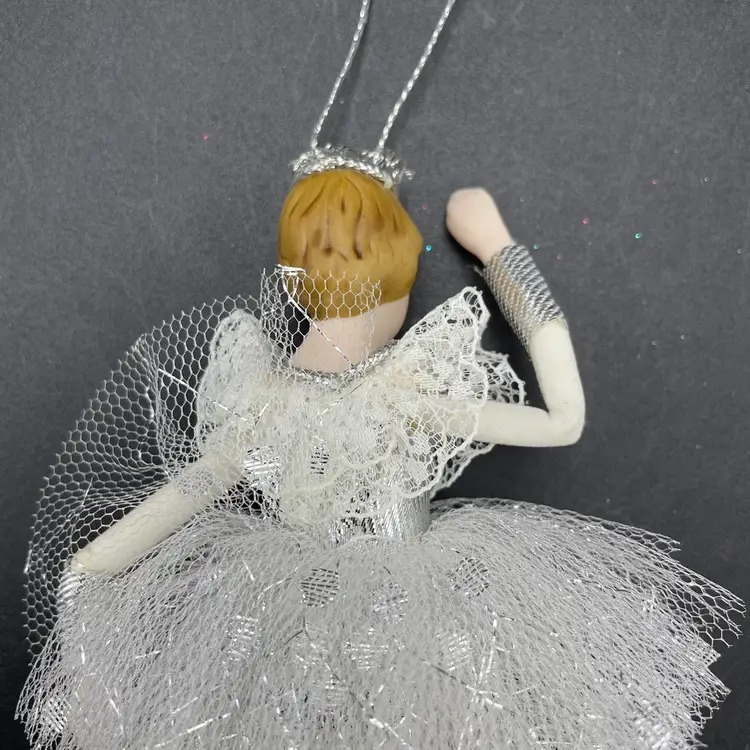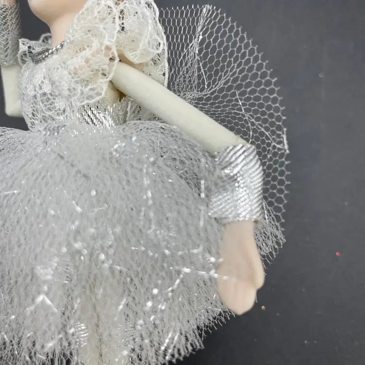 This is a vintage ballerina hanging ornament. Her head and hands are porcelain. Measures approximately 6.5" long. No chips or cracks.