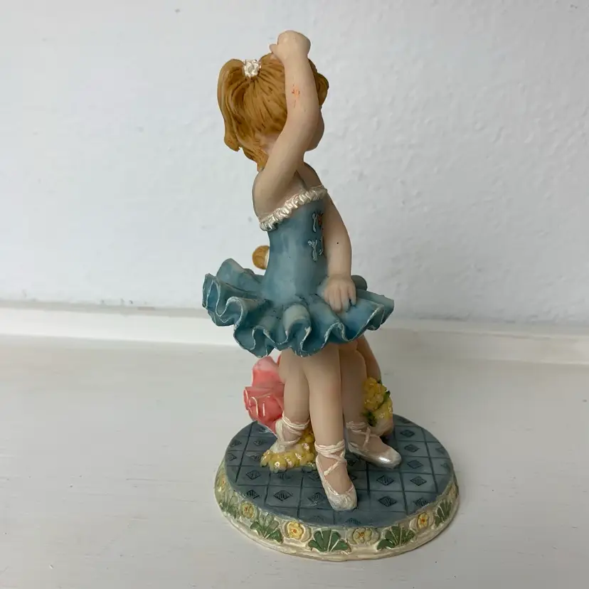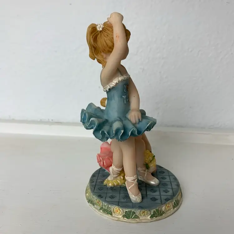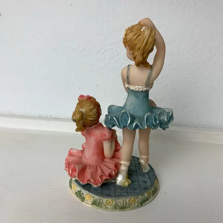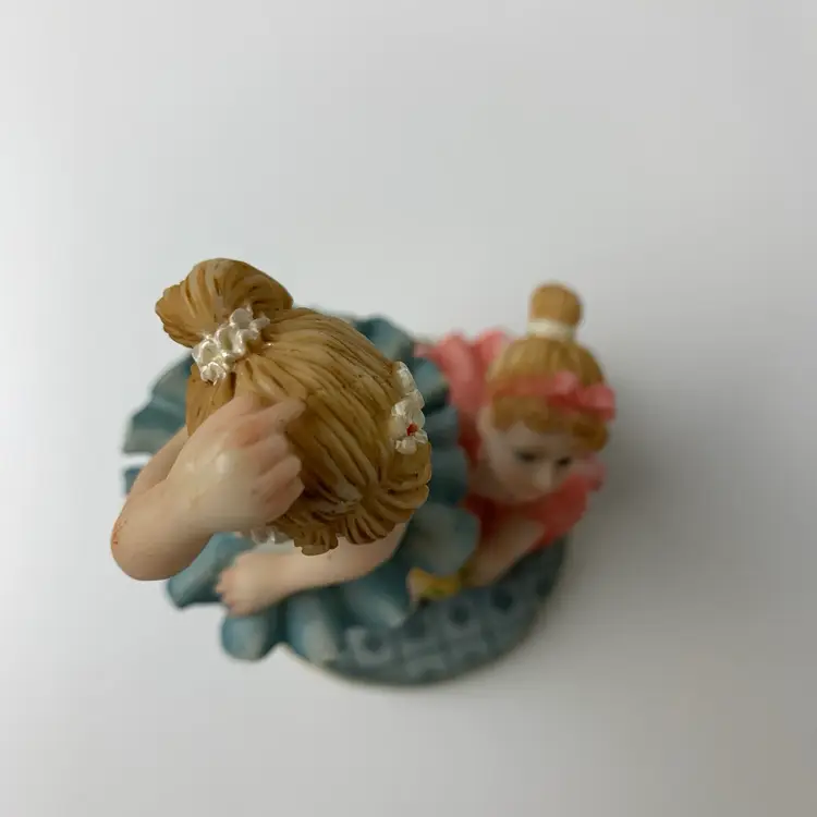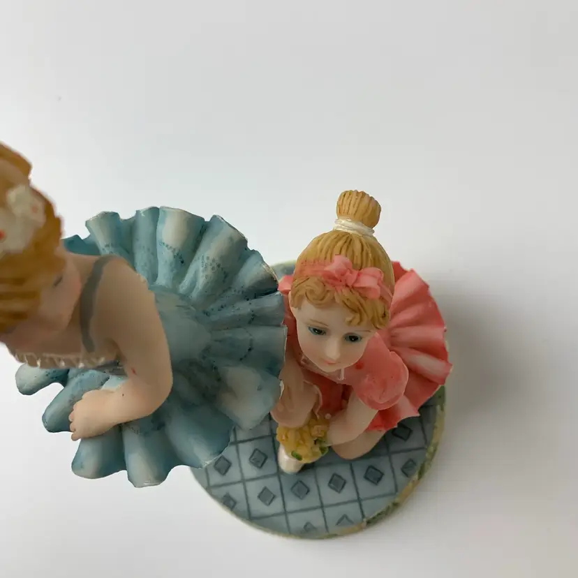 Ballerina's Resin Figurine Standing and kneeling on a platform Blue and pink tutus. Adorable décor for a child's room. Label: Made in China with manufacture mark - crown and the letter "S".