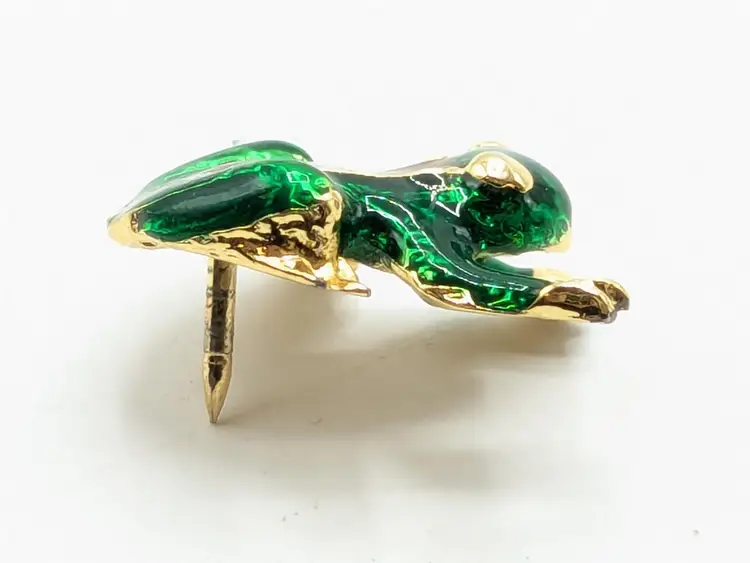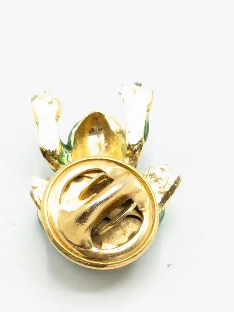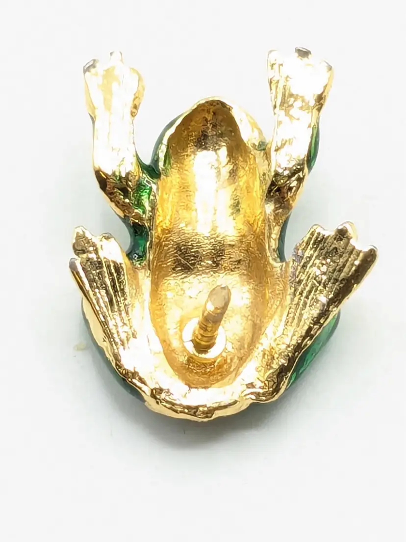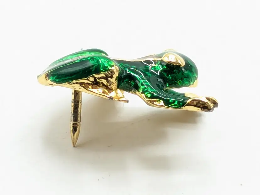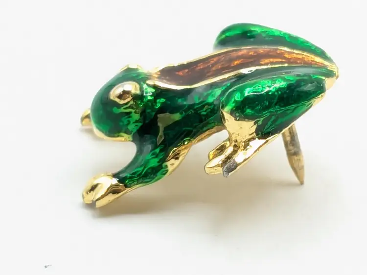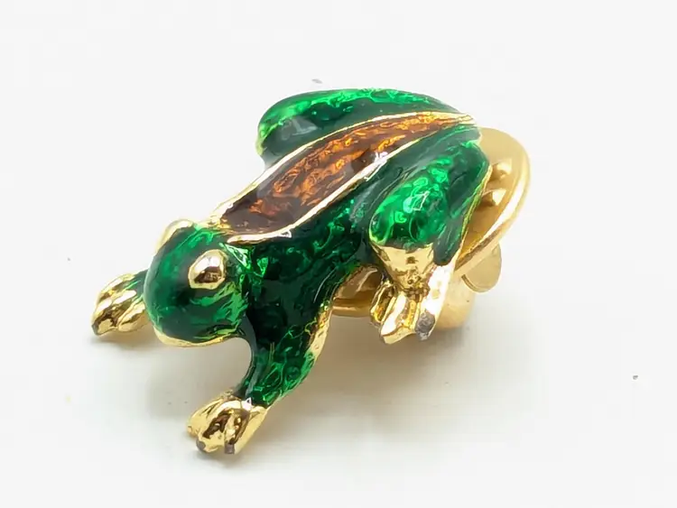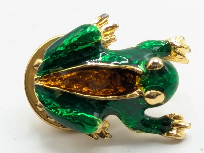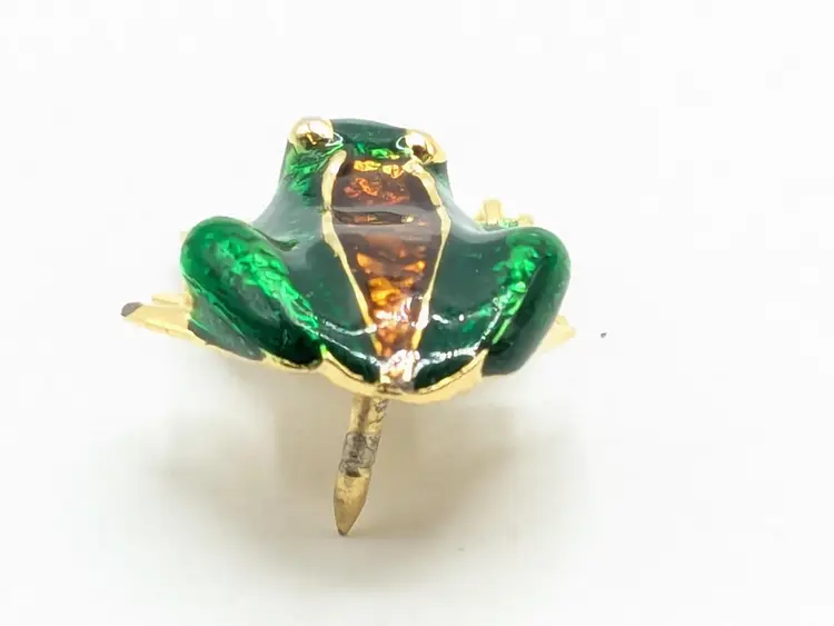Good condition. This charming vintage pin features a green enamel frog with an orange mark on his back. Gold tone accents. Measures approximately 1/2" x 3/4" inches. (EN1)