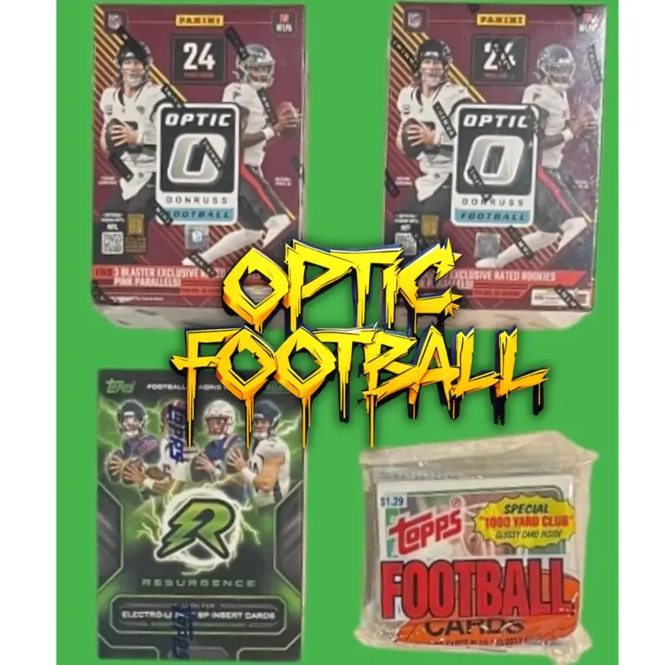 You are bidding on all the cards of the team listed in the title: 2 2024 Donruss Optic Blasters, Topps Resurgence Blaster, & 1988 Topps jumbo cello pack. Rip will happen on the Dibdit Cards District community shortly after the auctions end on June 5th, 2025. US Shipping is $5 for your first spot, $.25 each additional spot you win. Any spot won where no cards of the team are found in the box will receive a sealed football card pack (vintage or modern). Any multi-team base cards will be divided as evenly as possible between the subjects on the card; any multi-team HITS (serial # or dual/triple autos or relics) will be assigned by draw to one participant from the participants who own the depicted teams/ players. Note the 1988 Topps cello pack will not have some of the modern teams like the Ravens, Texans, etc. The Houston Oilers will go to the winner of the Tennessee Titans, while Cleveland Browns will go to the Cleveland Browns winner.