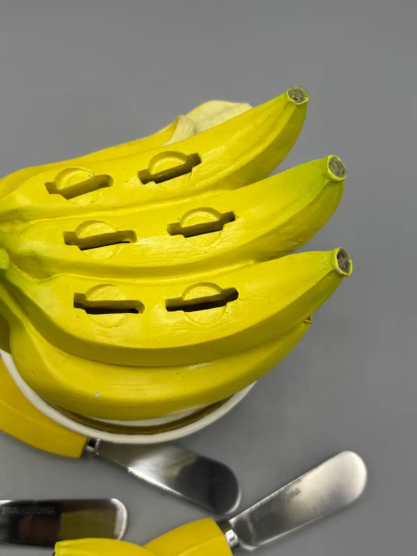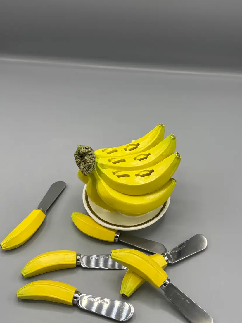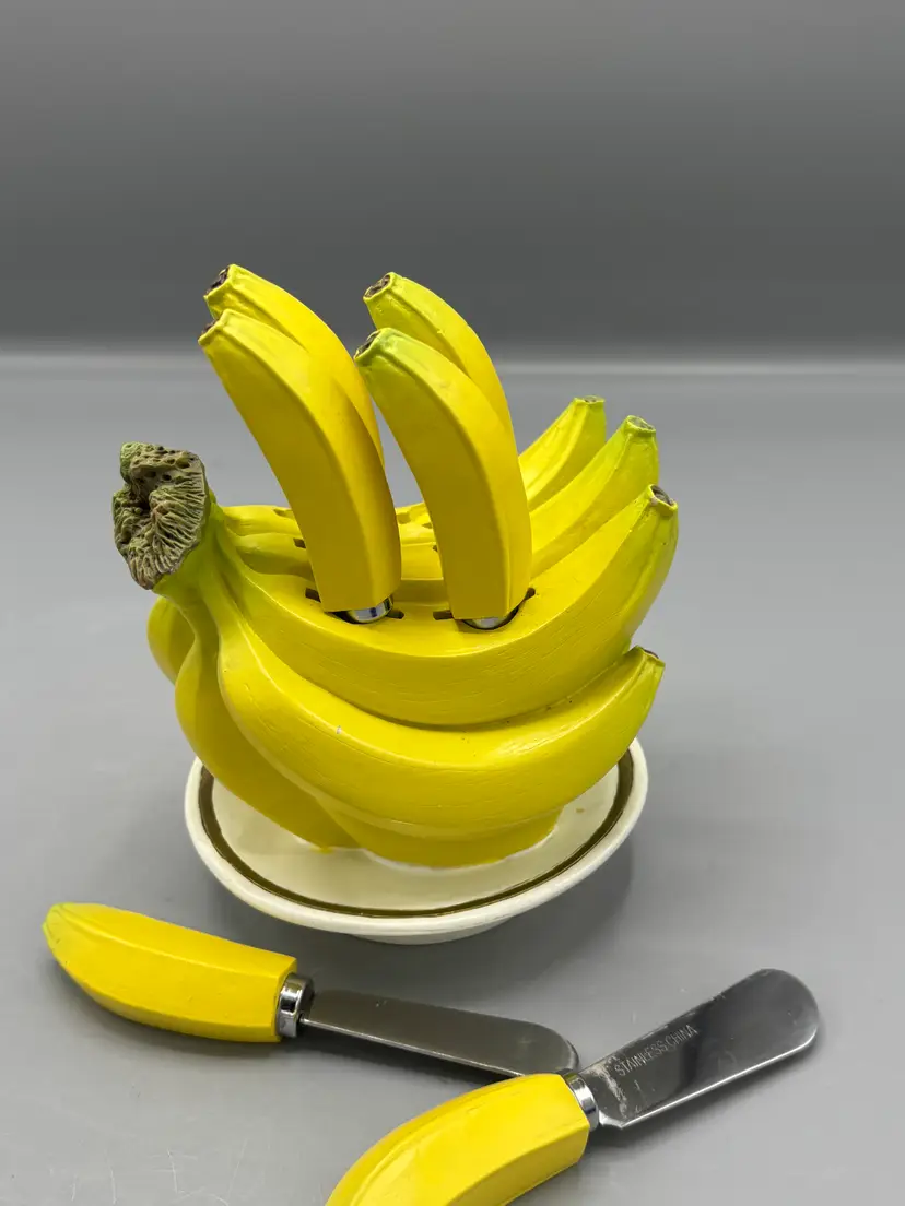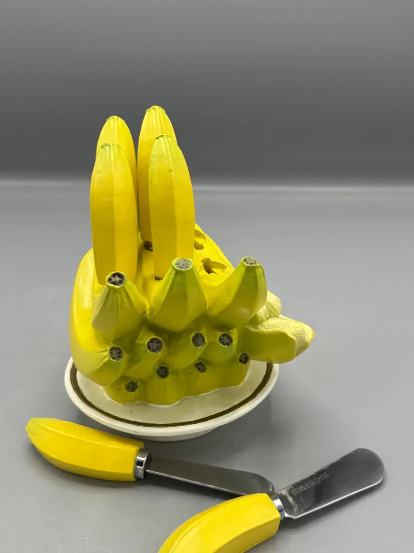 This distinctive banana-shaped knife holder combines form and function with its natural curved design. Featuring practical dimensions of 5 by 5½ inches, it provides secure storage for your kitchen cutlery while adding a playful accent to your countertop or knife block display. An ideal choice for those seeking both utility and whimsical kitchen décor.