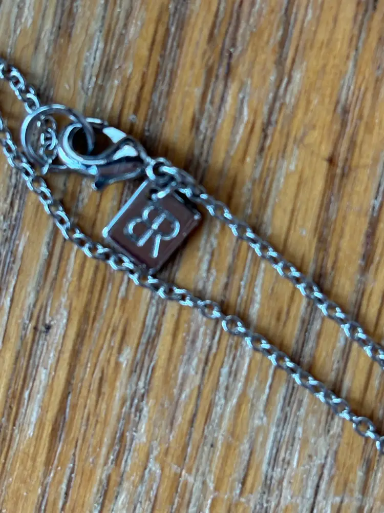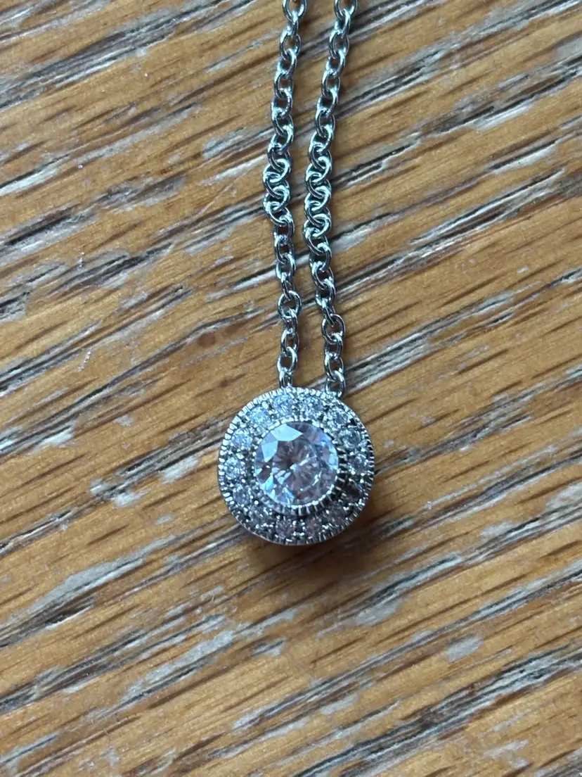 Dainty silver tone necklace. Features a circular crystal pendant. Signed Banana Republic.