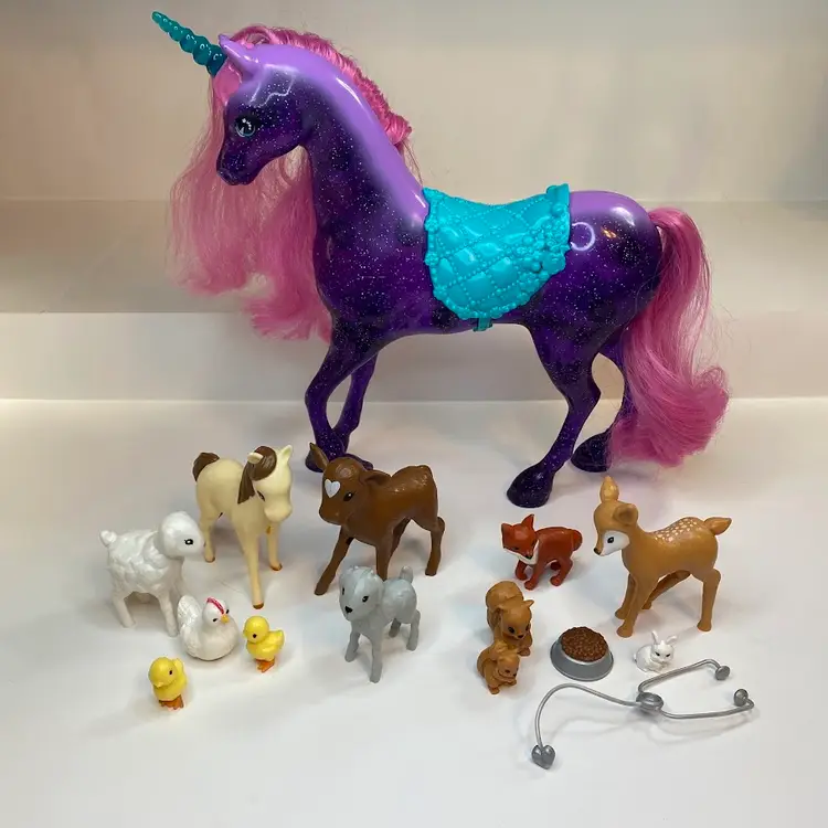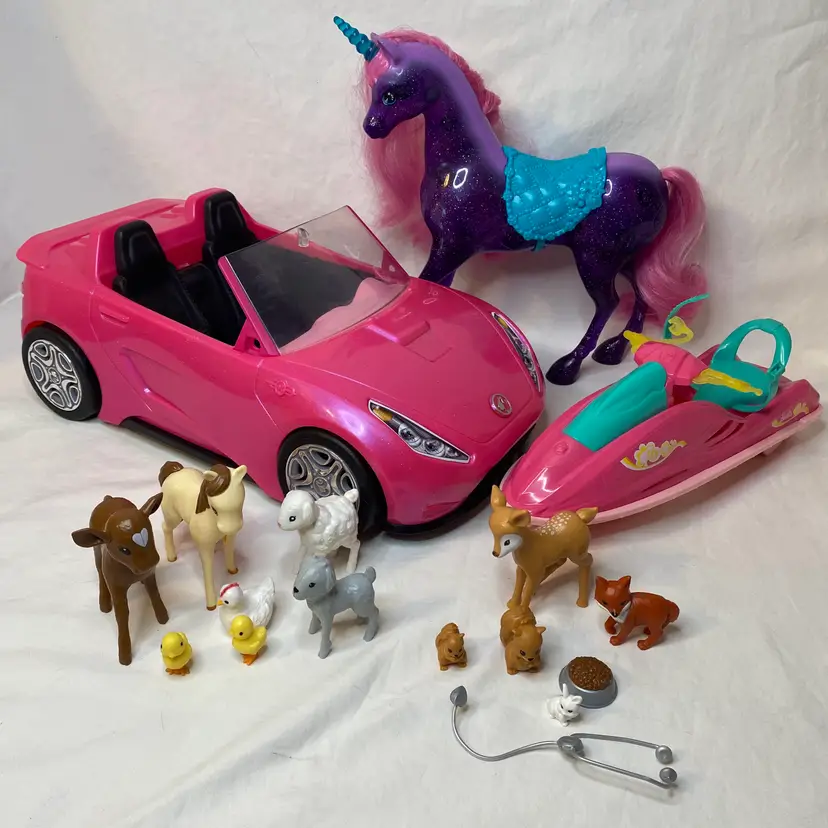 Barbie Lot - Car, Jet Ski, Unicorn and 12 Animals Items shown in photos are used but in overall good condition. Parts may be missing from car and jet ski.