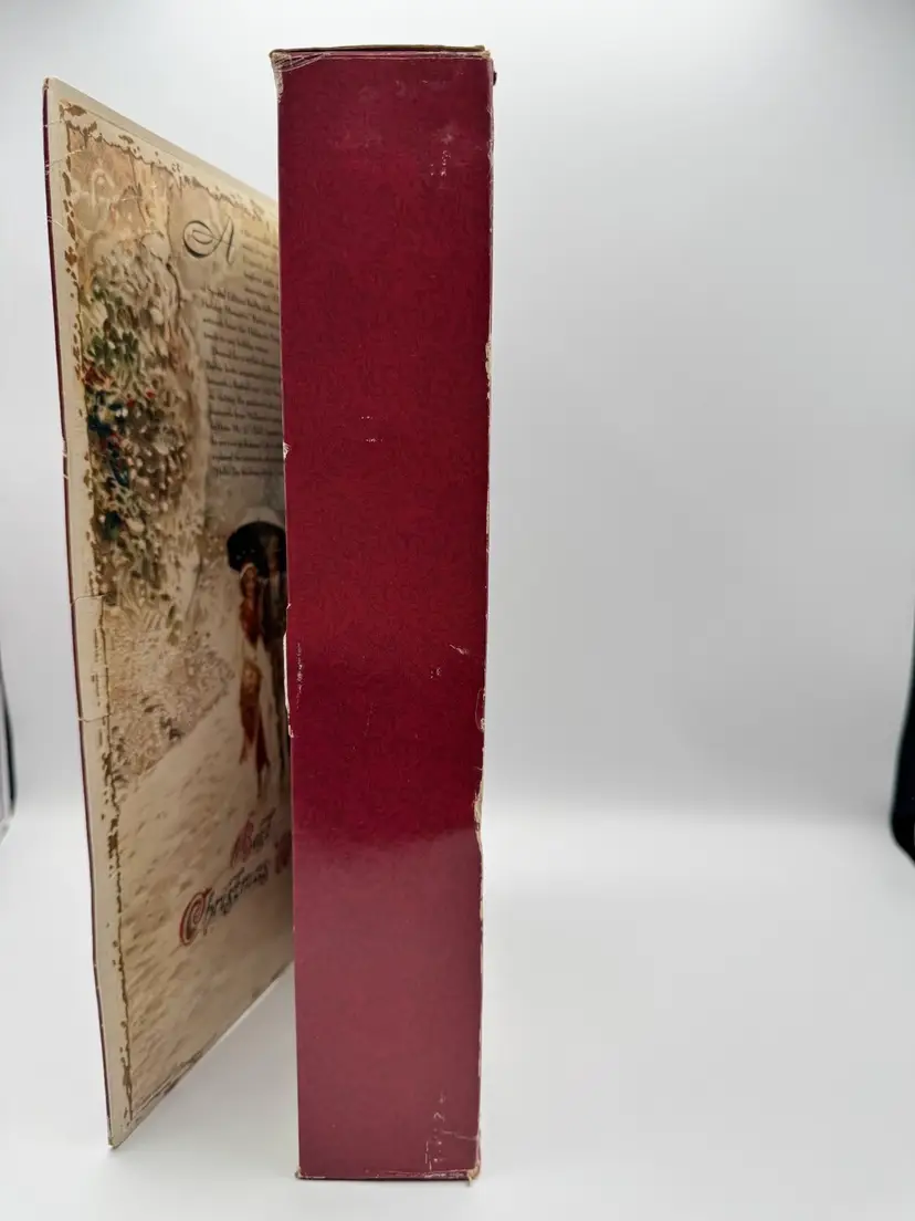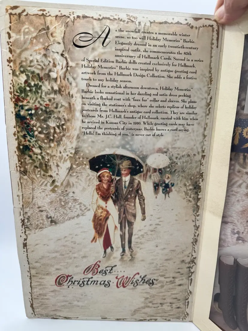 Packaging: Storybook-style display, interior winter scene background art, and matching holiday illustration and text printed on the inside cover; includes miniature Hallmark greeting cards accessory beside the doll.