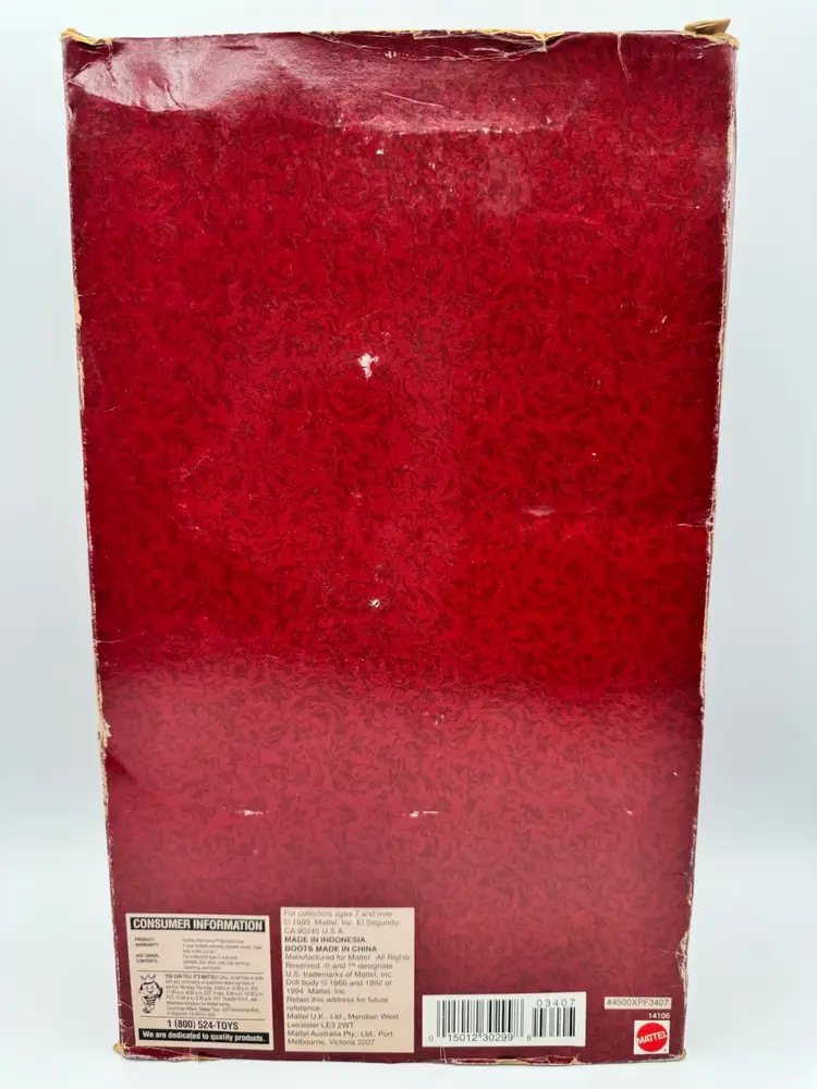Style: Vintage 1990s Christmas 1910 themed fashion doll wearing a long red gown with white brocade coat, faux fur muff and sleeve cuffs, and a white satin hat accented with a holly leaf and red jewel berry.
