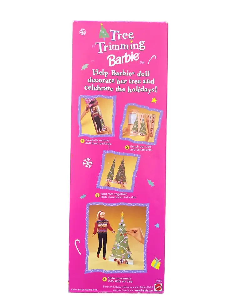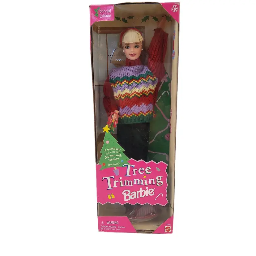 Spread the holiday cheer with Barbie! This1998 Tree Trimming Barbie comes sporting her sassy Ugly Christmas sweater and a festive Christmas tree for you to decorate and make your own. With her long blonde hair and included brush, she's the perfect companion for a merry Christmas. Let's get this holiday party started! 🎄🎅