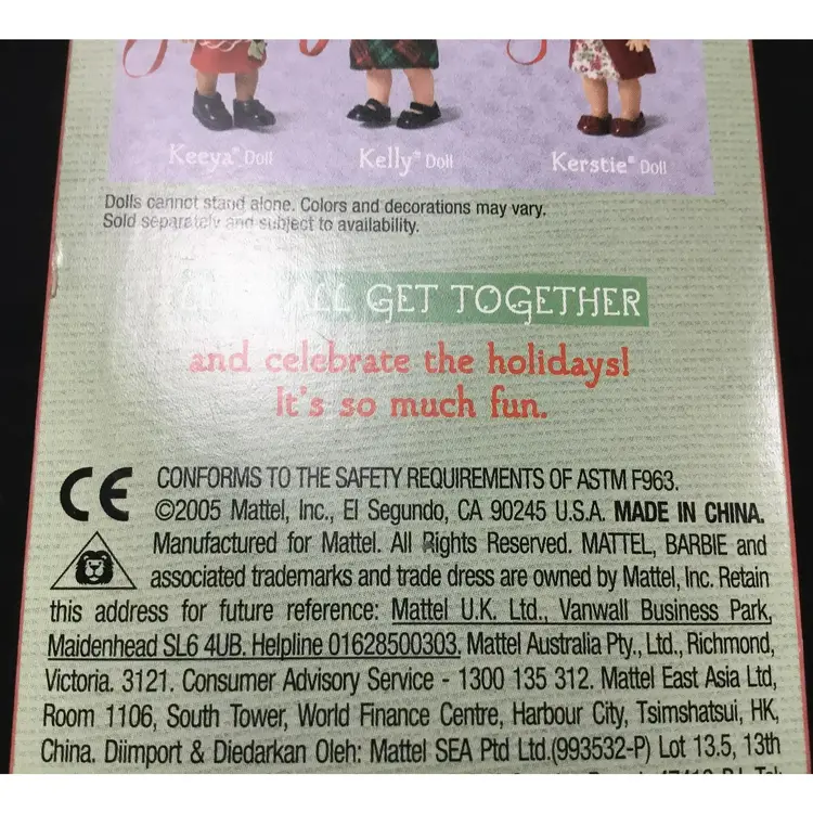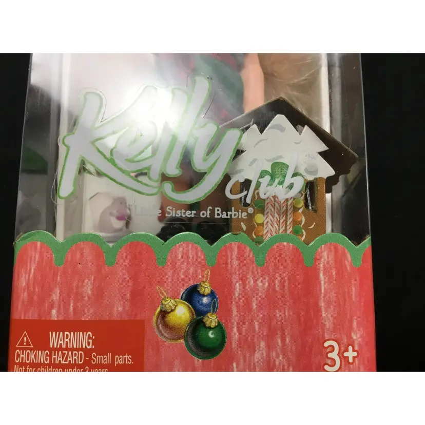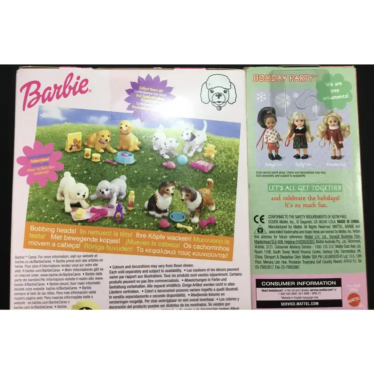 4 inch tall Kelly doll, (Barbie's little sis) in Holiday Party outfit. Black velvet top with red, green, black plaid skirt, black shiny shoes.Kelly has a paper gingerbread house with her. Barbie's dogs are plastic, bobble head dogs, one with pink collar and bows on her ears, one with purple collar. Dogs come with accessories, shampoo, hair dryer, brush, towel, spray. All new in original boxes.