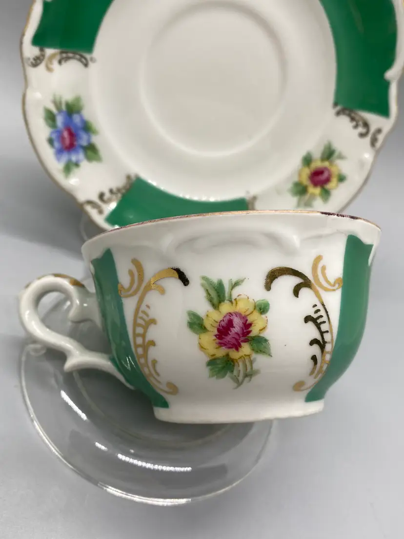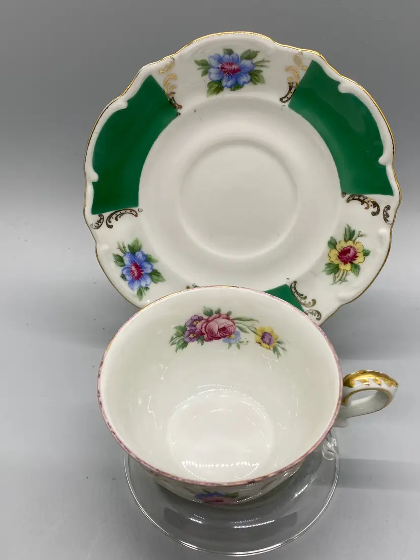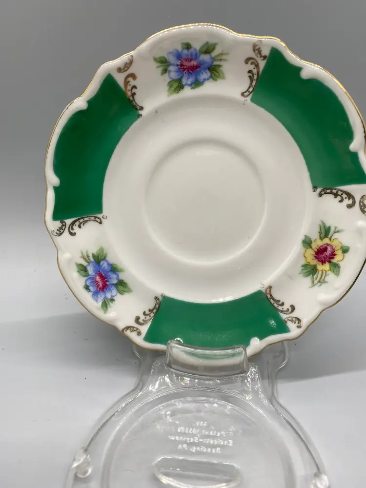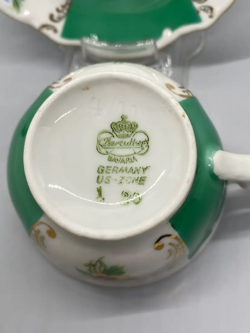 Vintage Bareuther Bavaria Demitasse size hand painted green & white gold accents floral bouquet hand wash saucer-4.5" wide cup-3" wide plastic stand included