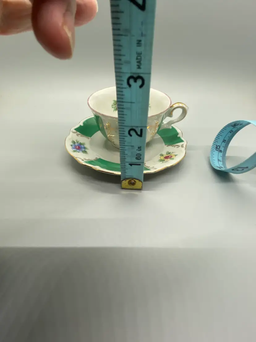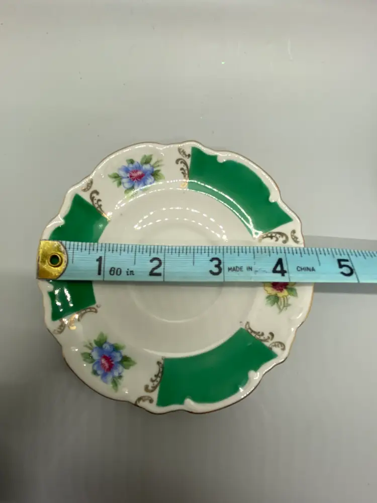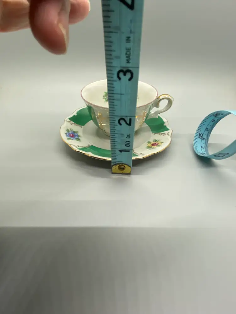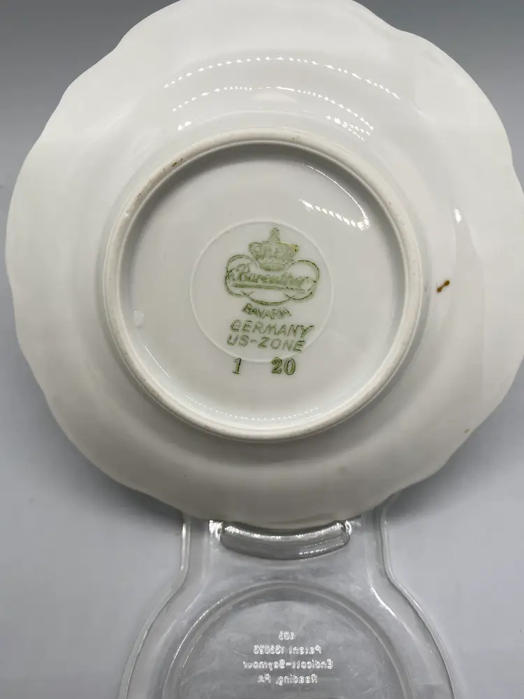 Vintage Bareuther Bavaria Demitasse size hand painted green & white gold accents floral bouquet hand wash saucer-4.5" wide cup-3" wide plastic stand included