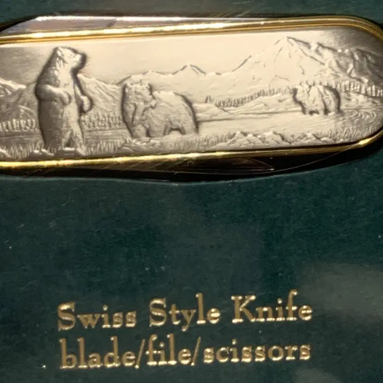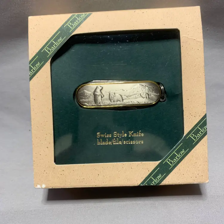 The Barlow Swiss Style Pocket Knife is a classic and collectible folding knife featuring a stainless steel blade with a bears and mountains scene. This ambidextrous knife has a manual opening mechanism and a slip joint lock type, making it practical for everyday use. The silver-colored knife includes scissors as one of its tools and has a sleek stainless steel handle, embodying both functionality and style. With its under 2.75-inch blade range, this original Barlow knife is a must-have for collectors and outdoor enthusiasts alike.
