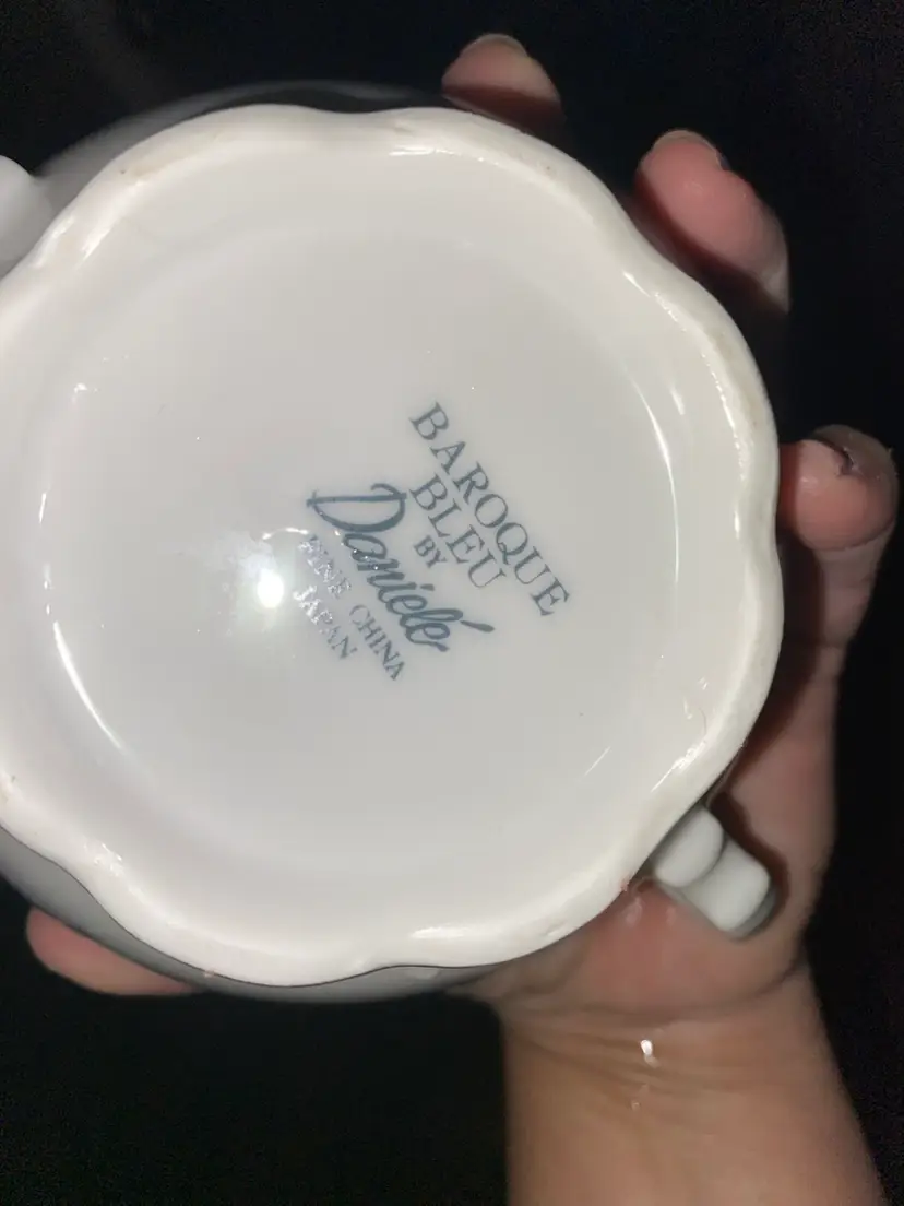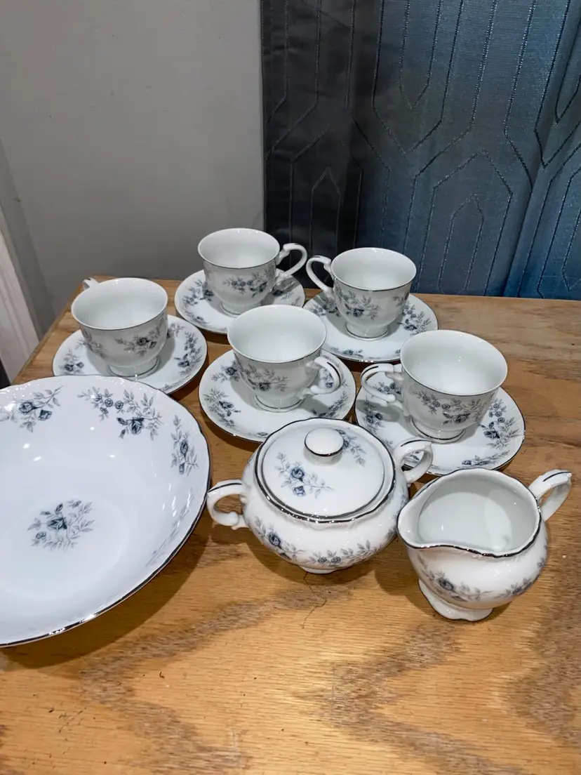 5 tea cups/ saucers, 1 serving bowl, sugar and creamer