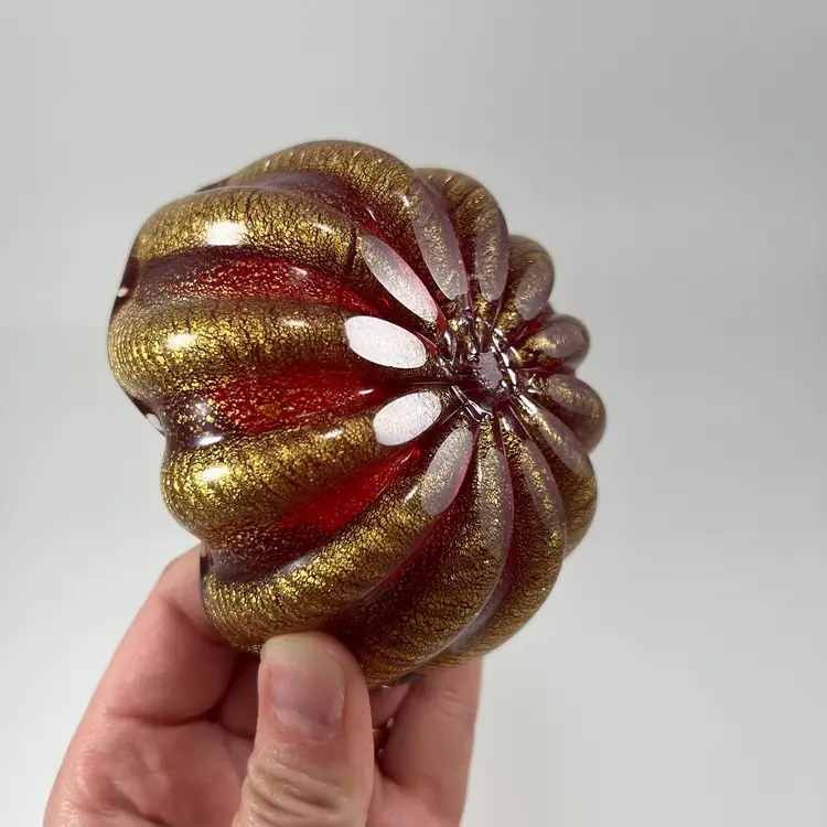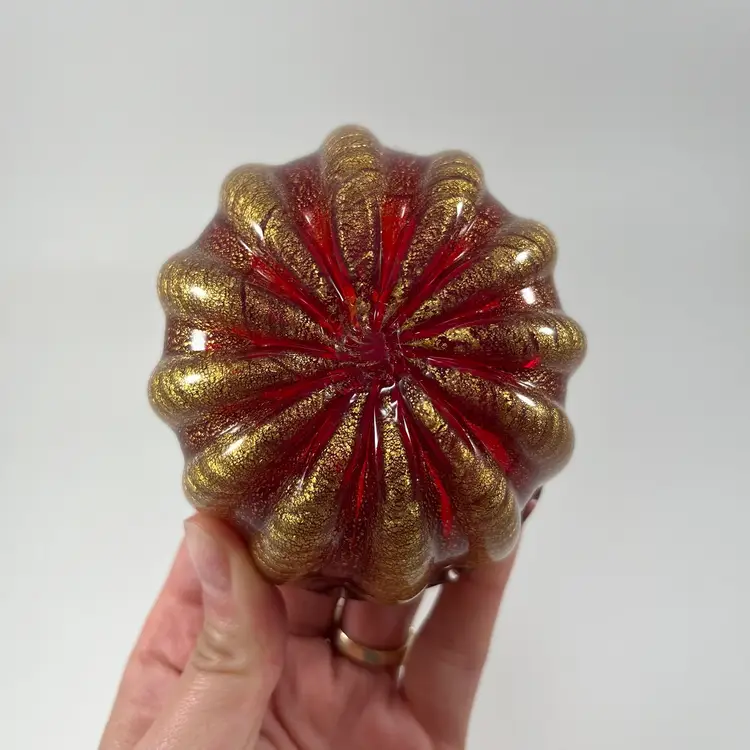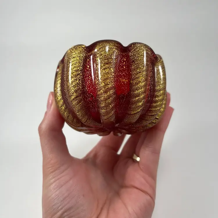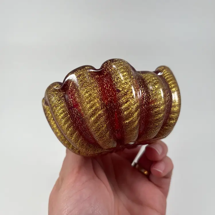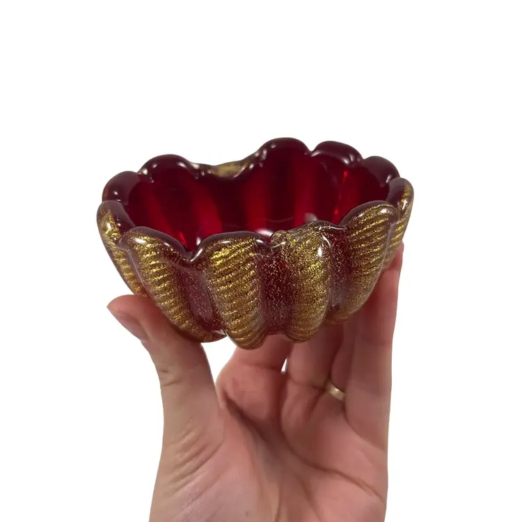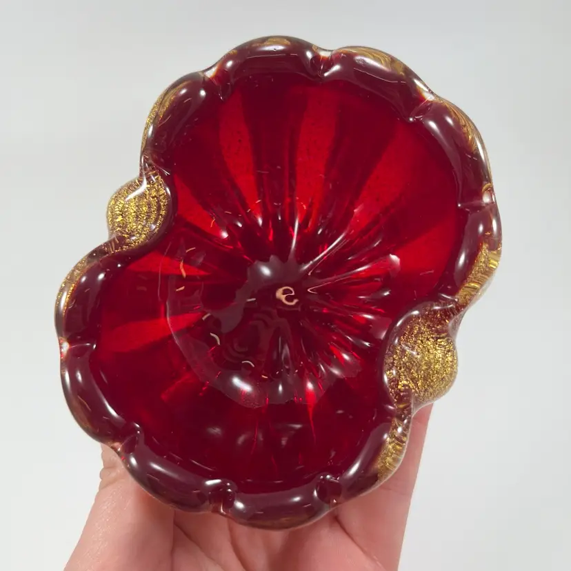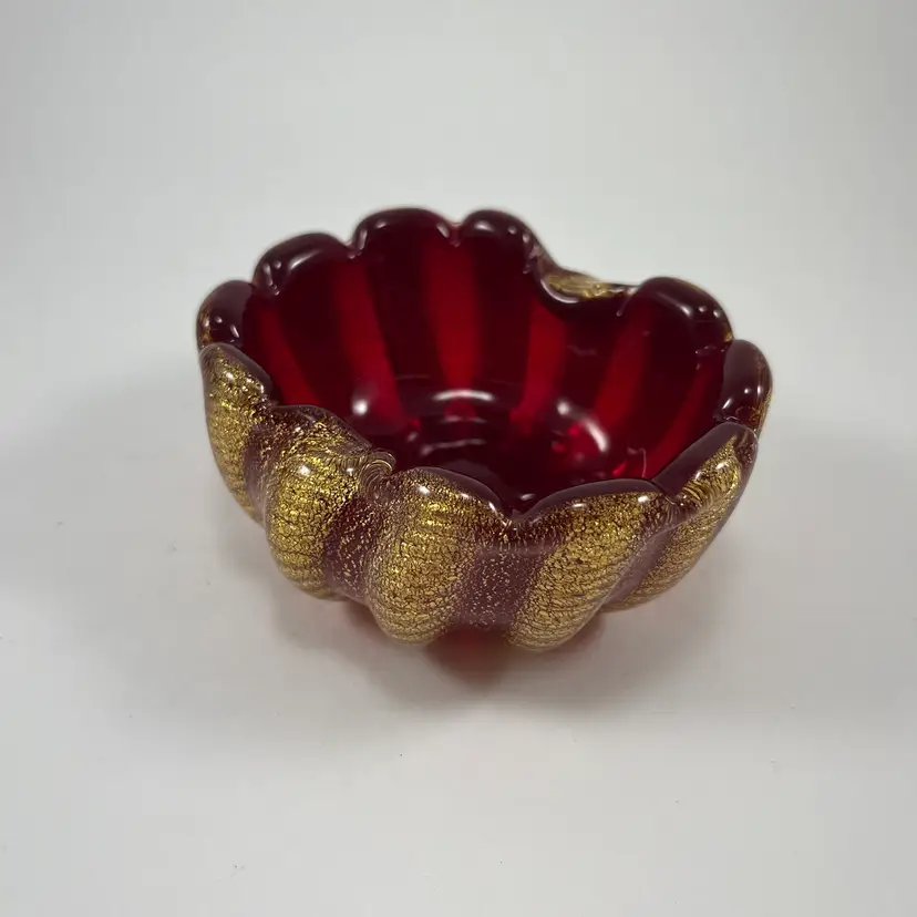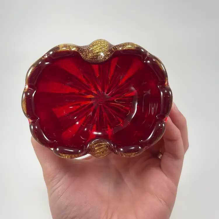 Approximately 3.75” x 3” x 1.75”. Great condition, no chips or cracks. Great display piece, especially for the holidays with classic colors! This Murano ashtray was probably made in the 1950s or 60s. Cordonato d'Oro was a technique used by Ercole Barovier and translates to “rope of gold”.