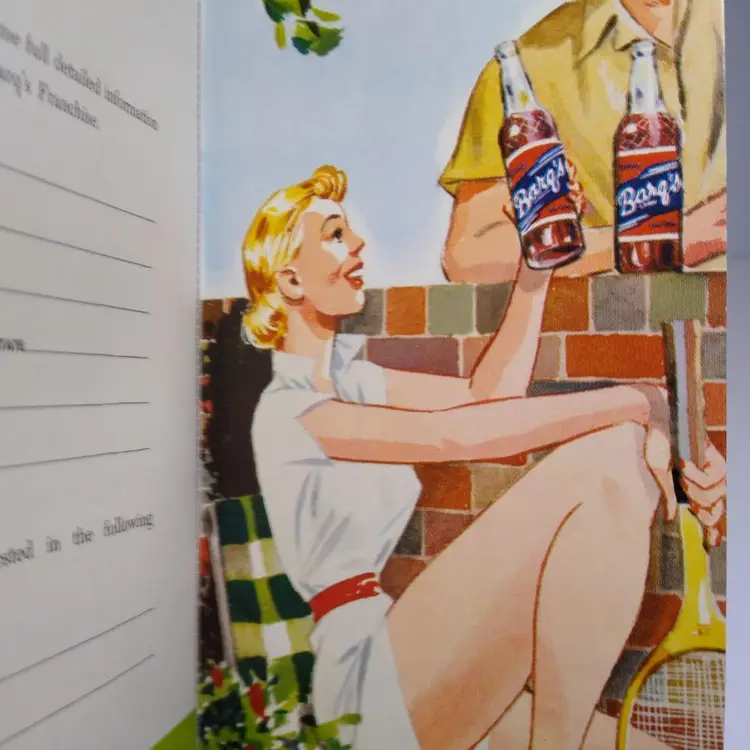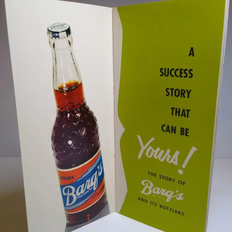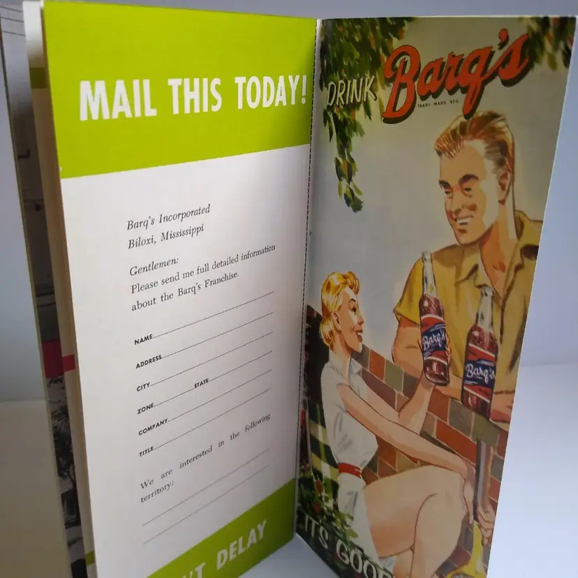 Original vintage promo sales flyer brochure for the Barq's soda beverage product line. Foldout brochure with many photos of old cars and buildings. Size is 4" x 9" and opens larger. Amazing clean unused old stock. Date inside October 25, 1956.