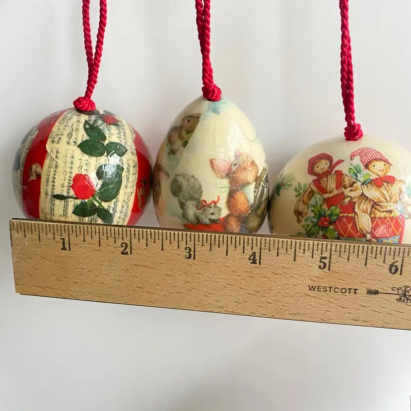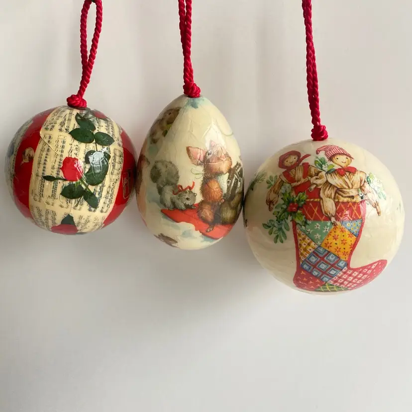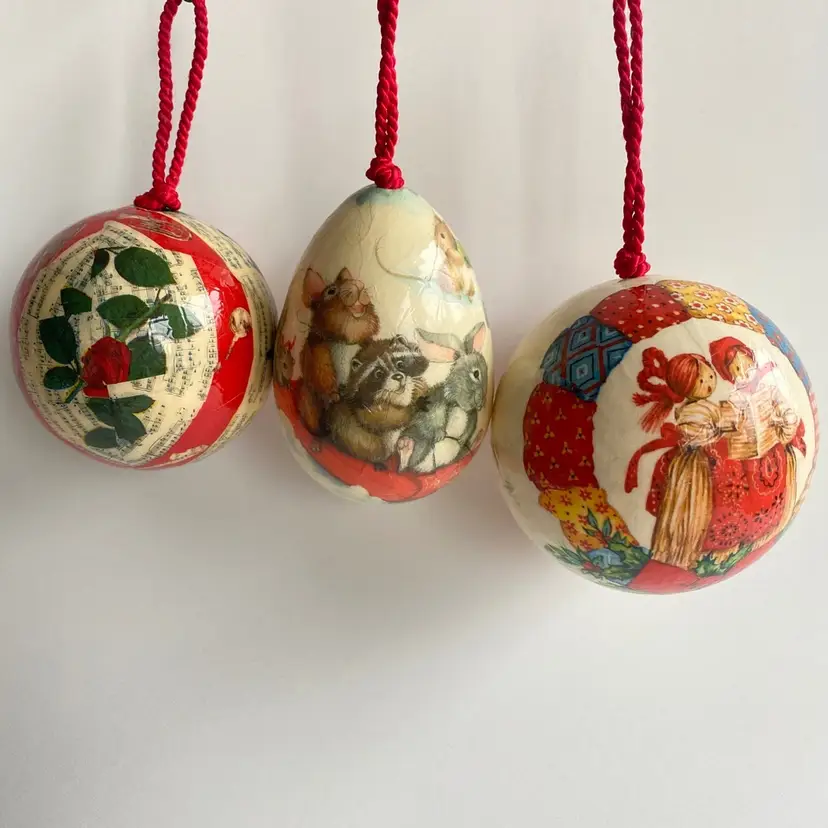 Set of 3, made in 1978, Barry Patch decoupage ornaments. Excellent vintage condition, brand stickers still attached to all 3.