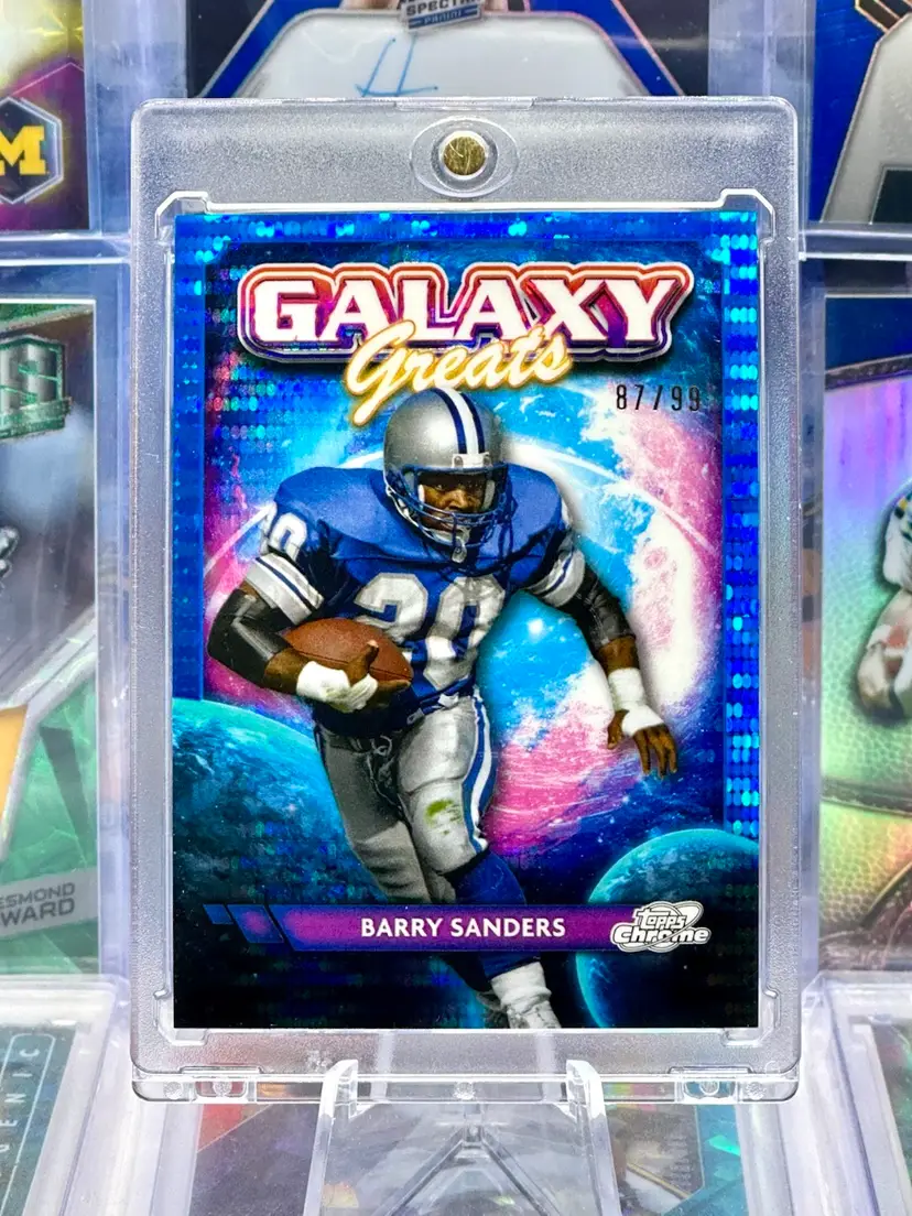 Barry Bary Sanders 2024 Topps Chrome Cosmic GALAXY GREATS Blue Pulsar Refractor Prizm COLOR MATCH Serial Number Numbered #’d #d /99 SP Short Print Insert Parallel Detroit Lions Oklahoma State Cowboys GO POKES! RB Running Back HOF Hall of Fame Offense Offensive Player Rare NFL Football Card
