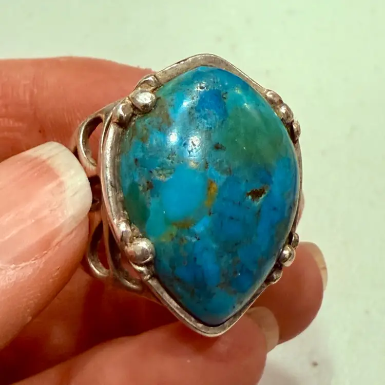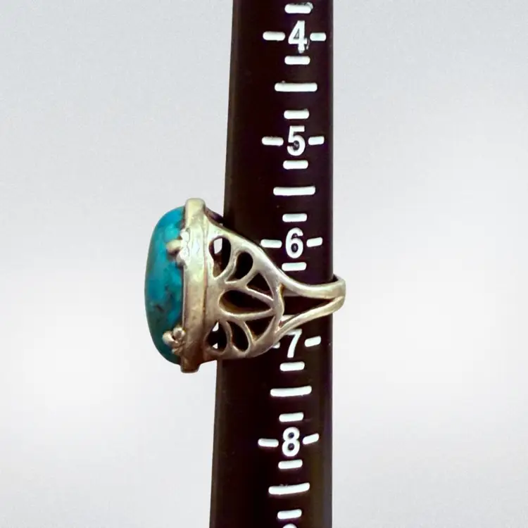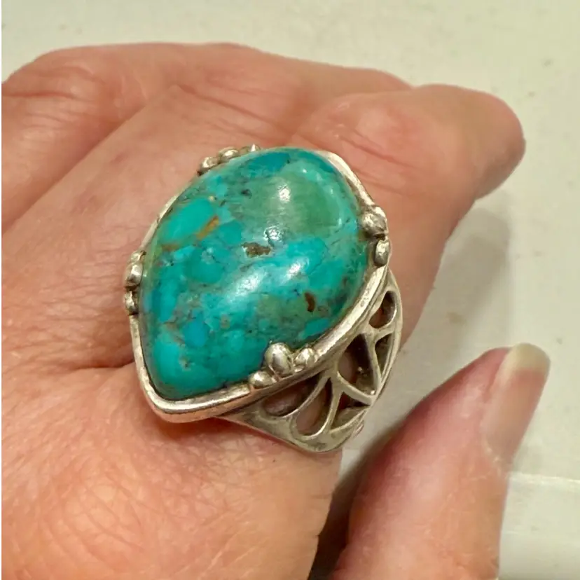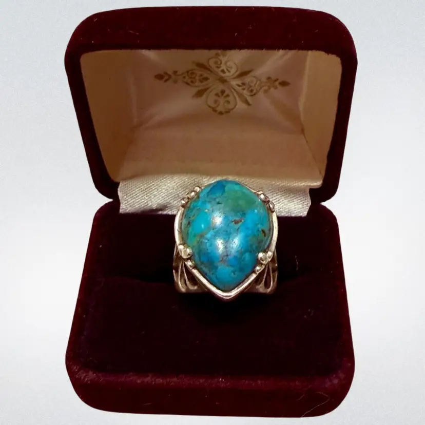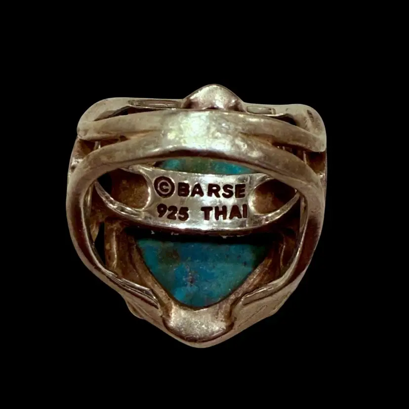 The Barse Designer Signed Southwest Sterling Silver Turquoise Teardrop Ring in size 6.75 is a beautifully crafted piece of jewelry with a Southwestern ethnic and regional style. The teardrop shaped turquoise stone, is set in 925 sterling silver and is hallmarked Barse. Ring weighs 15g.