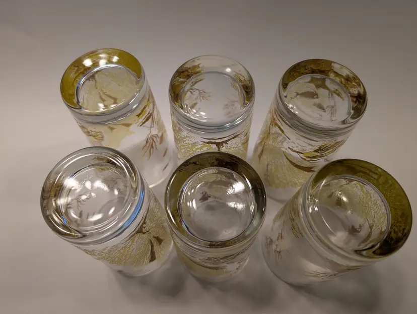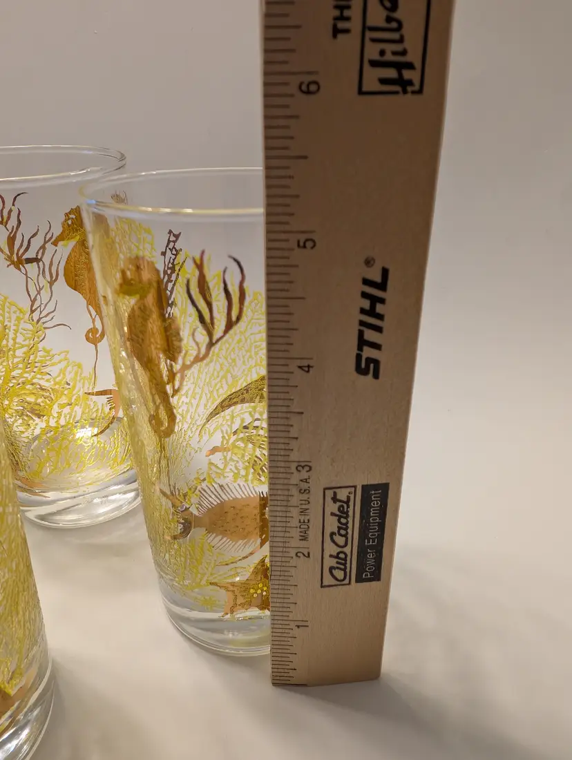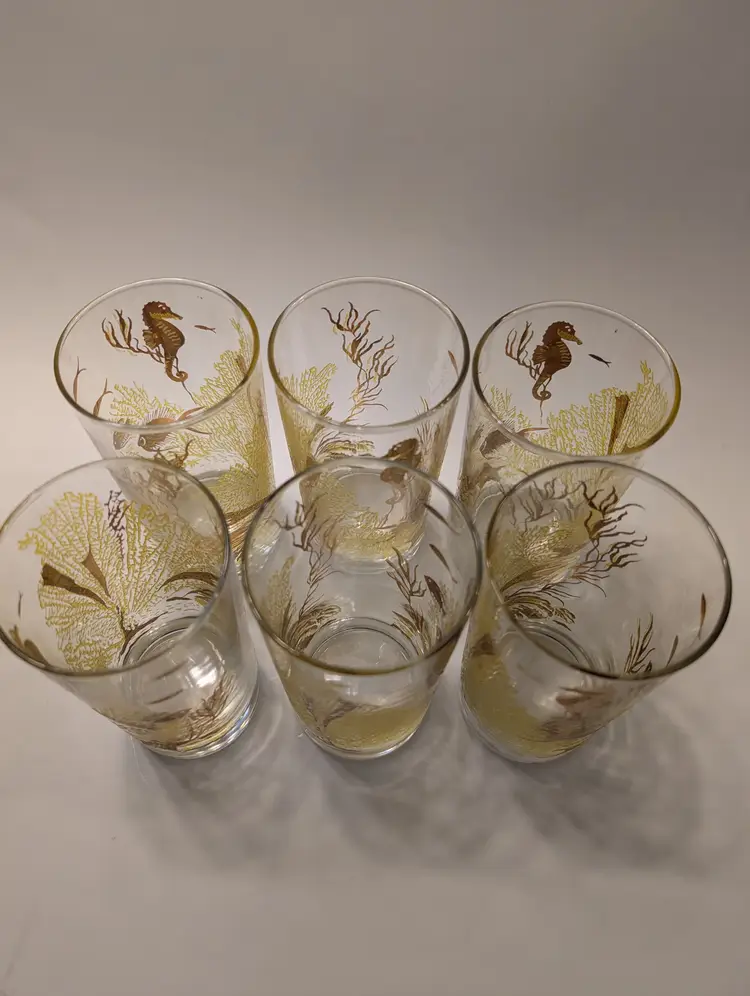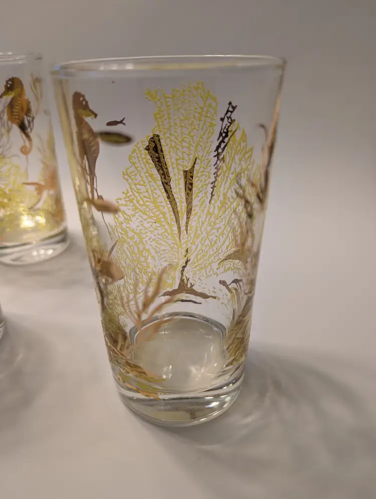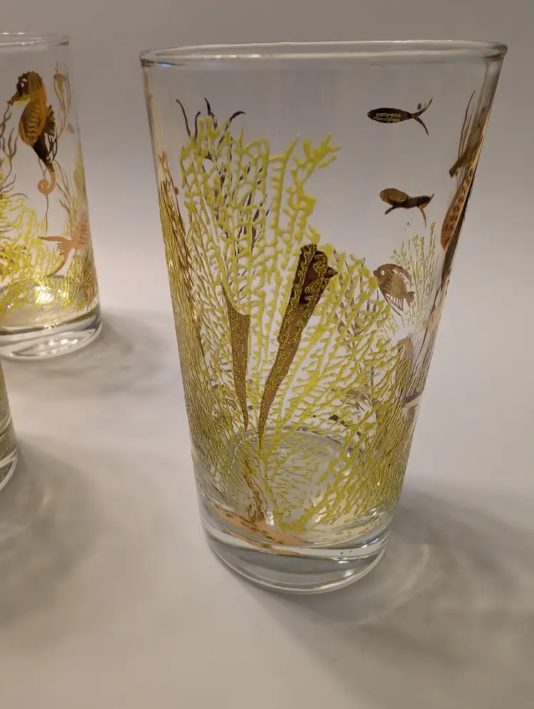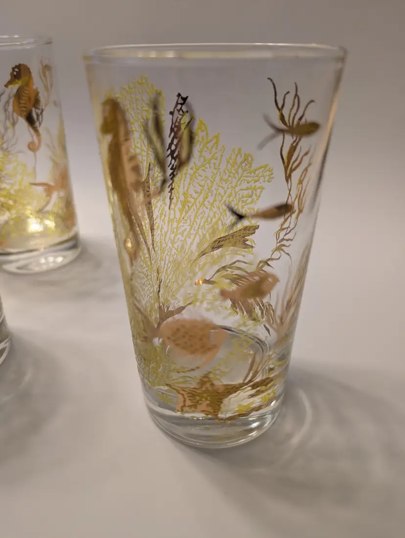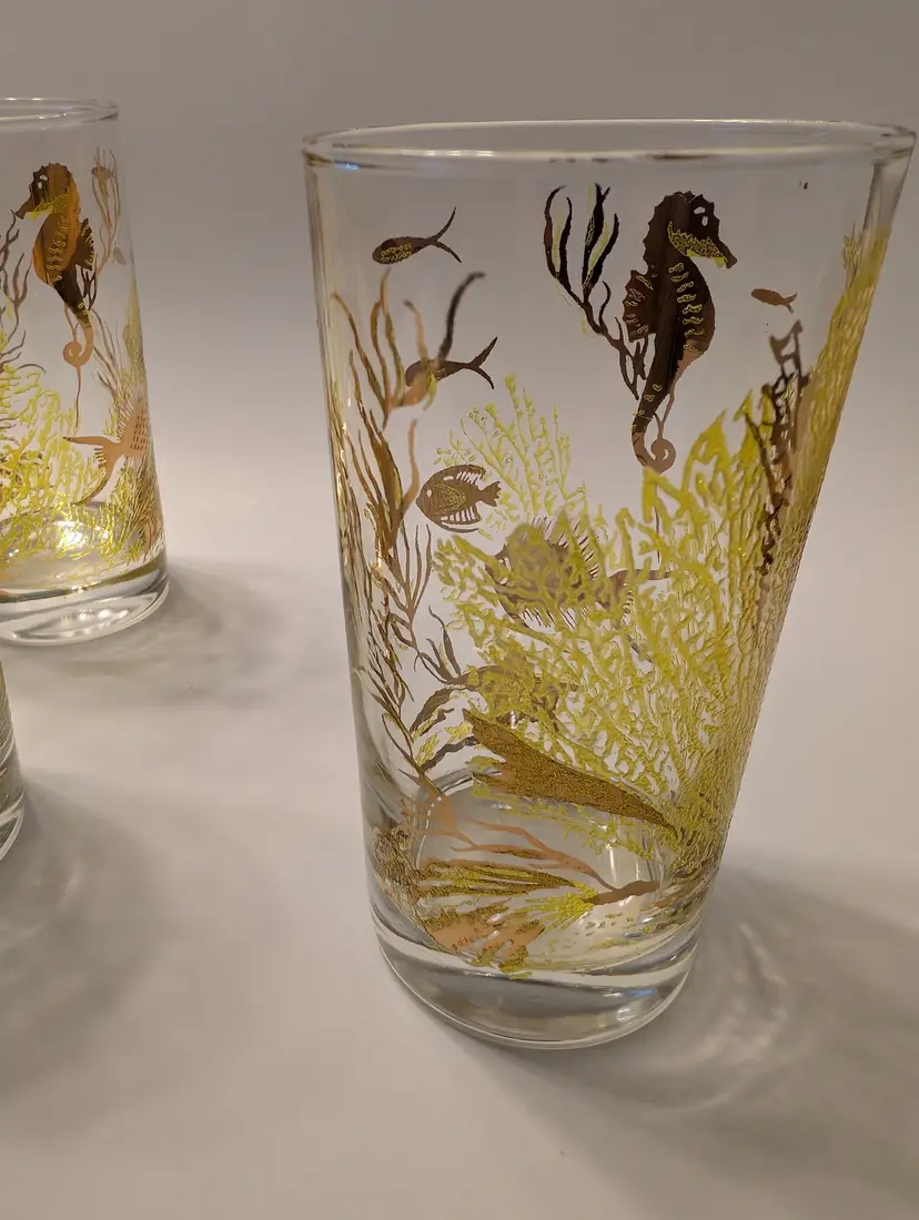 These 8 oz tumblers are fancy for barware or any occasion to impress your friends. 22 ct gold sea life. Set of 6. No chips or cracks in perfect condition