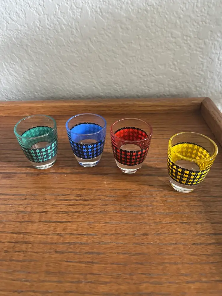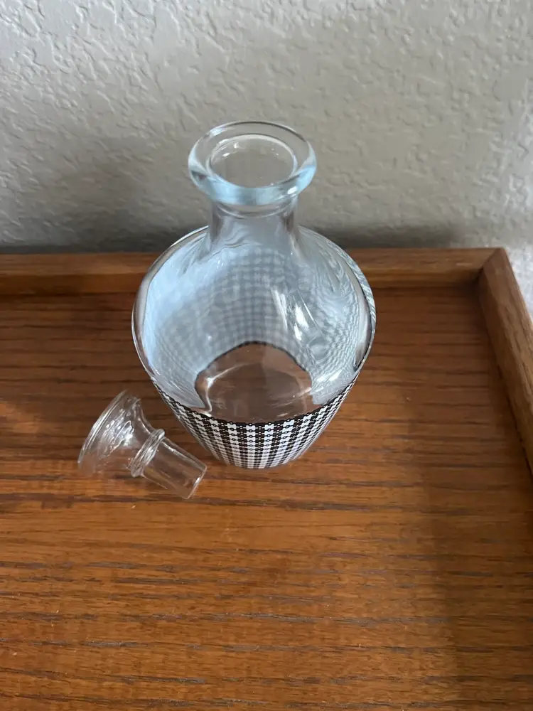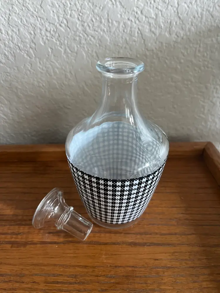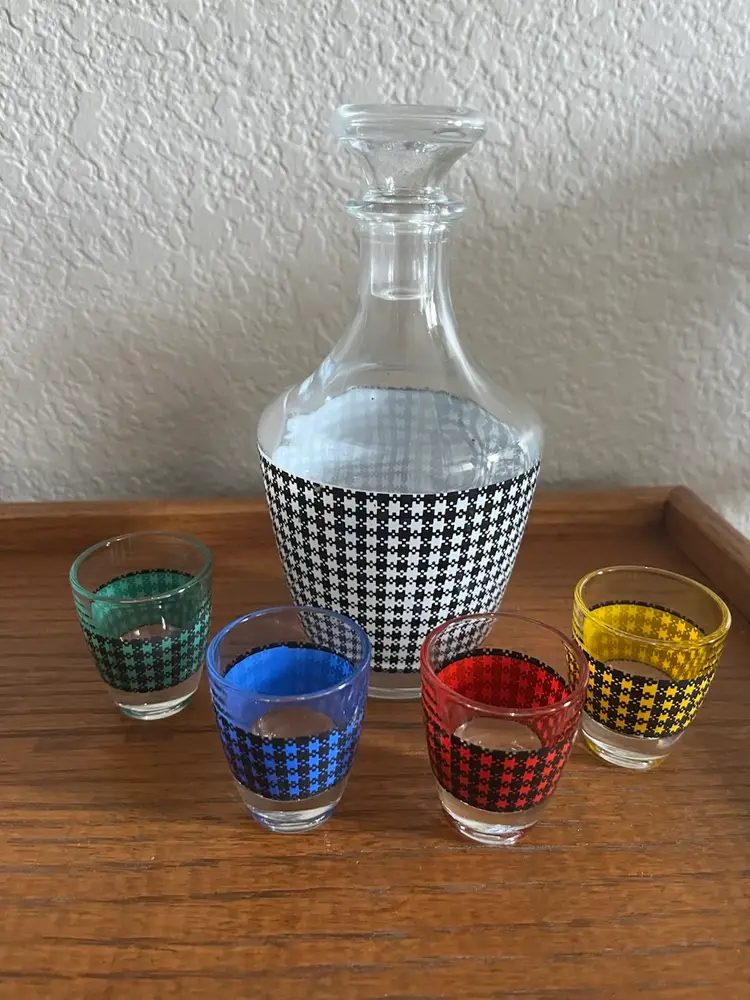 Vintage Cristal d'Arques decanter set with a houndstooth pattern, likely from the 1960s or 1970s. The set includes a decanter with a stopper and four shot glasses. Excellent condition with no chips or cracks. Decanter is 7” tall Shot glasses are 2” tall