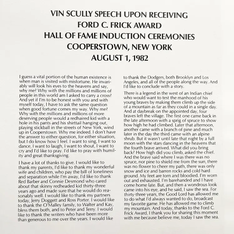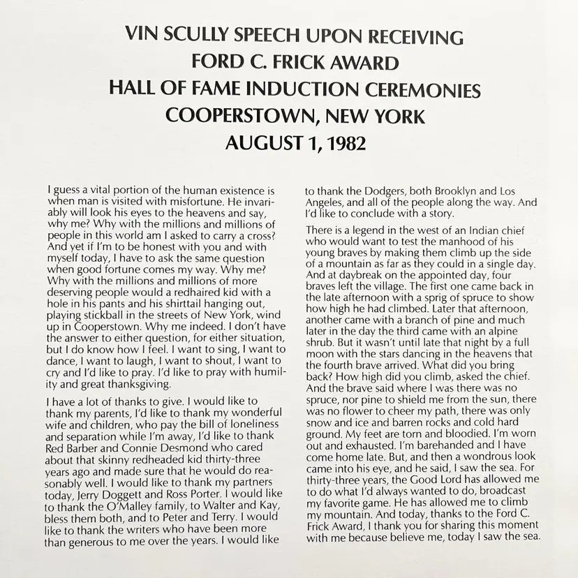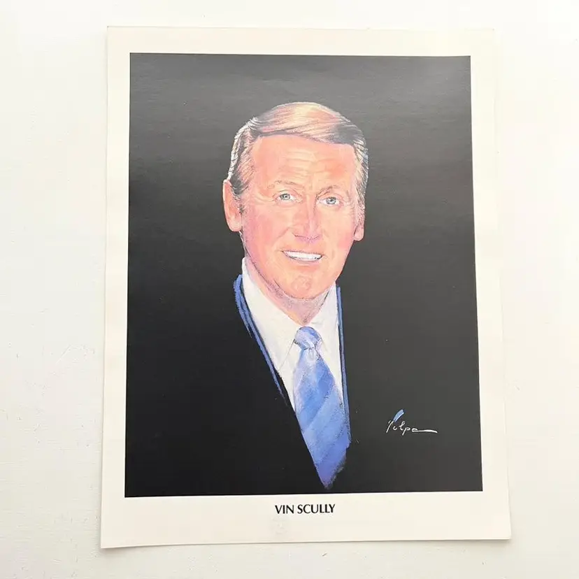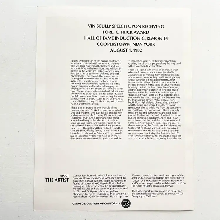 Baseball Hall of Fame Induction Vin Scully Dodger Portrait Vintage 1980s Vin Scully Speech Upon Receiving Upon Receiving Ford C. Frick Award Hall of Fame Induction Ceremonies Cooperstown, New York August 1, 1982 Artist: Nicholas Volpe Issued By Union Oil Company of California Condition: Good condition Measures 8-1/2 inches x 11 inches Packaged in a plastic sleeve inside a rigid envelope Visit my store to see more vintage ephemera, advertising, novelties, gifts, estate sale and yard sale finds https://district.net/u/finderspickerspaper SKU B31