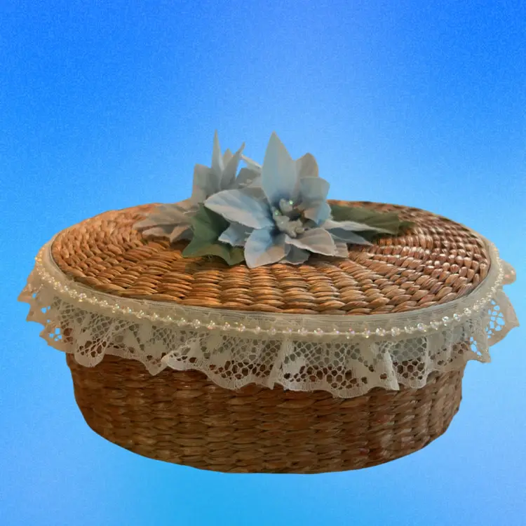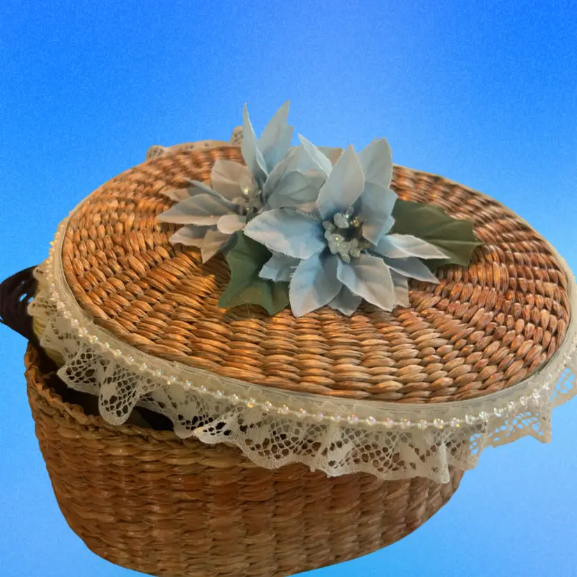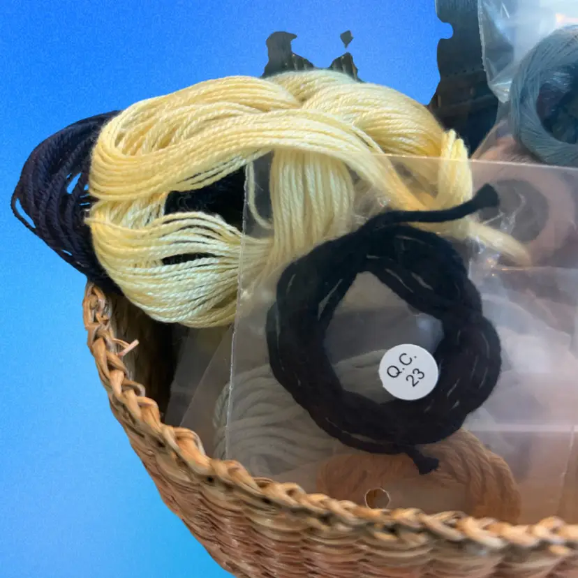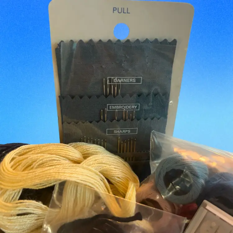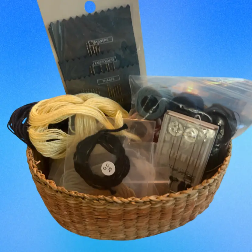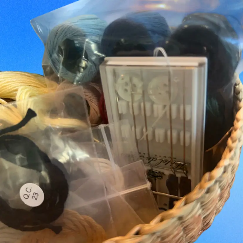 Needles, thread embroidery, thread, sewing kit, all neatly placed in a basket. Ideal for crochet, embroidery, needlepoint, and various craft projects.