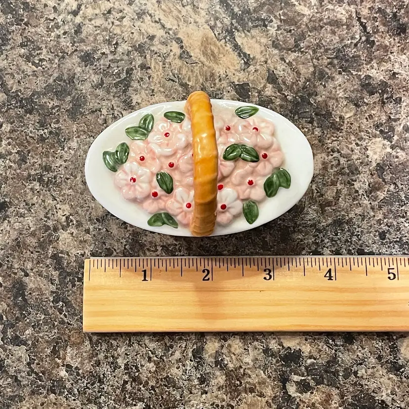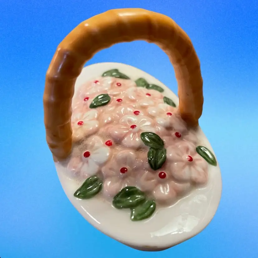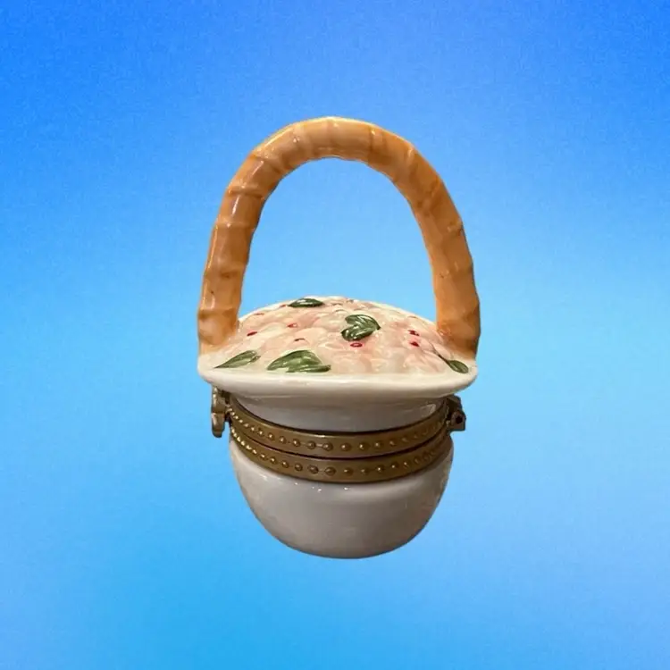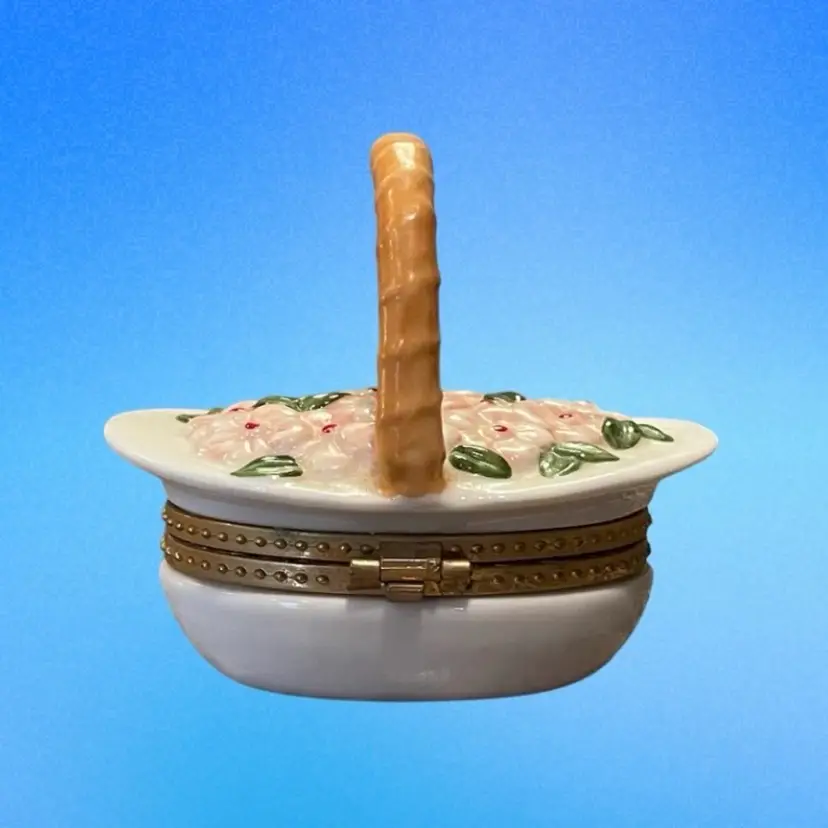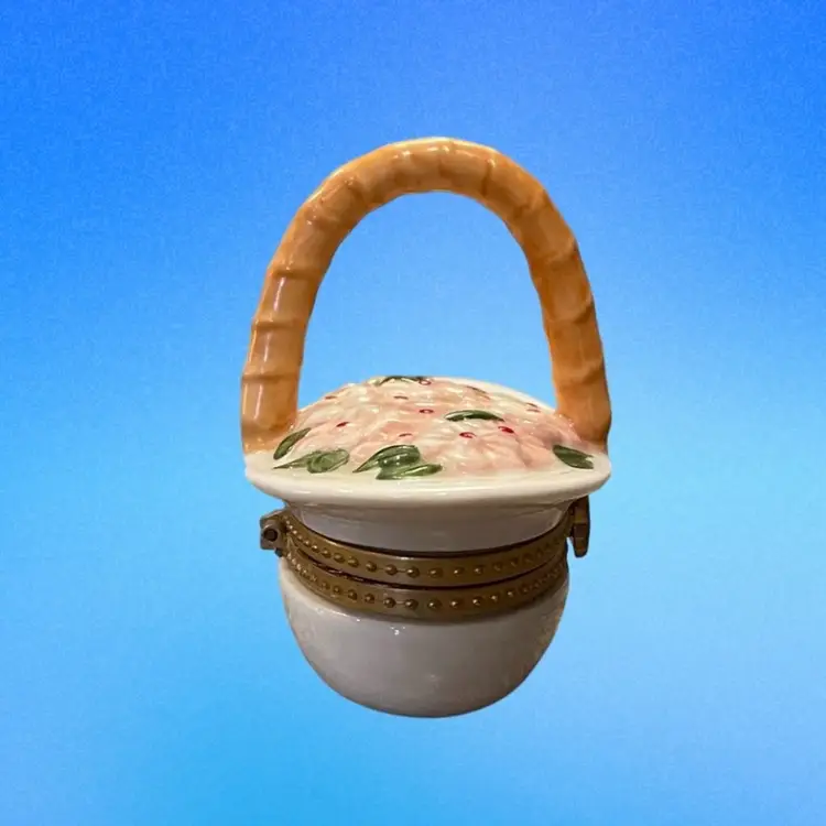 This is a vintage porcelain basket shaped trinket box with pink flowers on top. Measures approximately 3" tall x 3.5" long. No chips or cracks.