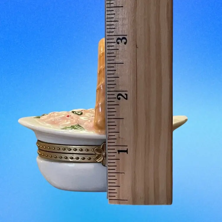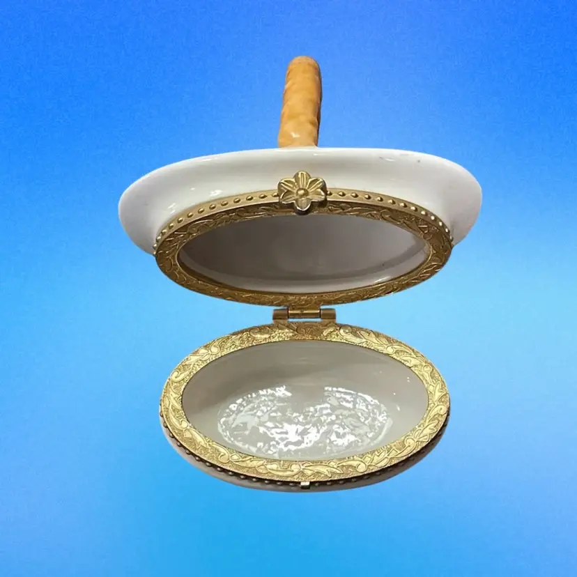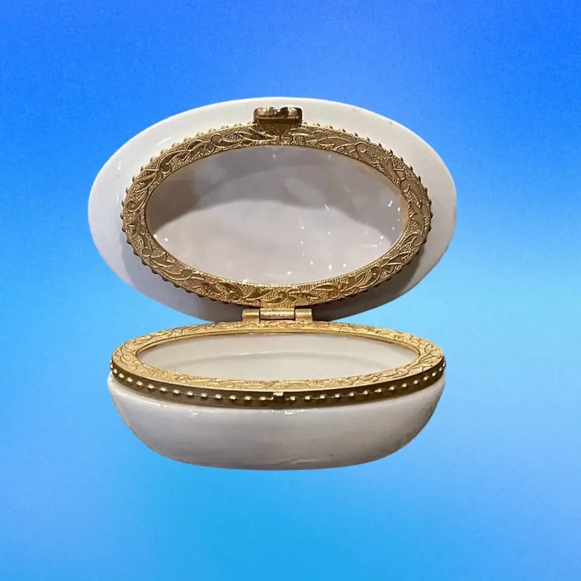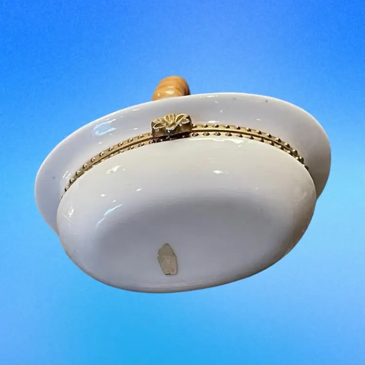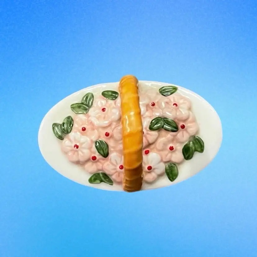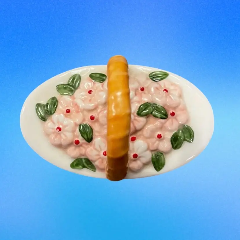 This is a vintage porcelain basket shaped trinket box with pink flowers on top. Measures approximately 3" tall x 3.5" long. No chips or cracks.