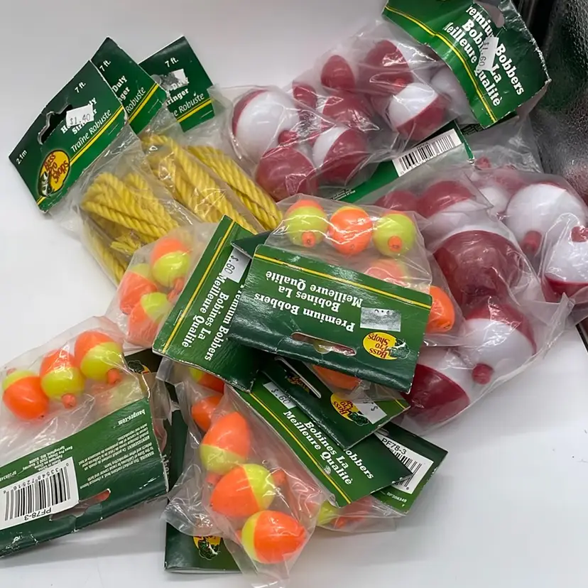 10 bags premium bobbers, orange and yellow, 3 per bag. 3 bags Premium bobbers, red and white different sizes, 10 per bag 7 foot heavy duty stringer times 3