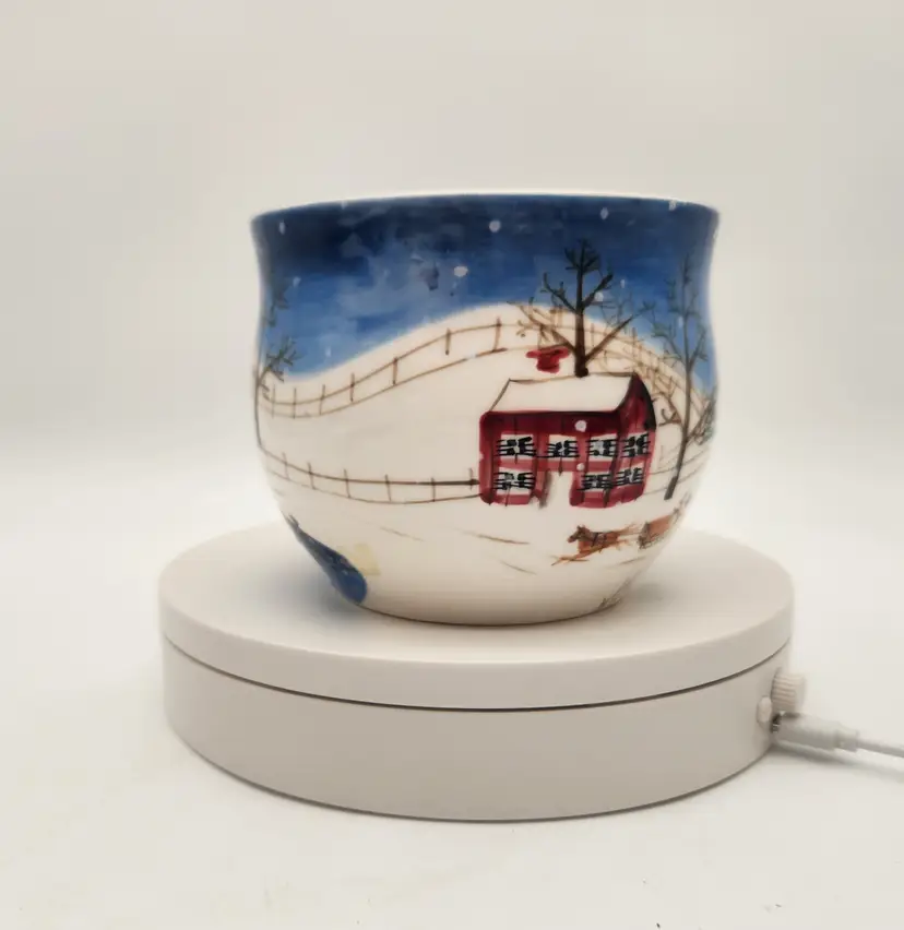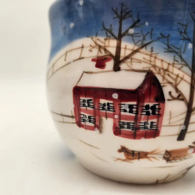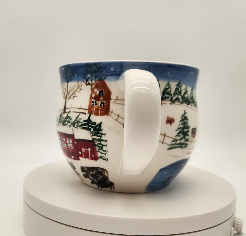 This is a whopper of a mug coming in at holding a full 24 oz. of the liquid goodness of your choice - it also would excel as the container for a gift of Holiday goodies! It's winter scene design makes it perfect for use all winter long. What's more - even with its size, it has a lovely shape with the body narrowing and the flaring out at the rim. Features: Dishwasher Safe, Microwave Safe, Suitable for Hot Beverages Measurements: 4 1/4" tall, 5 " diameter across the rim Like New Condition: no signs of wear. Keywords: Mistletoe Co mug, winter scene mug, holiday mug, Christmas mug, skating mug, farm scene mug, ceramic mug, coffee mug, tea cup, hot cocoa mug, dishwasher safe mug, microwave safe mug, gift idea, winter decor, countryside scene