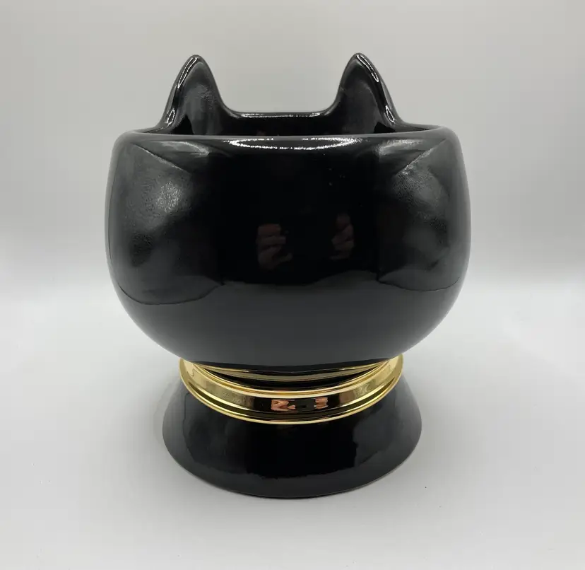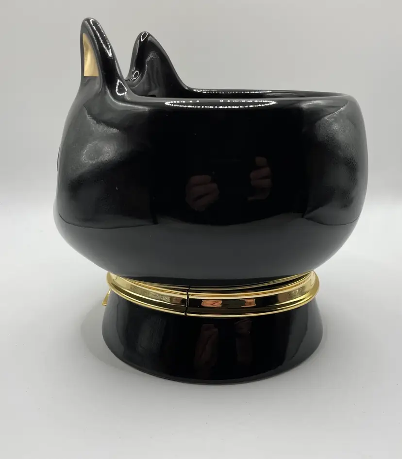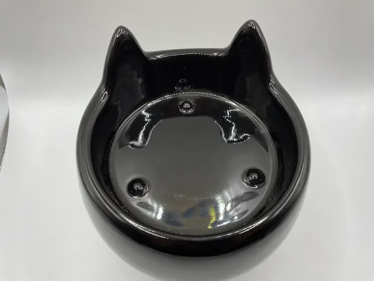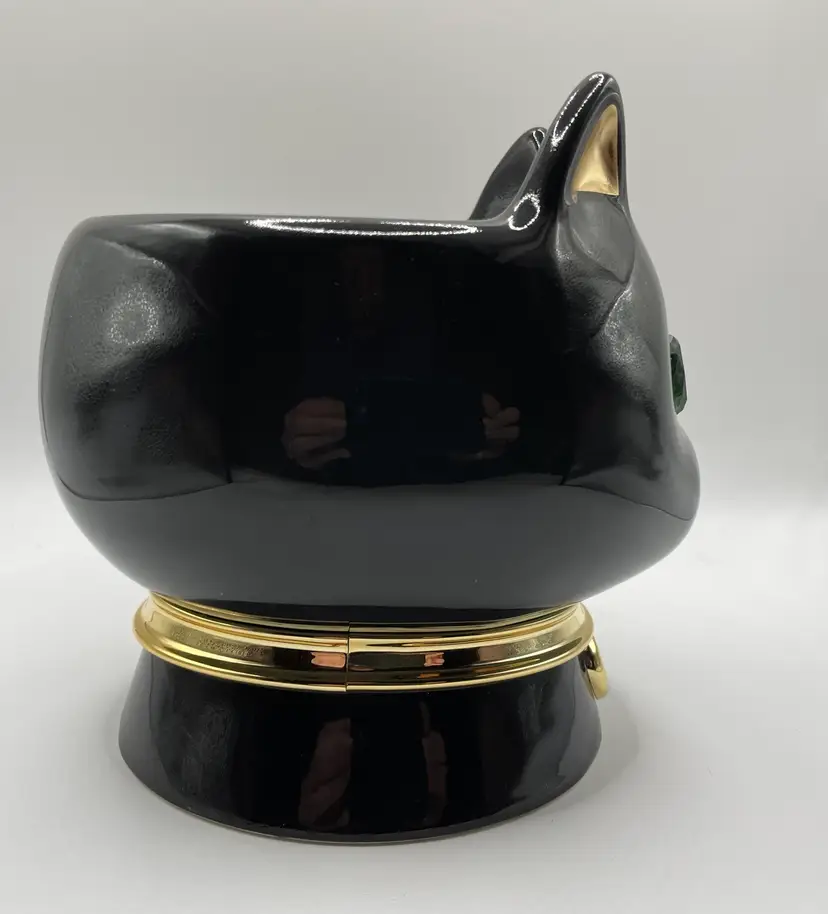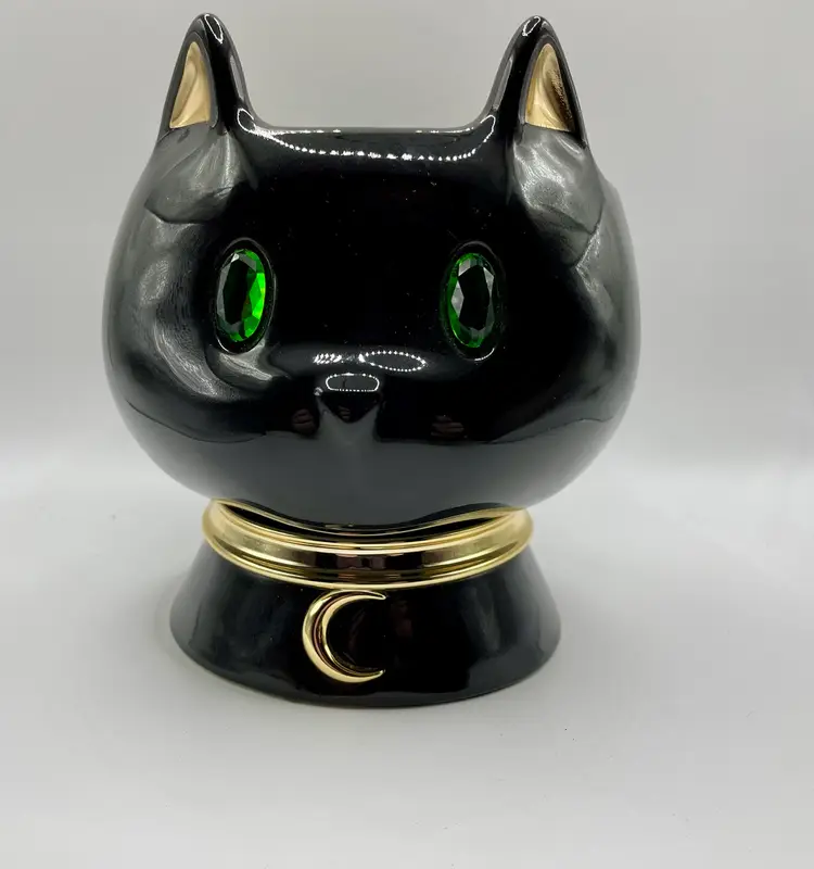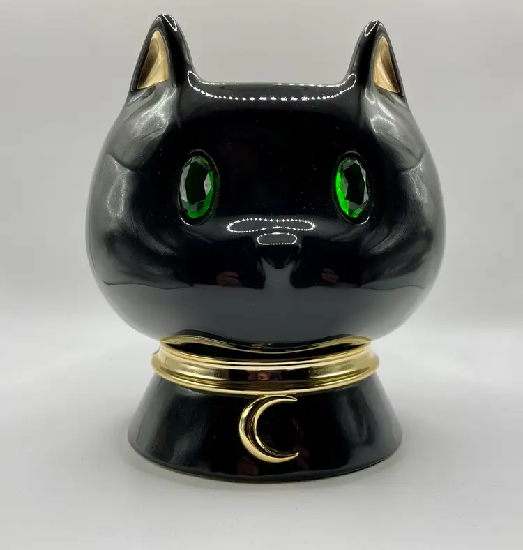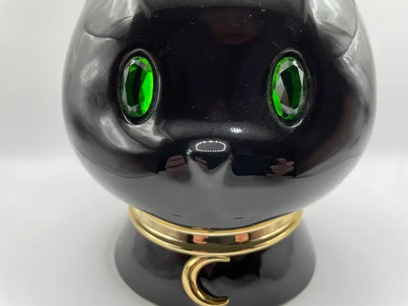 Glossy black. Green eyes. Gold accents. Felt bottom. No chips or cracks. Open box. No box.