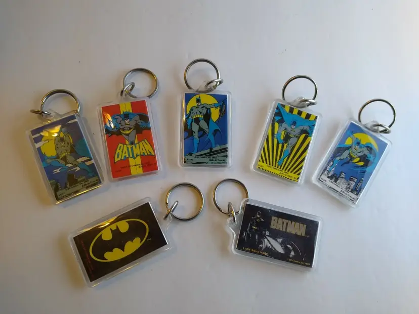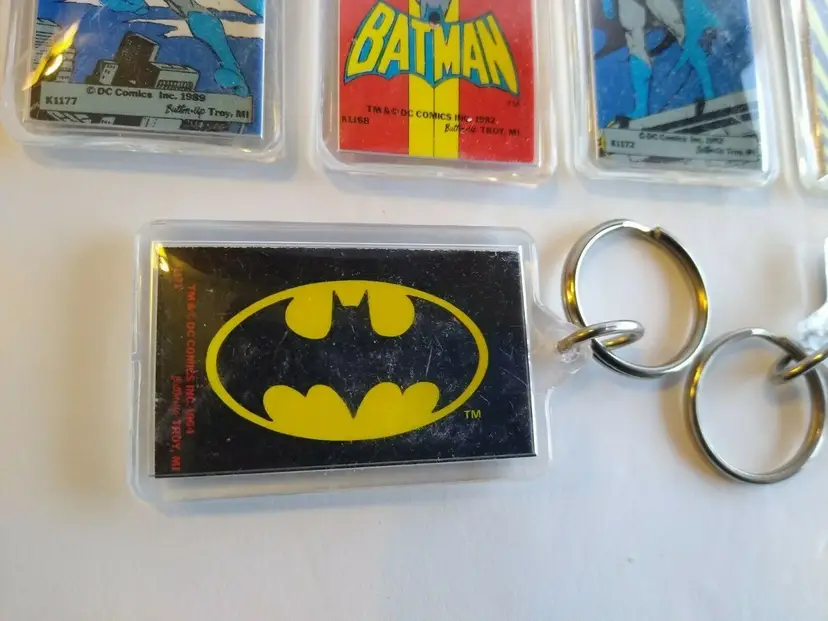 Vintage original lot of (7) all different 1982-1989 licensed official plastic Batman keychains. Double sided. Marked "Copyright DC Comics, Inc. 1964, 1982 or 1989 and "Button-up" on the bottoms. All will have surface scuffs on the outside of plastic cases for years of storage. The Bat Signal one as a 1964 date. Each is 3.5" x 1.25" size.