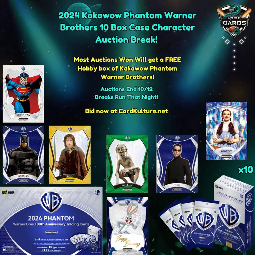 You are bidding on all the cards of the character listed in the title in this case break of 2024 Kakawow Phantom Warner Brothers (10 boxes)! Case will be opened LIVE after auctions end. Opening will be viewable & simulcast on CardKulture District as well as No Flo Cards YouTube and Twitch. US Shipping is $5.99 for your first auction spot won; each spot after that is only 25¢ and triggers your stacked-break shipping! Any spot won where no cards of the character are found in the box will receive a bonus card or pack from No Flo Cards. Any multi-player character cards will be split as fairly as possible between the spots of the characters depicted on the card unless they have a separate spot. Any hit pulled (Buybacks, Sketches, unlisted Case Hits etc) of a character who is NOT listed in the auction will be assigned by draw between all participants. Any dual or multi-player #'d or auto cards featuring multiple players will be assigned live between the spots depicted on the card if there is not a separate spot for that card. Most spots won will receive a sealed box of 2024 Kakawow Phantom Warner Brothers! For more information about the checklist, sell sheet, card images, etc. Please check out the NoFlo Discord channel titled "Kakawow Warner Brothers info." Link to discord: No Flo Nation Discord.