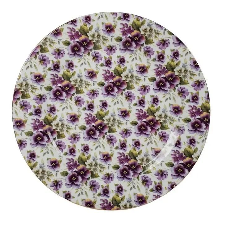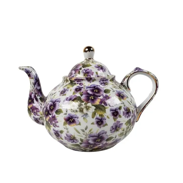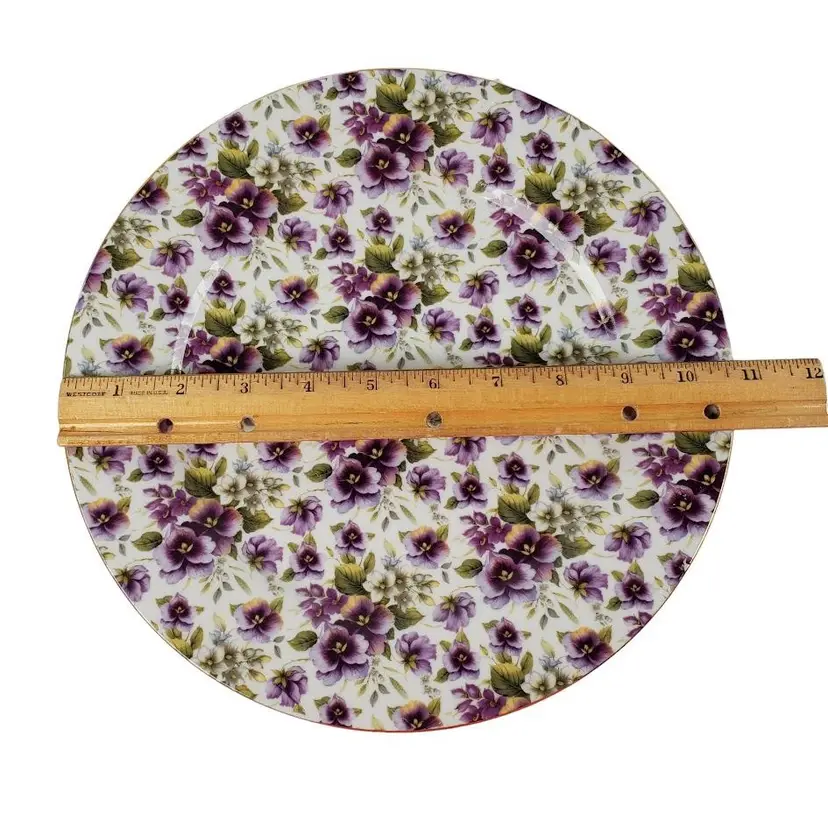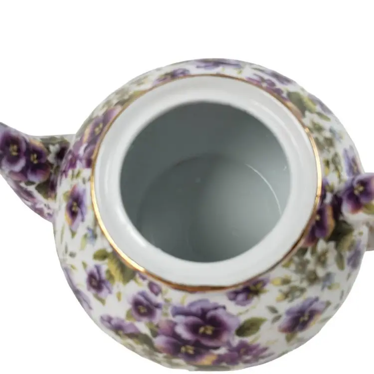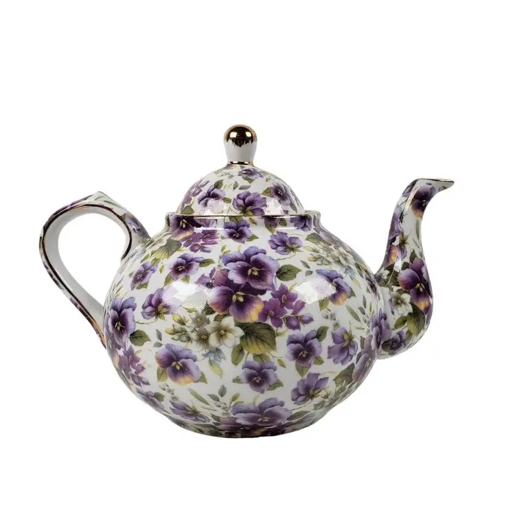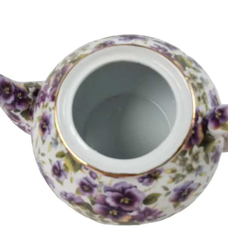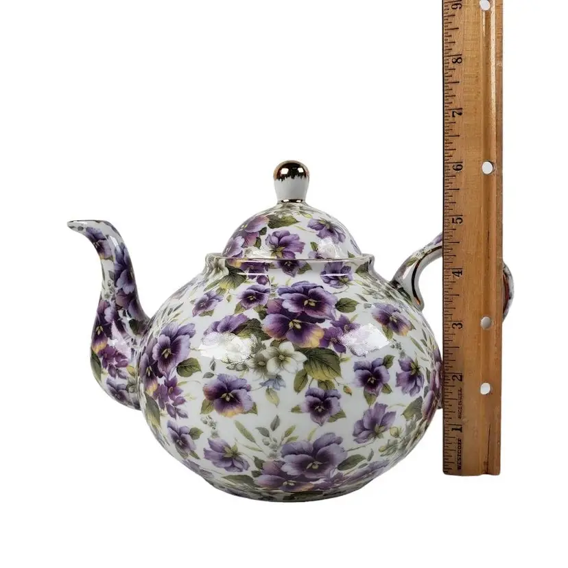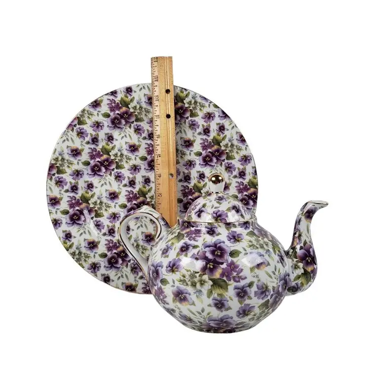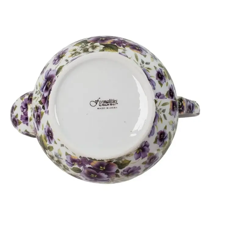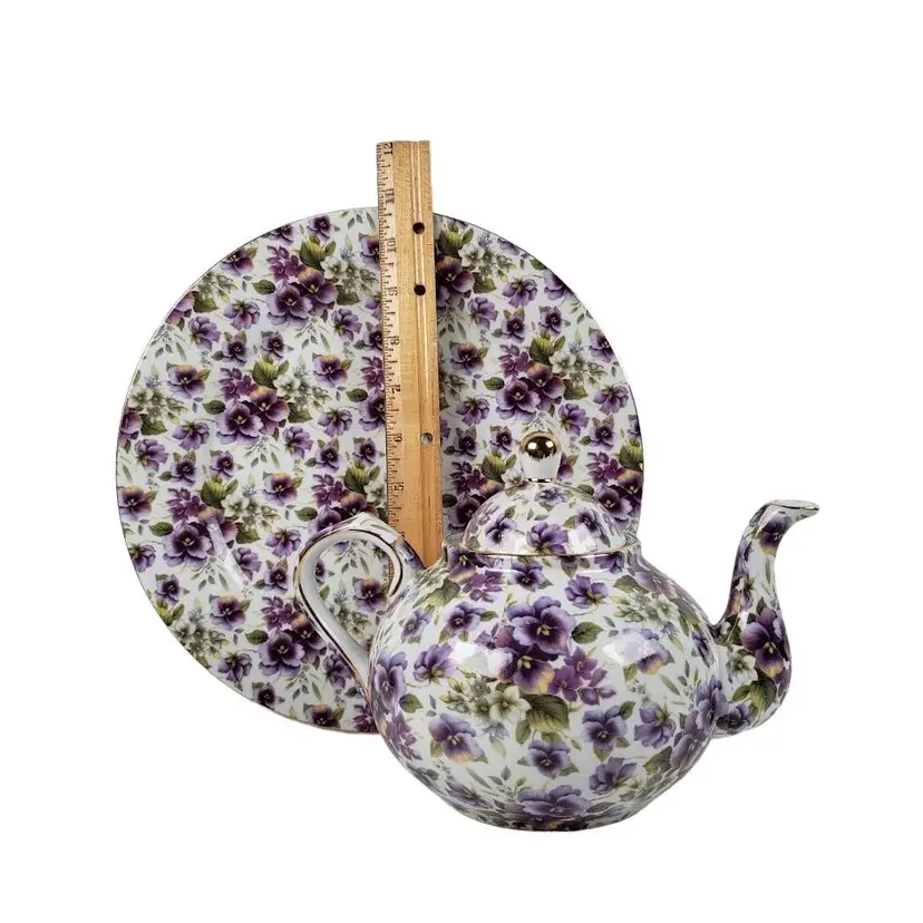 Vintage Baum Brothers Formalities Teapot with matching Cookie Plate Chintz transferware Purple violet pattern Both pieces have hand painted gold trim along the edges Thick porcelain Plate - 10 3/4" diameter Teapot - 6" tall Condition - No chips, nicks, cracks. Small spot of rub-off of gold on lid knob. See photos.