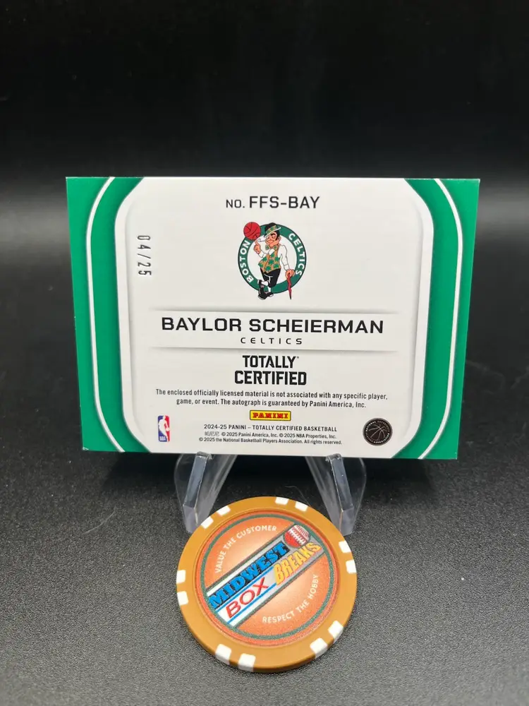 2024 Totally Certified RPA of 3-point sharpshooter Baylor Scheierman of the Boston Celtics. #4/25. One corner is dinged, see picture.