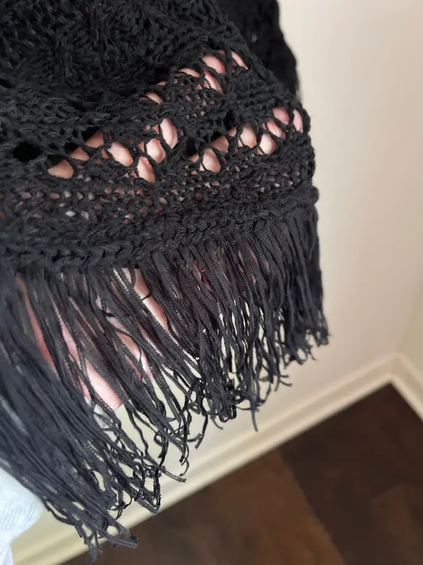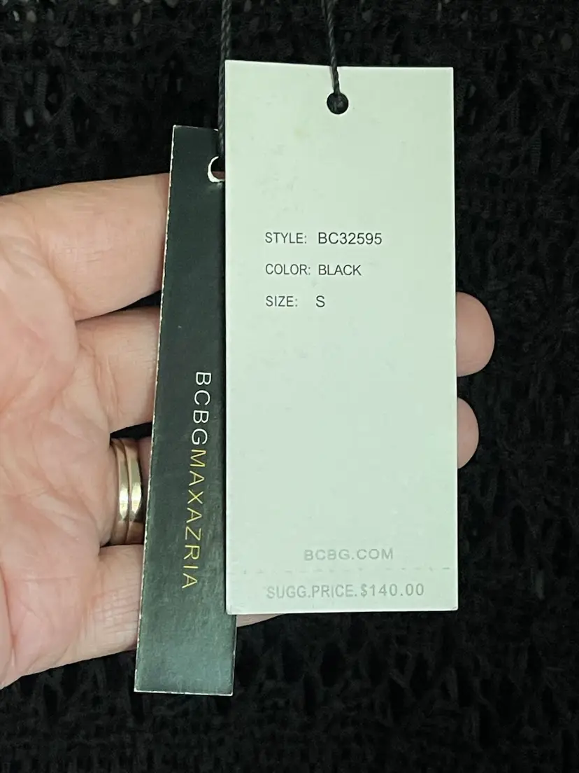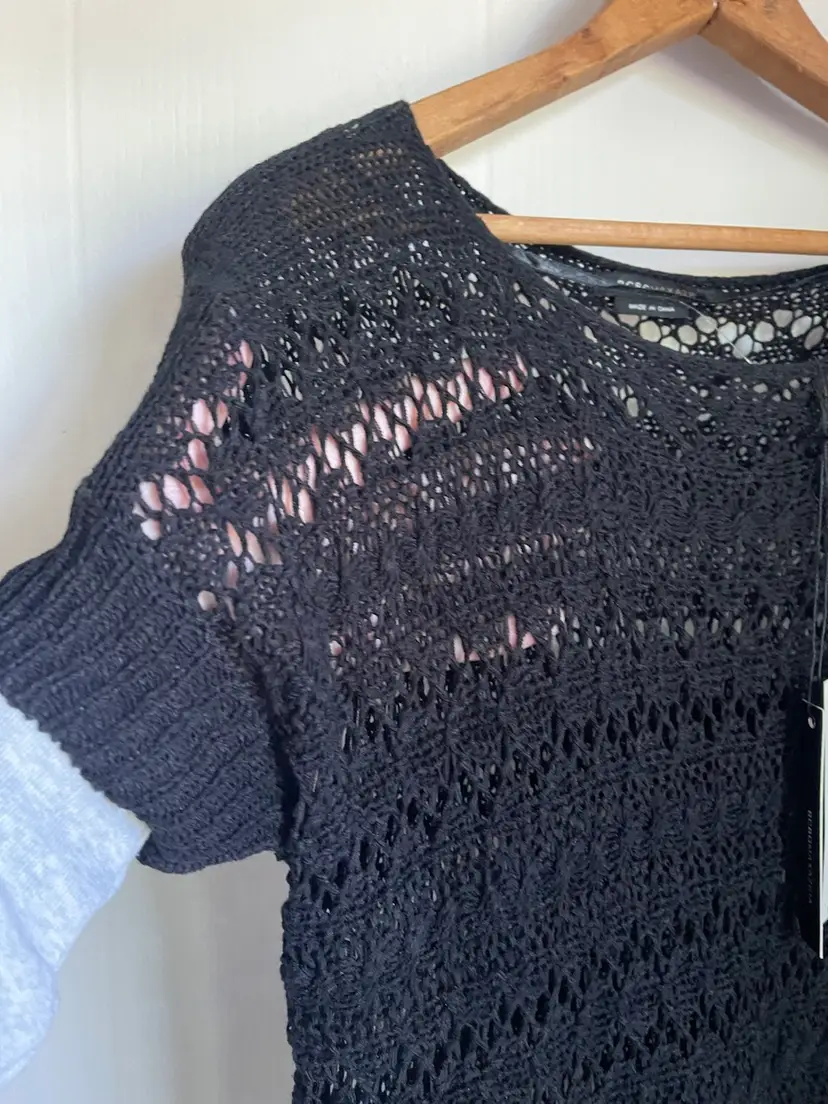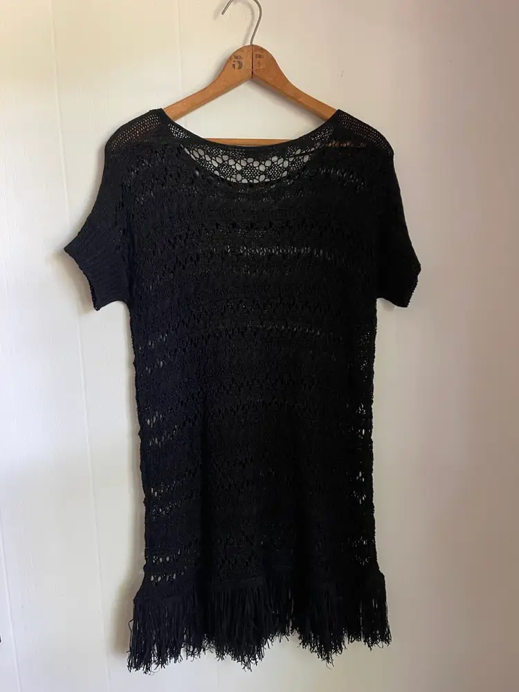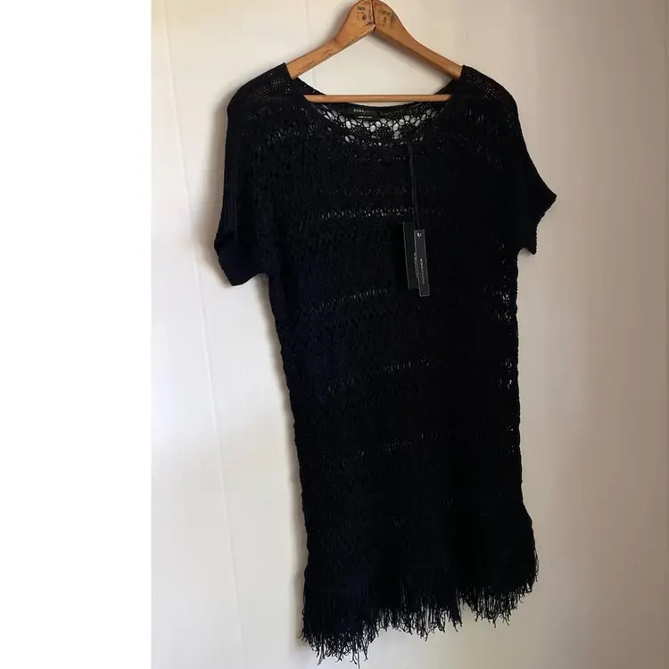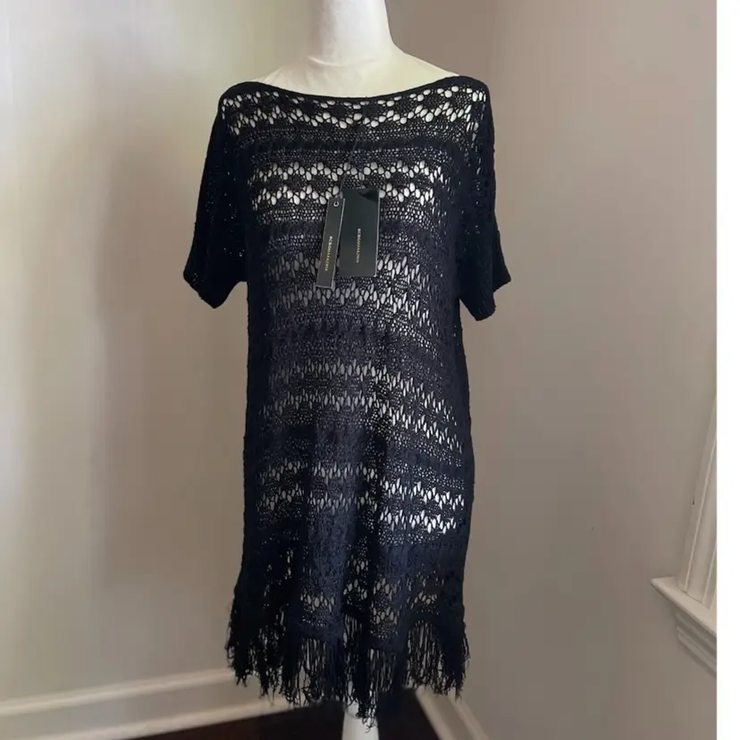 BCBG MaxAzria New With Tags MSRP $140 Crochet Knit Open Weave Pullover Cover up Dress Fringe Hem Size Small Short Sleeve Hand Wash Only 60 Acrylic/40 Nylon Lightweight Some Stretch